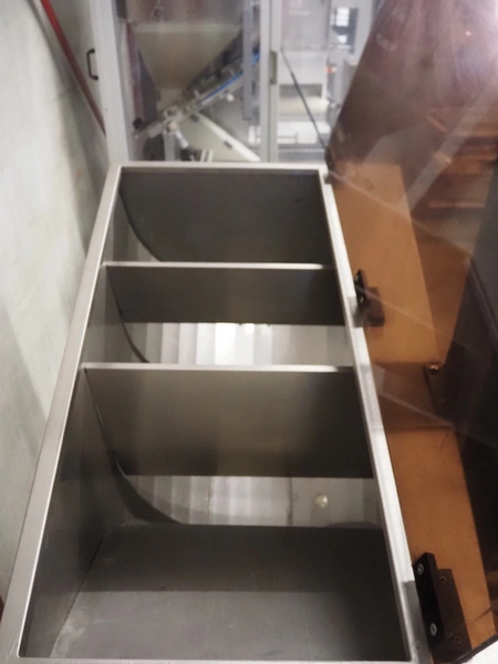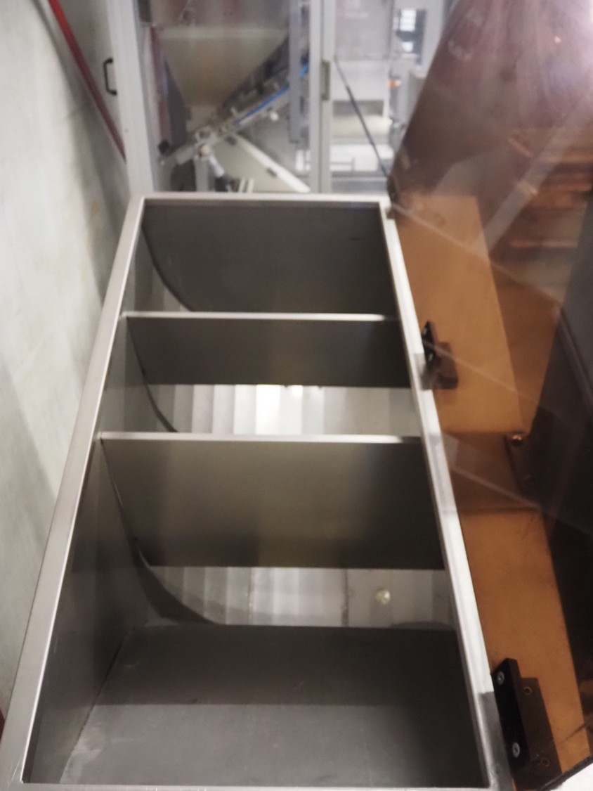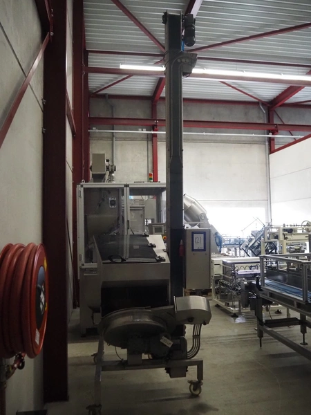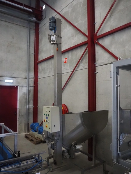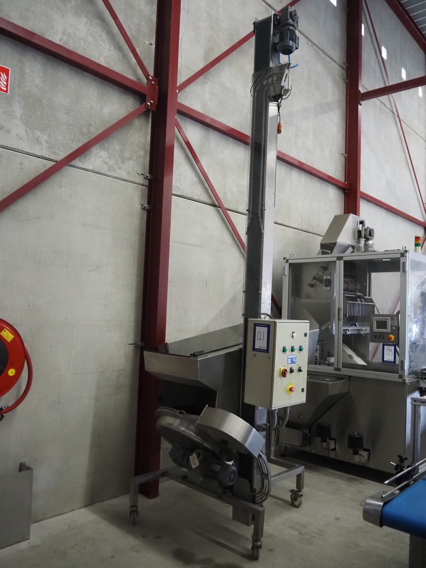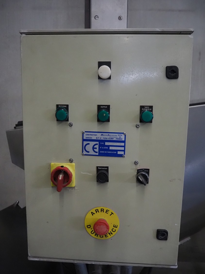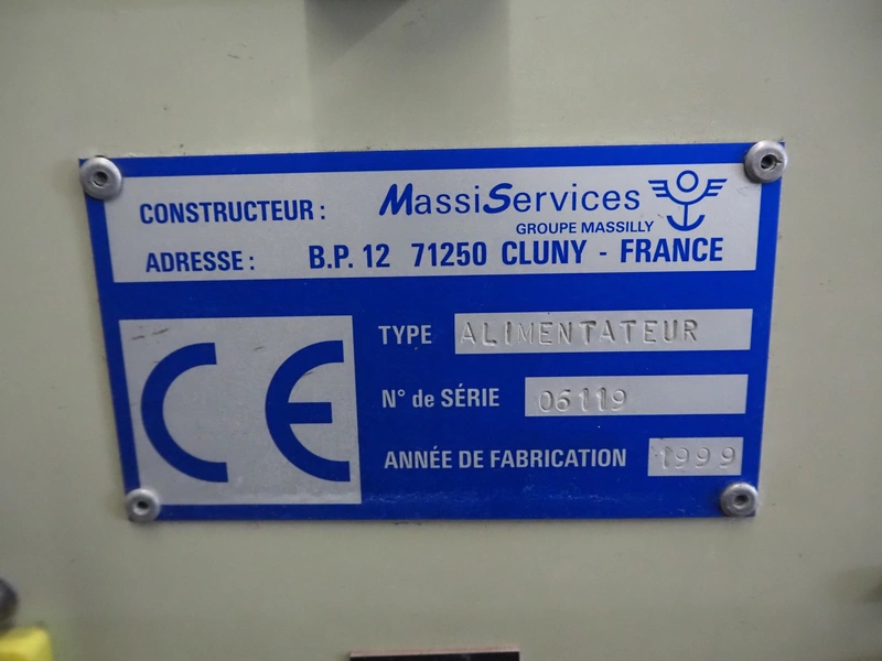 Massi Services mobile cap feeder with magnetic elevating belt, type: Alimentateur, serial number: 06119, year of construction: 1999, inside dimensions bunker: 650 mm x 1300 mm x 500 mm, clearance: 55 mm x 15 mm, elevating height: 3600 mm, total dimensions: 1200 mm x 1500 mm x 4000 mm.
