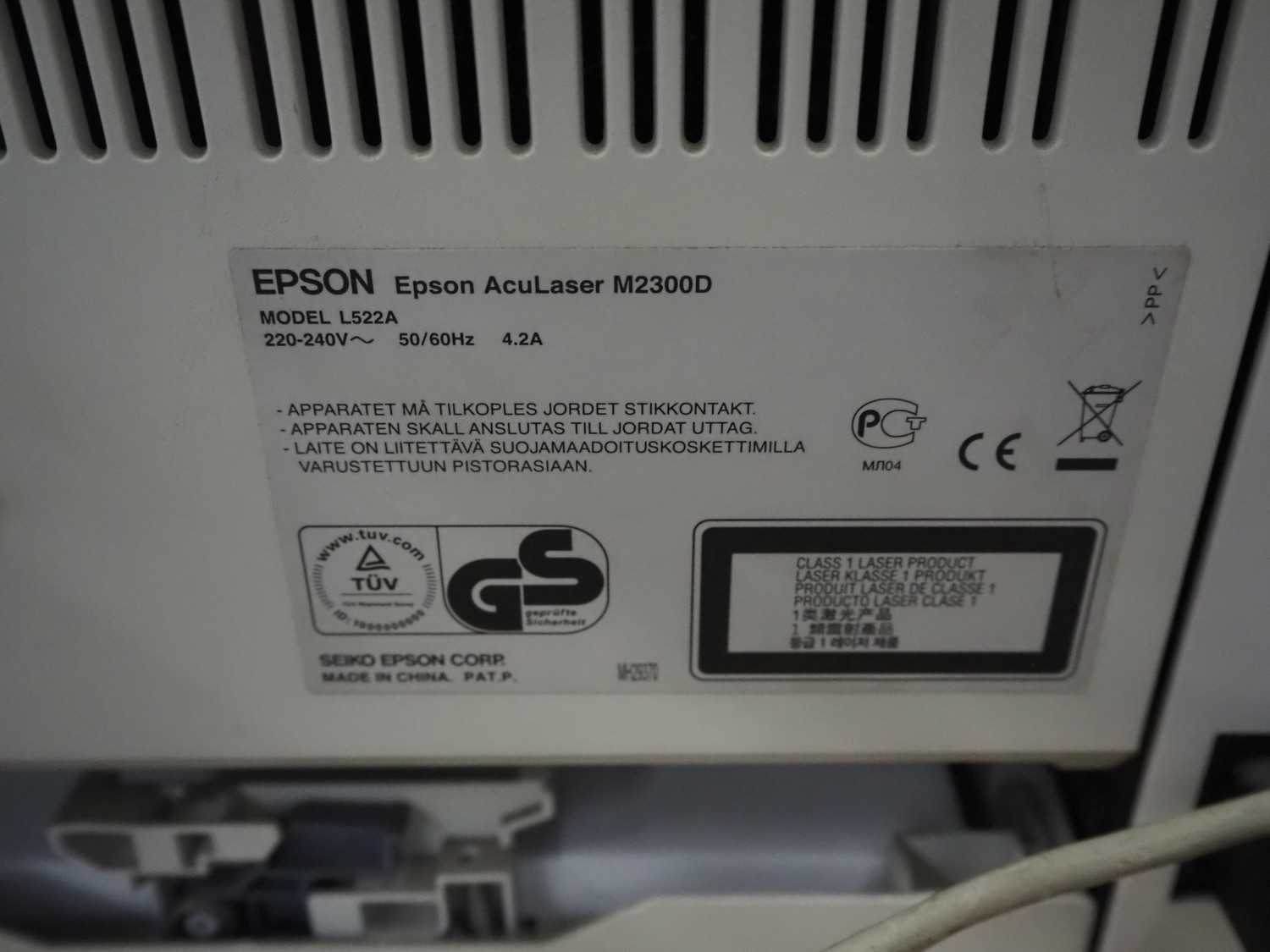 Epson printer, model: L522A, 220-240 v, 50/60 Hz, 4.2 A, dimensions: 380 mm x 400 mm x 250 mm.