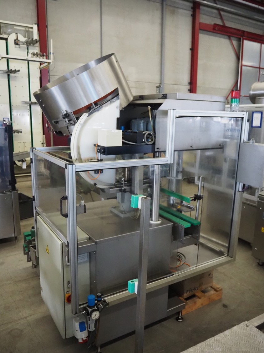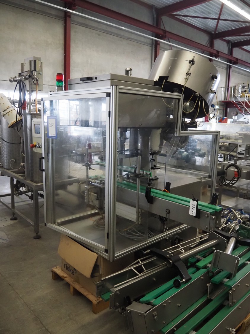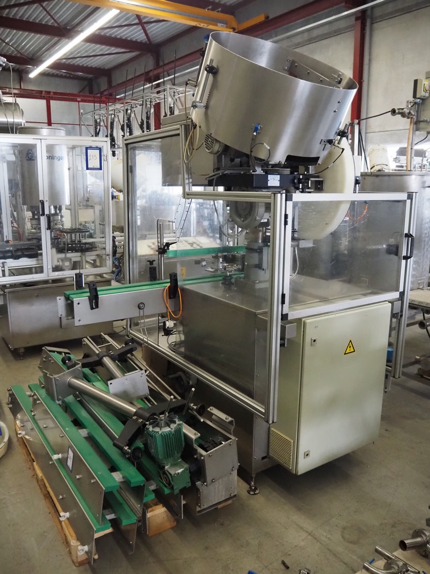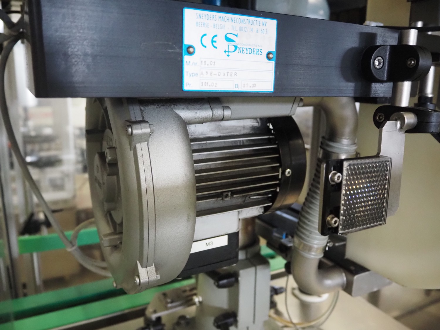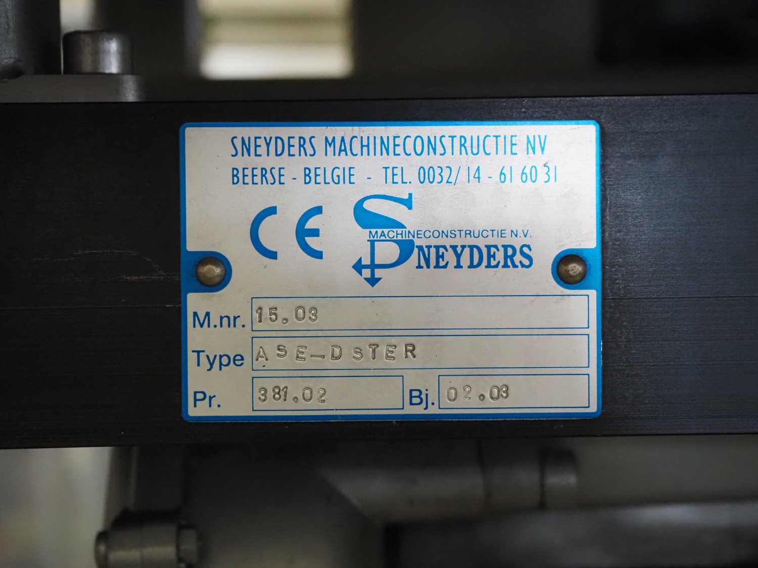 Sneyders capping machine, type: ASE-DSTER, machine number: 15.03, year of construction: 02.03, Ø caps: 60 mm, total dimensions: 1800 mm x 1600 mm x 2300 mm. Including pallet with frames for transport belts and pallet with transport belt, belt width: 150 mm. Missing cap grabber.