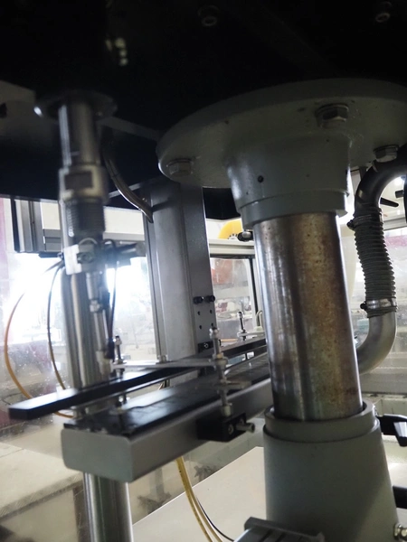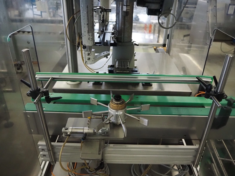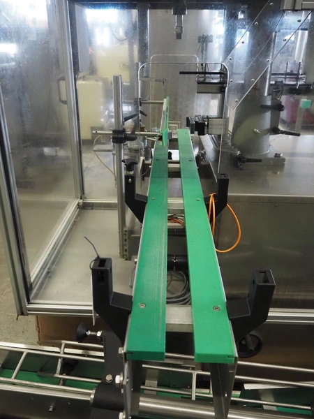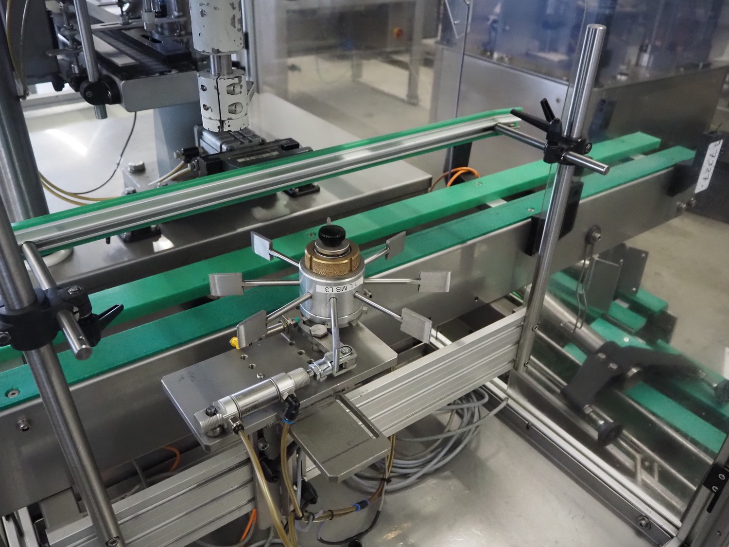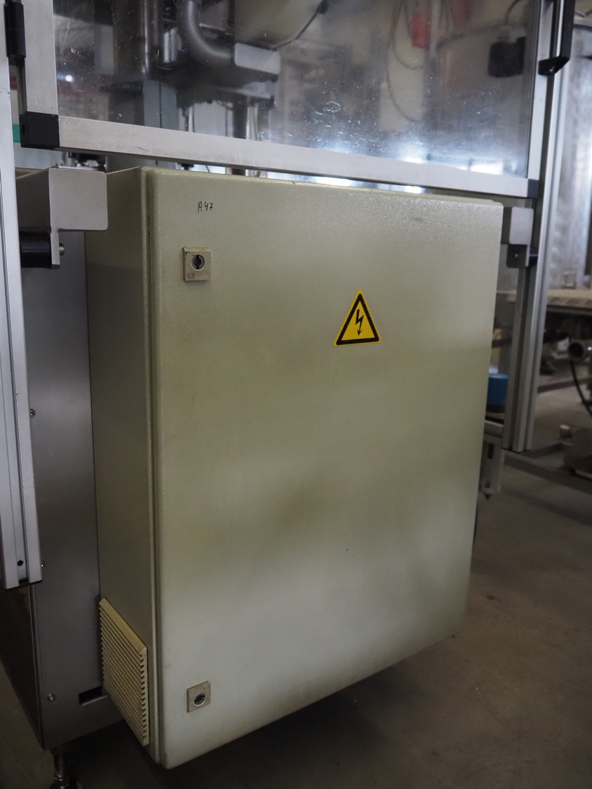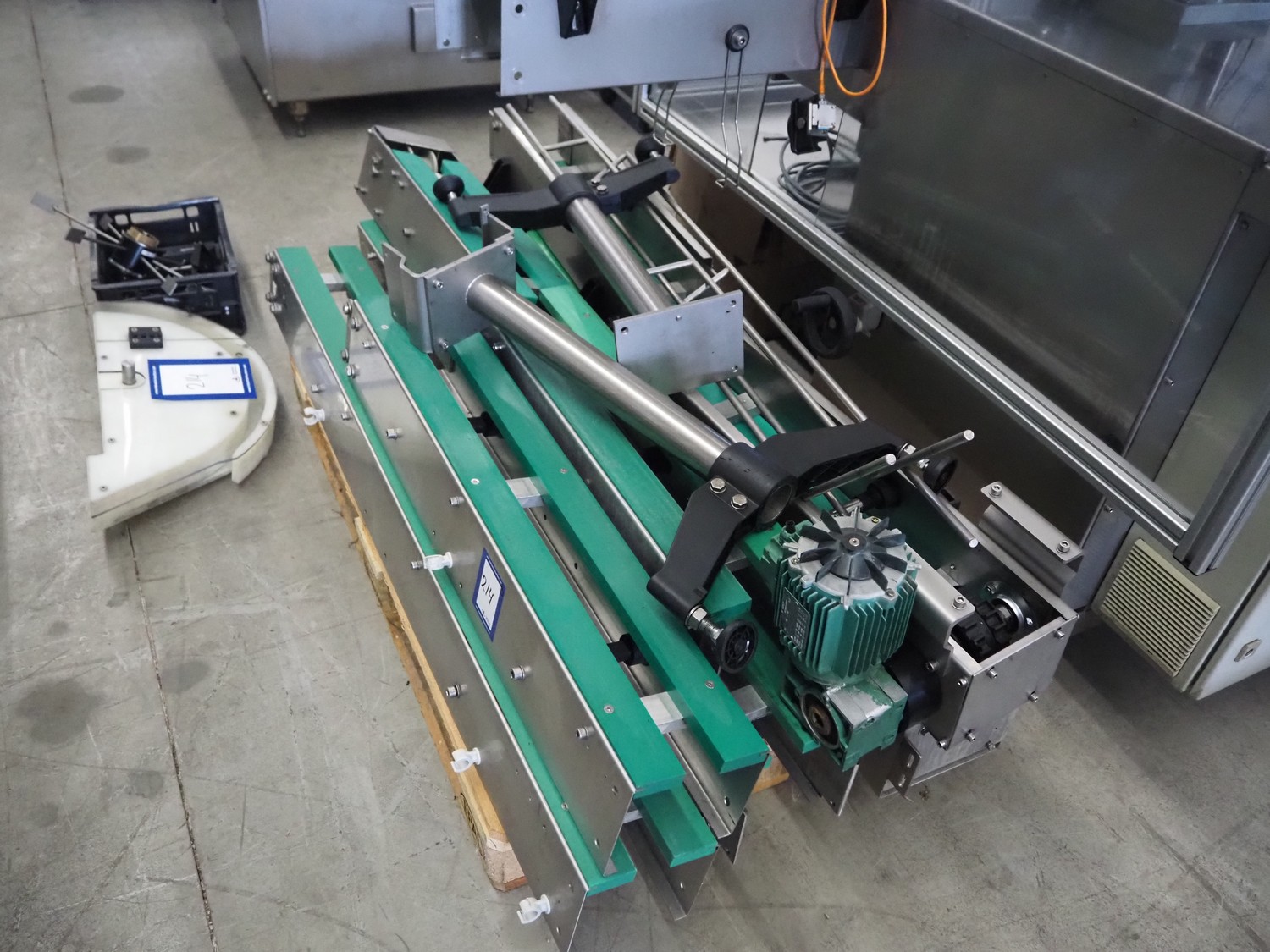 Sneyders capping machine, type: ASE-DSTER, machine number: 15.03, year of construction: 02.03, Ø caps: 60 mm, total dimensions: 1800 mm x 1600 mm x 2300 mm. Including pallet with frames for transport belts and pallet with transport belt, belt width: 150 mm. Missing cap grabber.