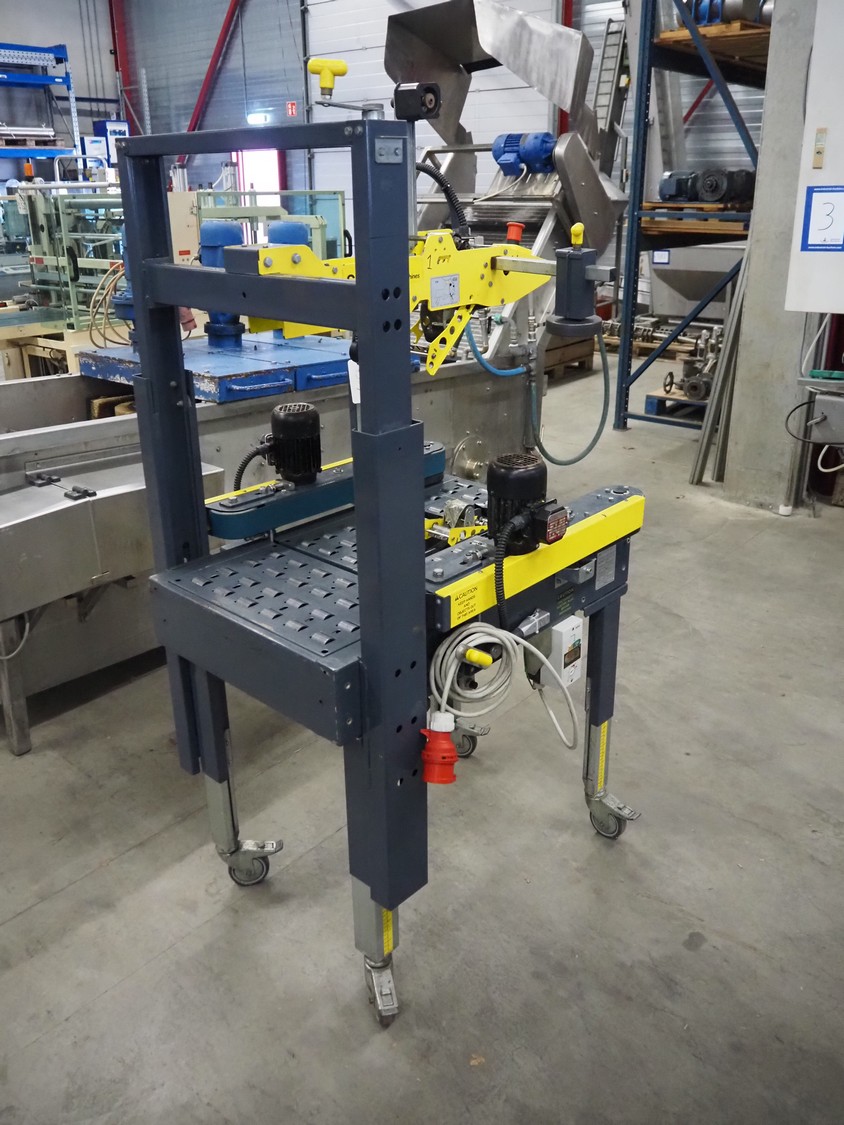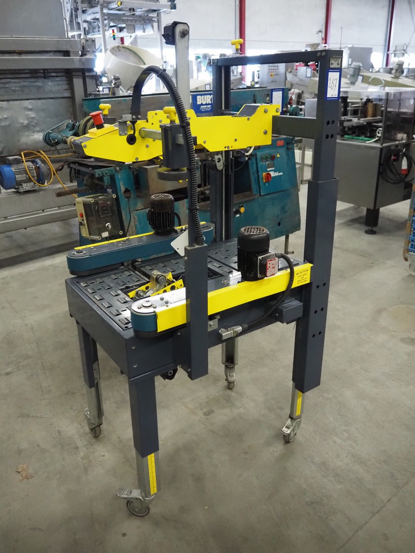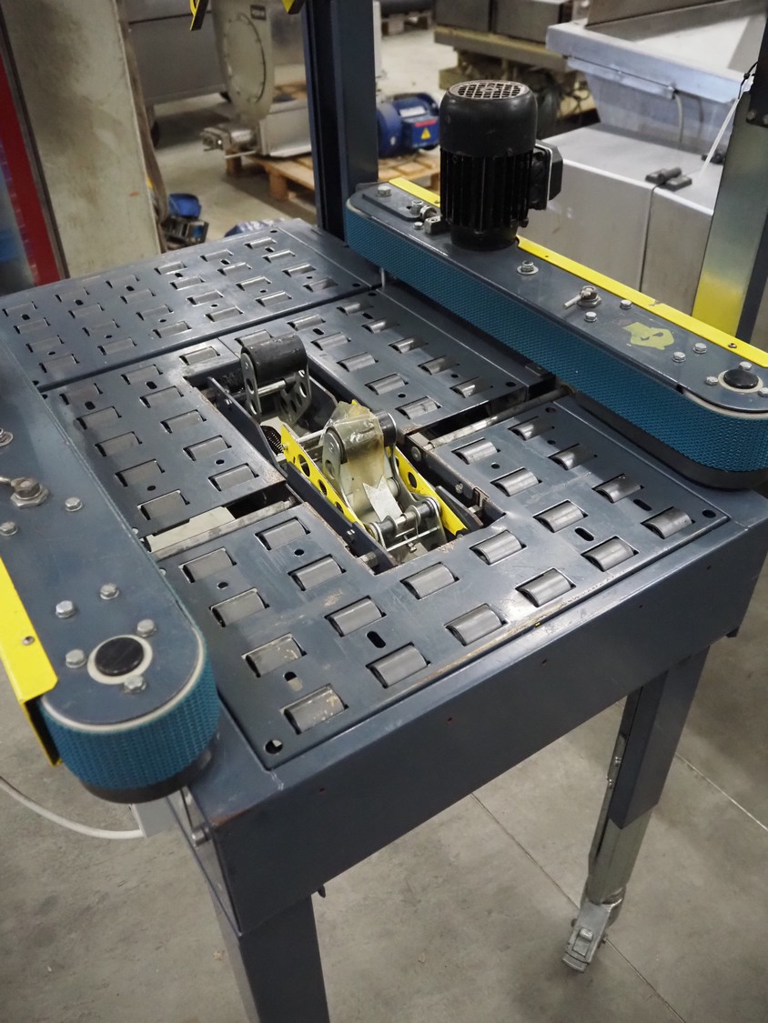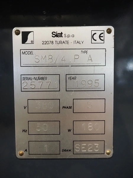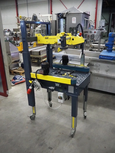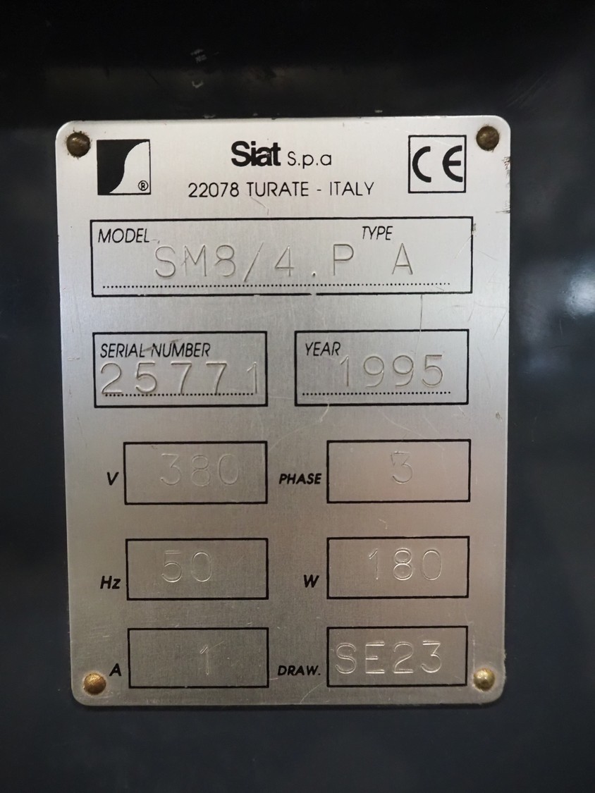 Siat S.p.a mobile box closing machine, model: SM8/4.P, type: A, serial number: 25771, year of construction: 1995, 380 V, 3 Ph, 50 Hz, 1 A, 180 W, maximum clearance: 490 mm x 400 mm, total dimensions: 920 mm x 850 mm x 1750 mm.