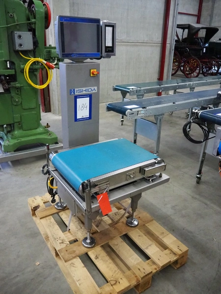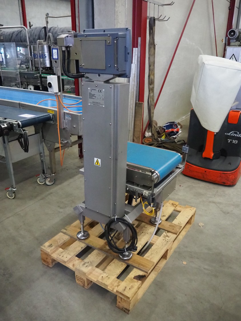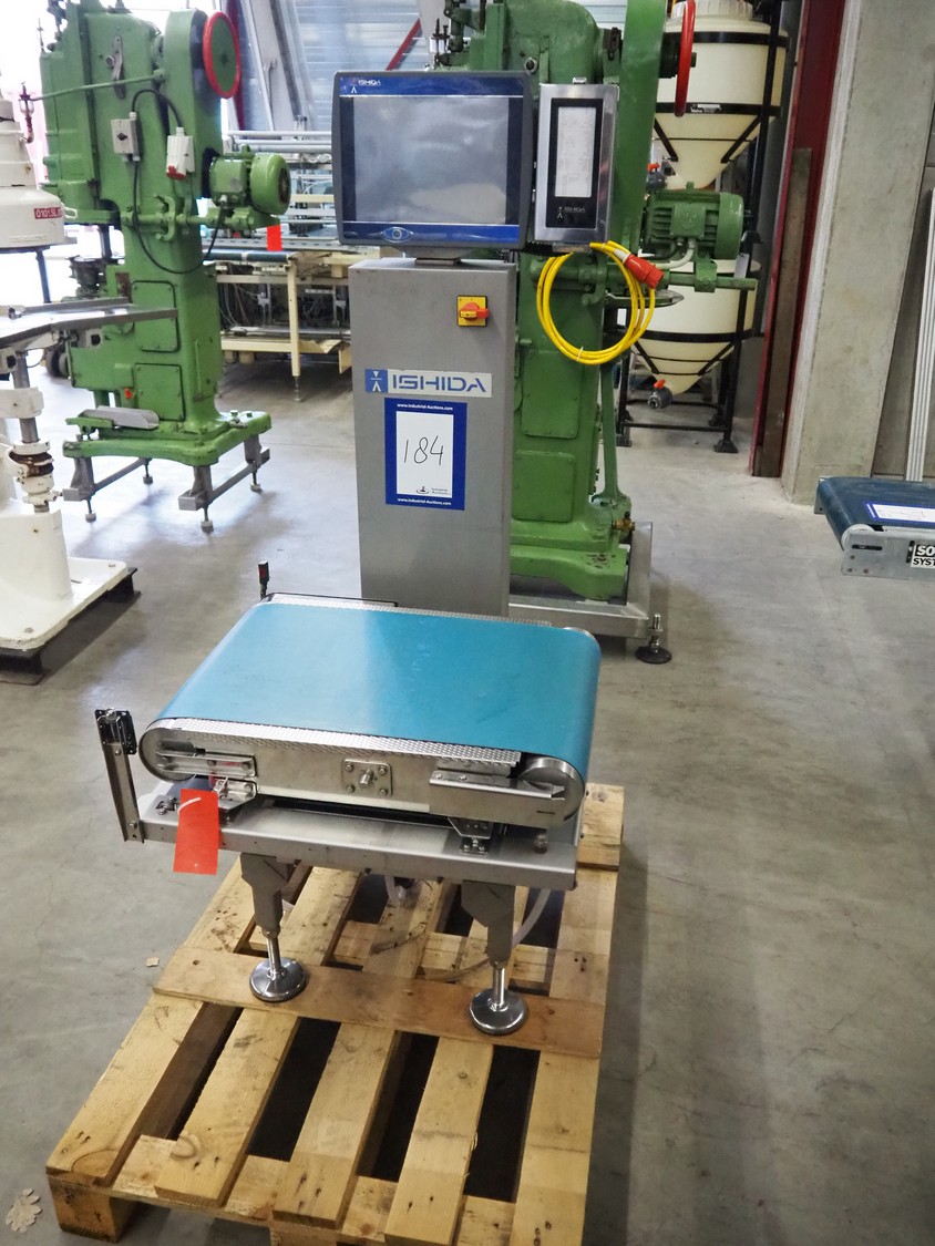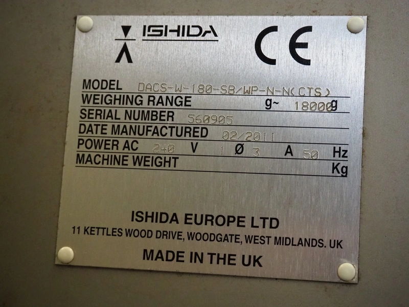 Ishida checkweigher, model: DACS-W-180-SB/WP-N-N (CTS), serial number: 560905, year of construction: 02/2011, 240 V, 1 Ph, 50 Hz, 3 A, maximum weight: 18000 gram, plastic belt, belt width: 400 mm, total dimensions: 780 mm x 650 mm x 1490 mm.