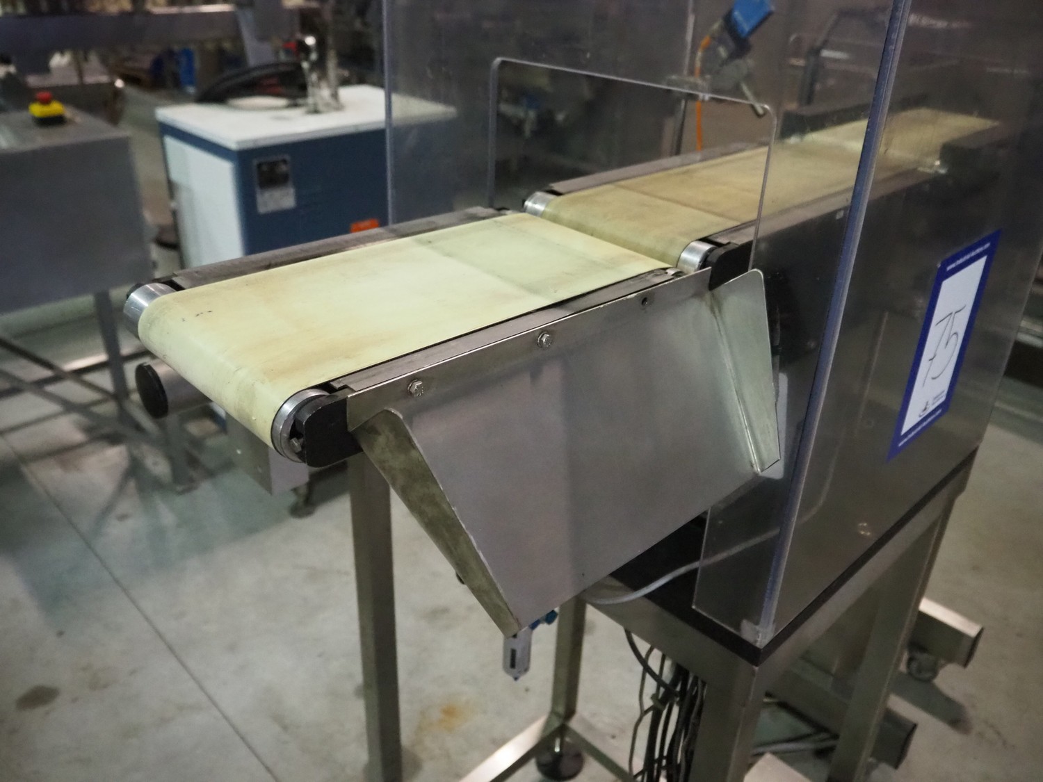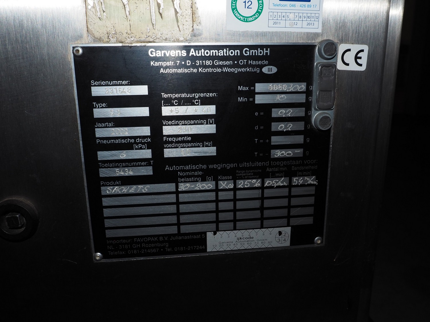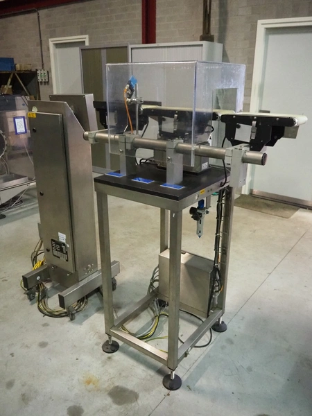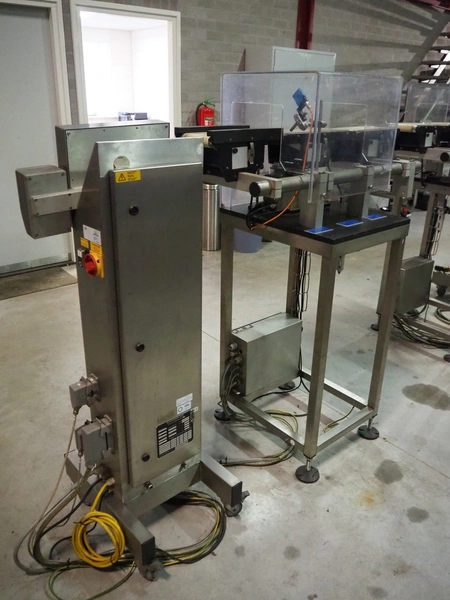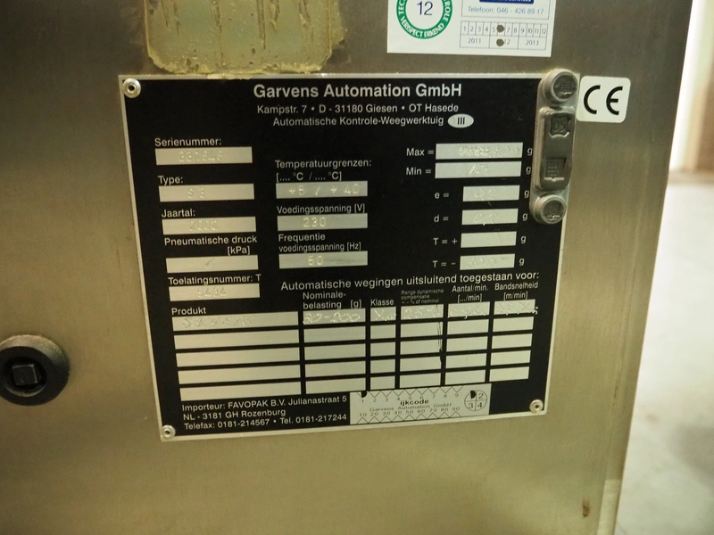Mettler Toledo Garvens Automation GmbH checkweigher, type: S3, serial number: 331648, year of construction: 2002, 230 V, 50 Hz, max: 300 gram, min: 10 gram, e= 0.2 gram, T= -300 gram, dimensions scale: 430 mm x 150 mm, plastic belt, belt width: 150 mm, dimensions checkweigher: 1140 mm x 610 mm x 1610 mm, dimensions control panel: 580 mm x 440 mm x 1400 mm.