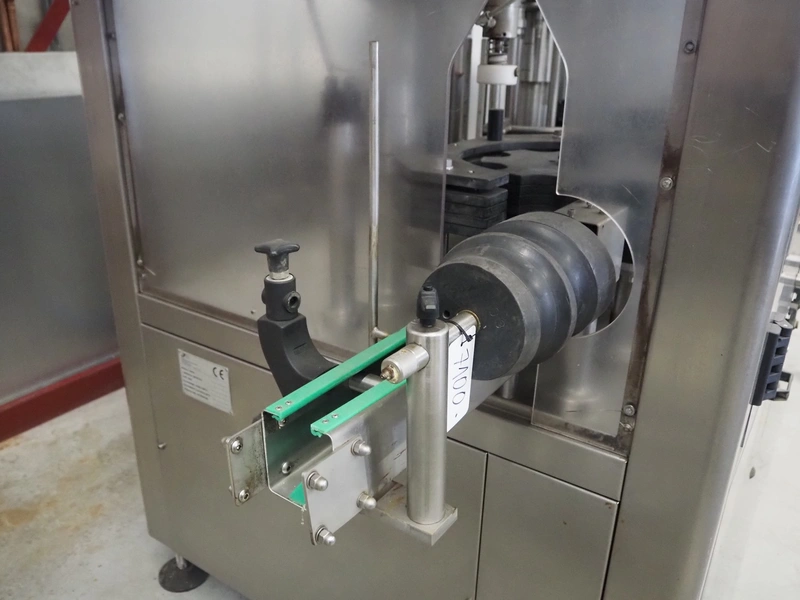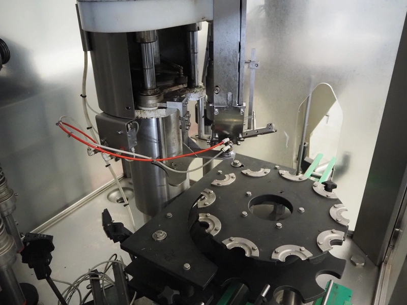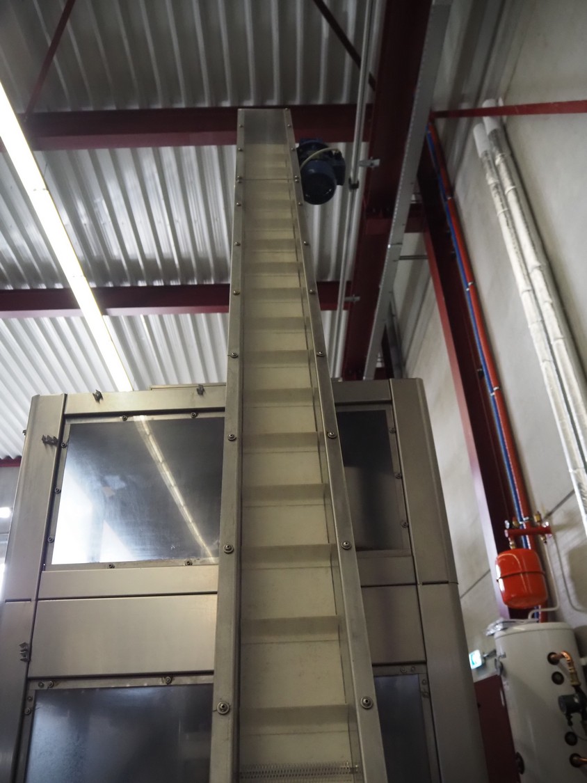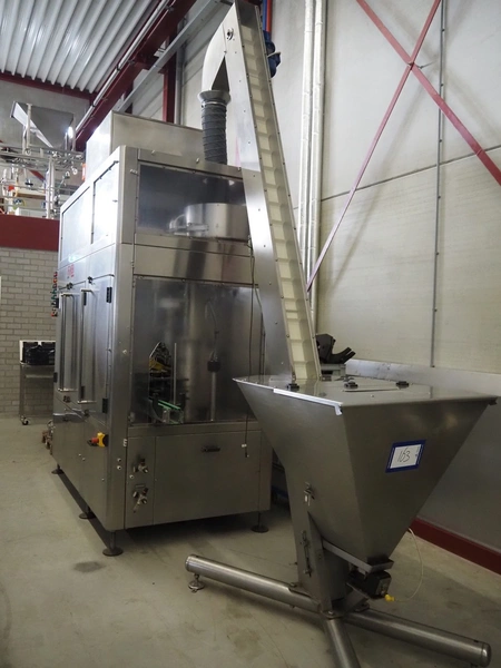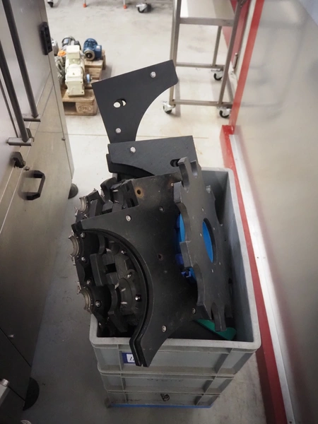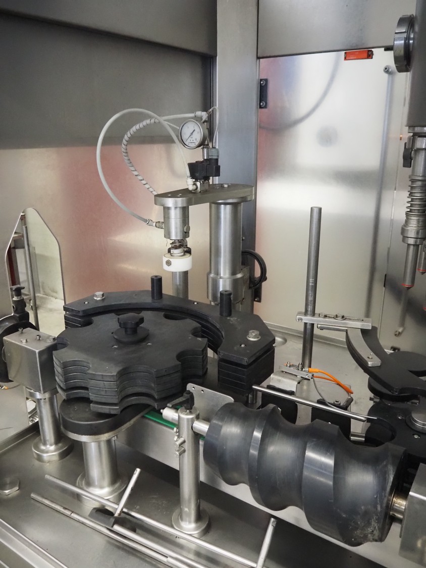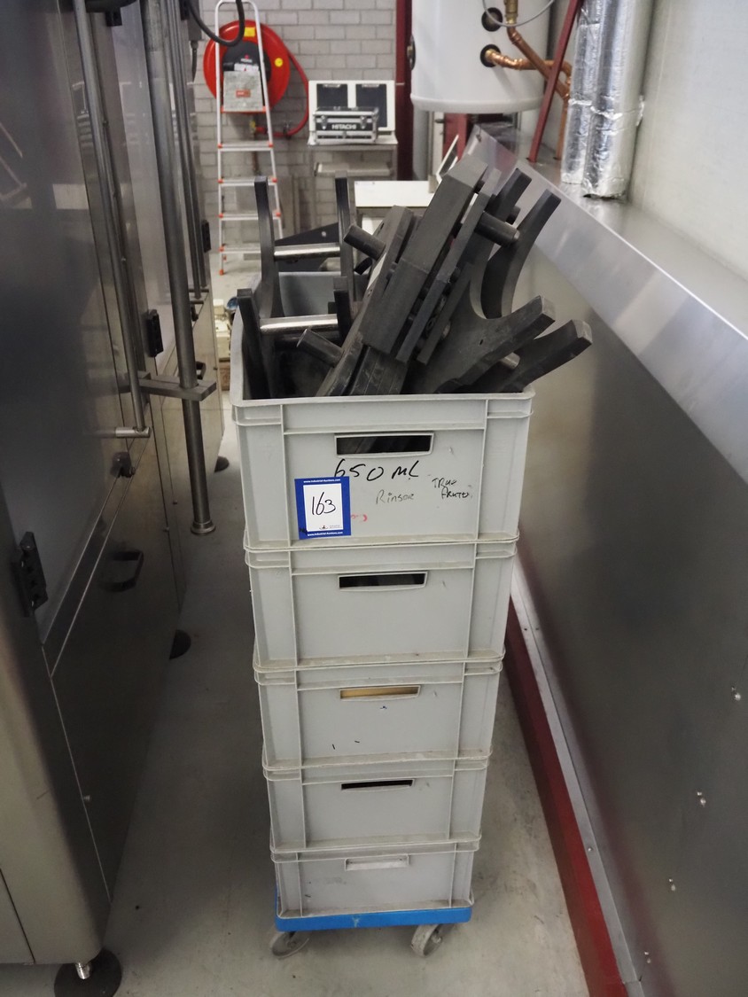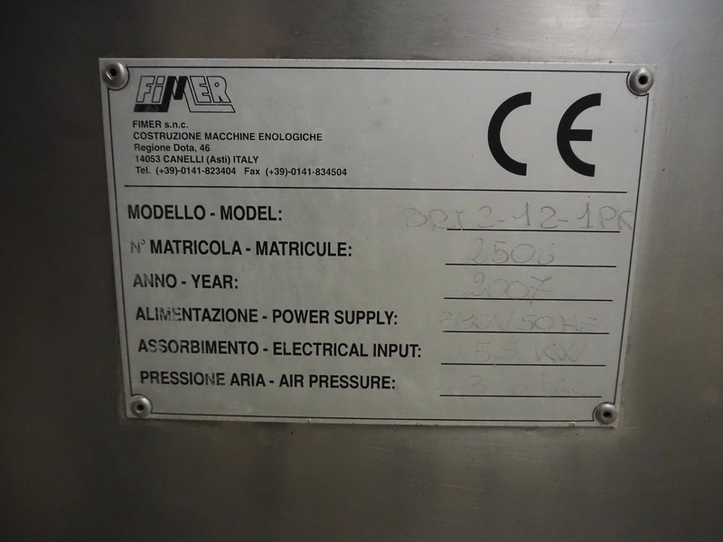 Fimer S.N.C. monoblock filler for liquids with 12 filling heads and bottle closer, model: DRT 2-12-1PK, serial number: 2506, year of construction: 2007, 380 V, 50 Hz, 5.5 kW, 3-6 bar, input bottle: 9 mm, Canelli Tech srl. elevating belt with dividers, model: VB-CAP, serial number: A07000600, year of construction: 2007, 400 V, 50 Hz, 0.37 kW, s/s frame, plastic belt with dividers, belt width: 150 mm, distance between dividers: 130 mm, elevating height: 3500 mm, total dimensions: 2800 mm x 1420 mm x 3350 mm. Including 2 trolleys with 6 crates of parts.