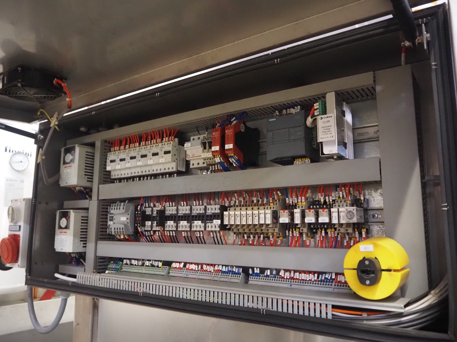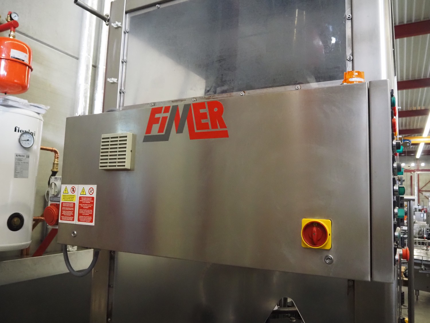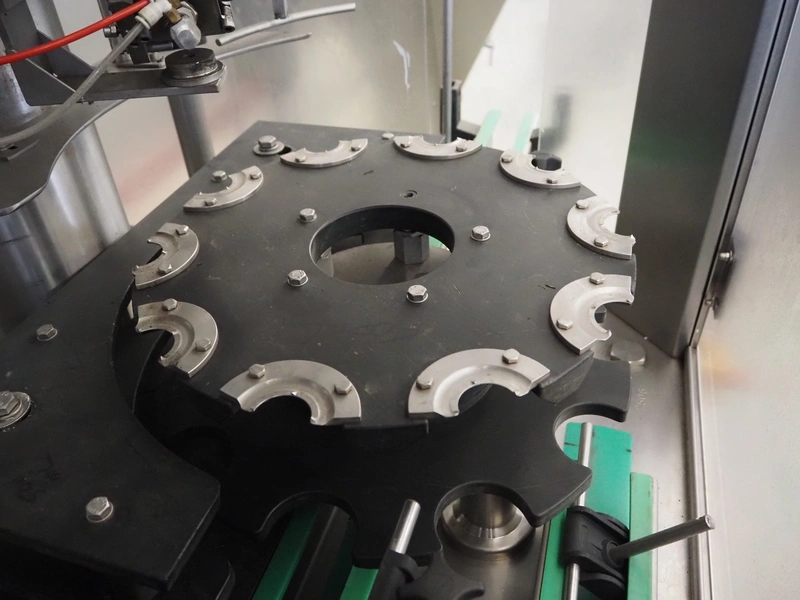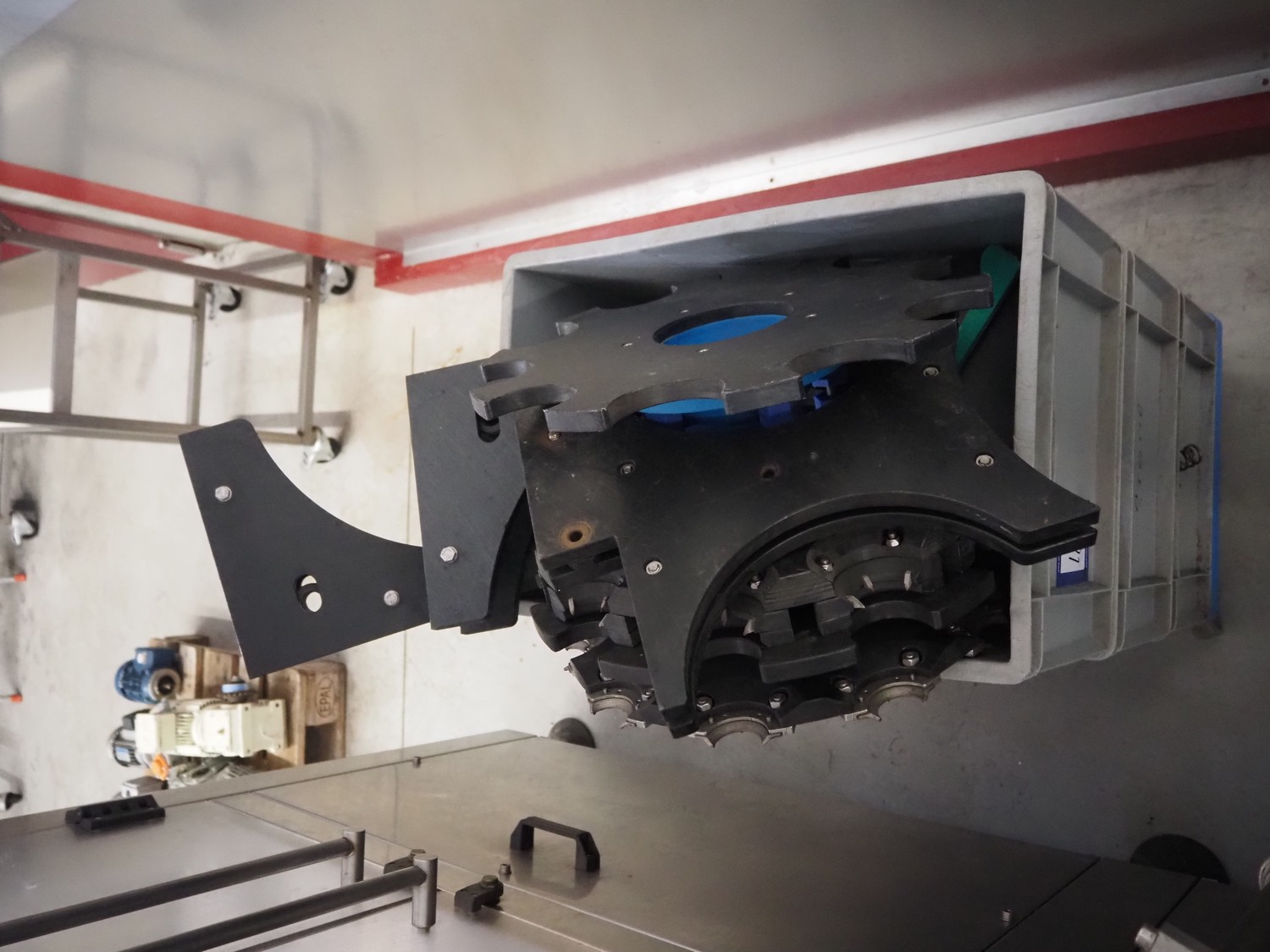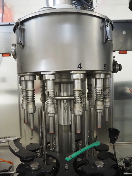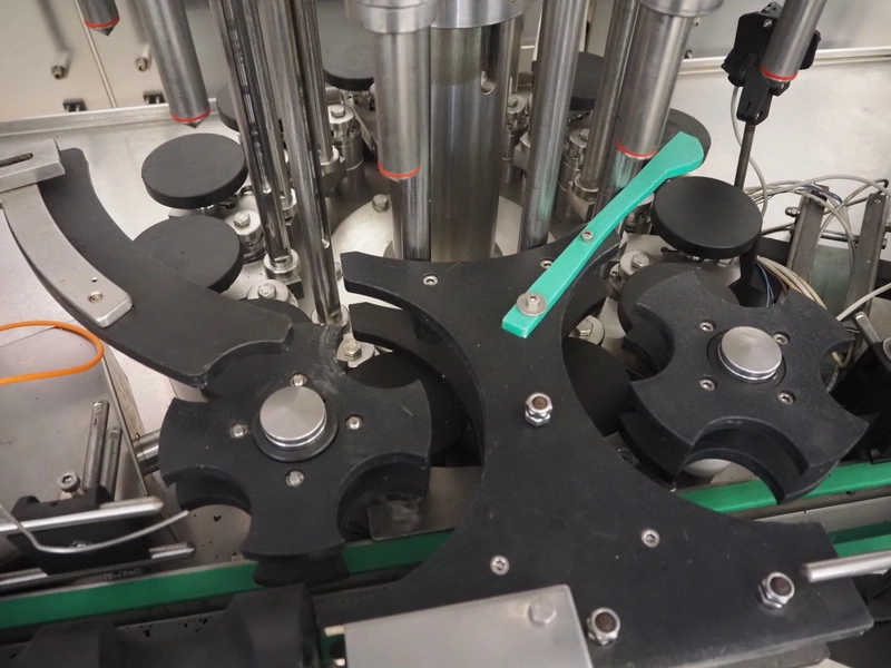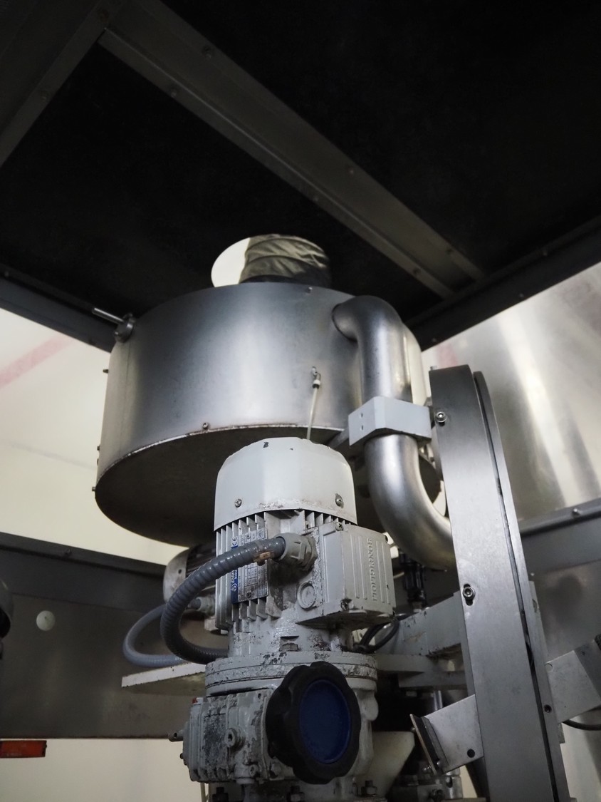 Fimer S.N.C. monoblock filler for liquids with 12 filling heads and bottle closer, model: DRT 2-12-1PK, serial number: 2506, year of construction: 2007, 380 V, 50 Hz, 5.5 kW, 3-6 bar, input bottle: 9 mm, Canelli Tech srl. elevating belt with dividers, model: VB-CAP, serial number: A07000600, year of construction: 2007, 400 V, 50 Hz, 0.37 kW, s/s frame, plastic belt with dividers, belt width: 150 mm, distance between dividers: 130 mm, elevating height: 3500 mm, total dimensions: 2800 mm x 1420 mm x 3350 mm. Including 2 trolleys with 6 crates of parts.