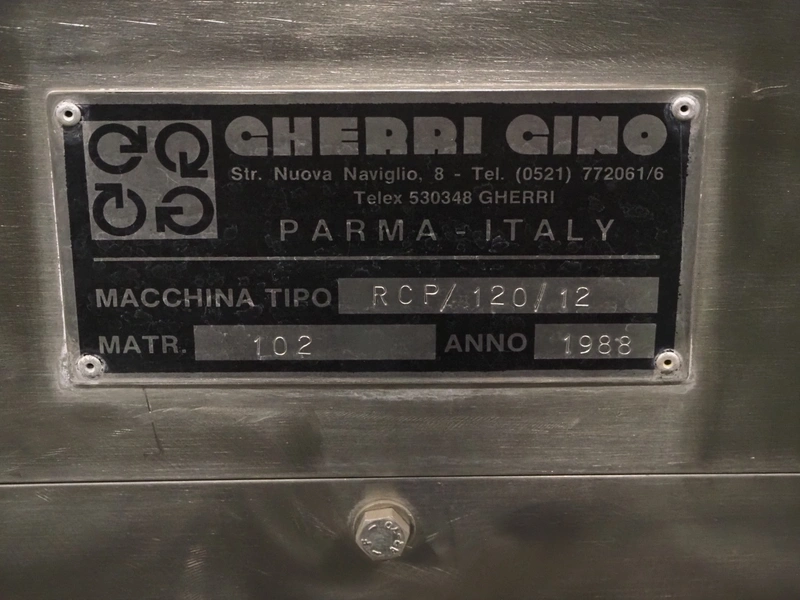 Gherri Gino pocket filler, type: RCP/120/12, serial number: 102, year of construction: 1988, 12 heads, diameter: 85 mm, total dimensions: 1850 mm x 1900 mm x 1900 mm.