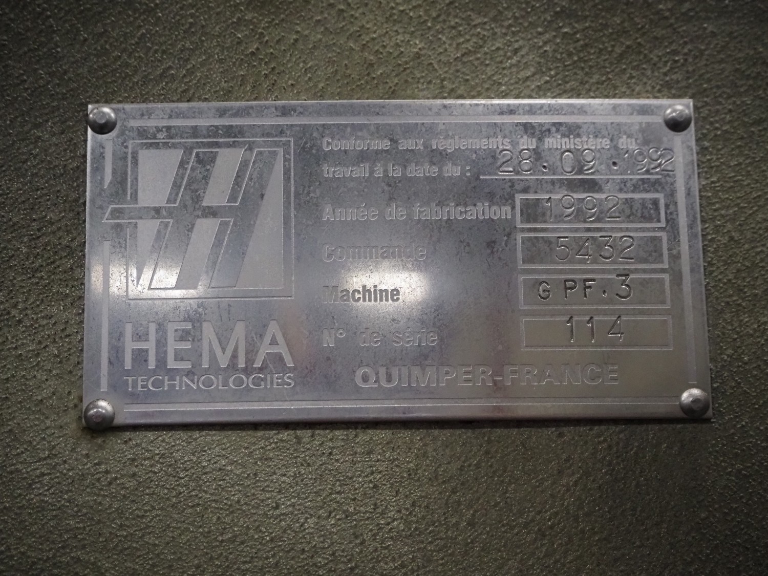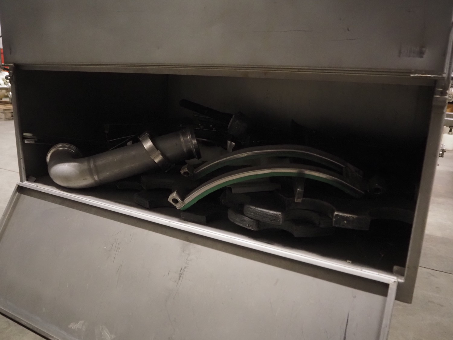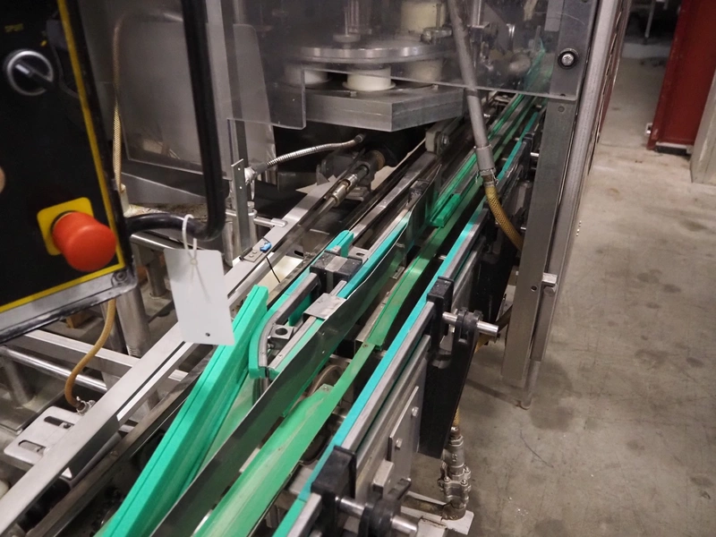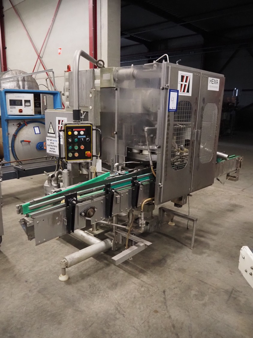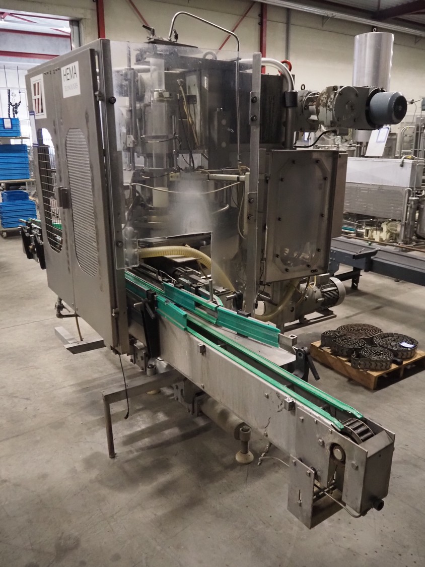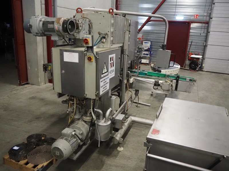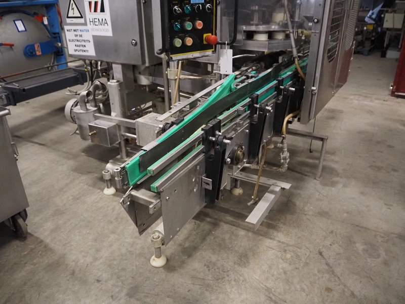 Hema Technologies volumetric inline can filler, machine: GPF.3, serial number: 114, year of construction: 1992, 6 filling heads, plastic belt width: 80 mm, diameter cans: 73 mm, total dimensions machine: 2600 mm x 2400 mm x 2200 mm, including J. Legendre outfeed belt used for cans, s/s frame, s/s belt, belt width: 80 mm, total dimensions outfeed belt: 6600 mm x 350 mm x 1750 mm, s/s trolley with spare parts, dimensions trolley: 1270 mm x 770 mm x 1100 mm.