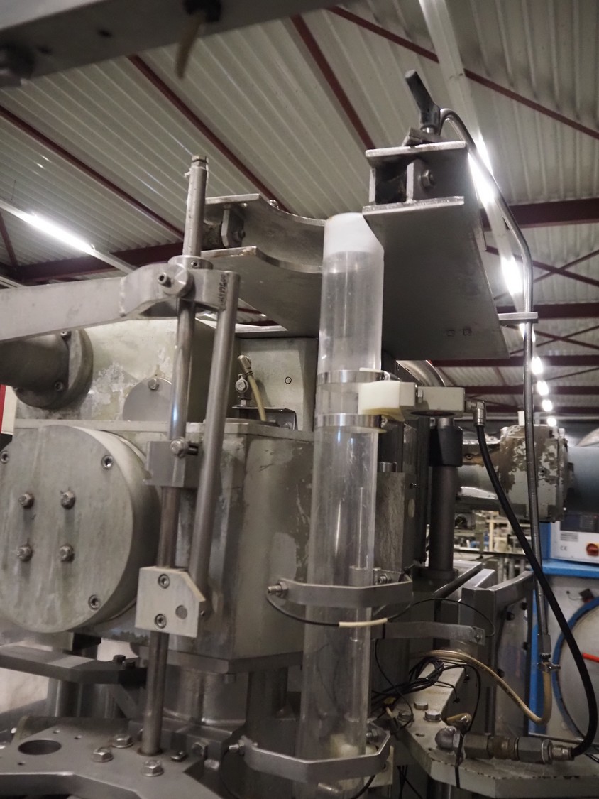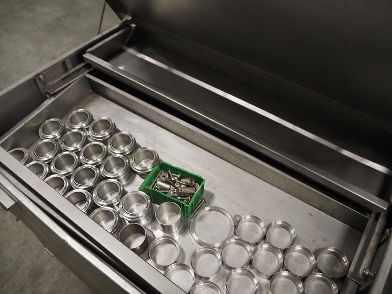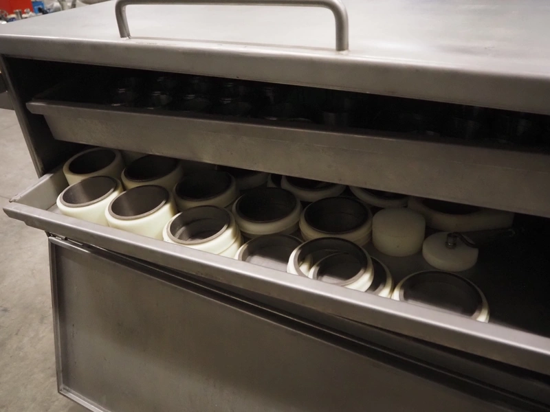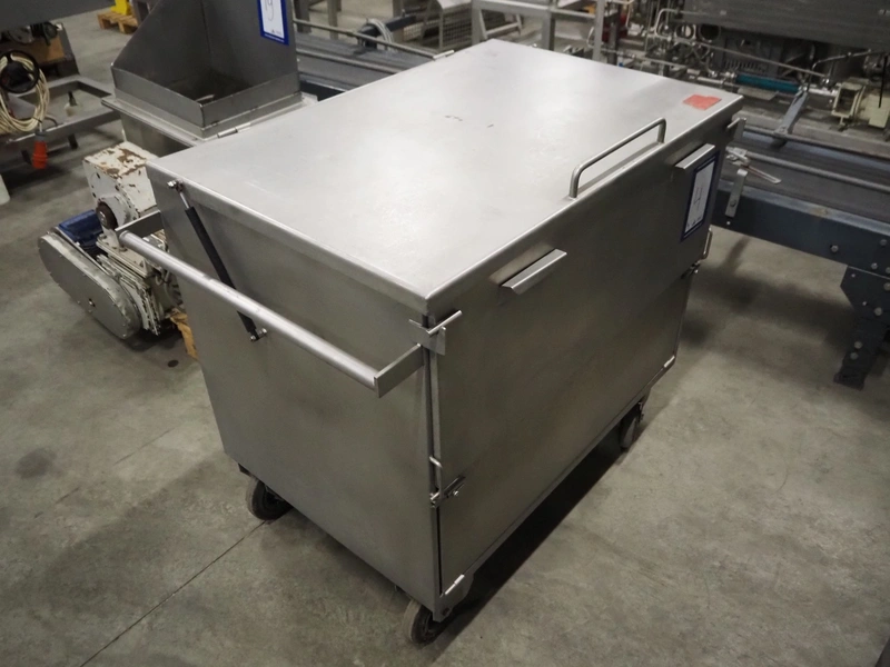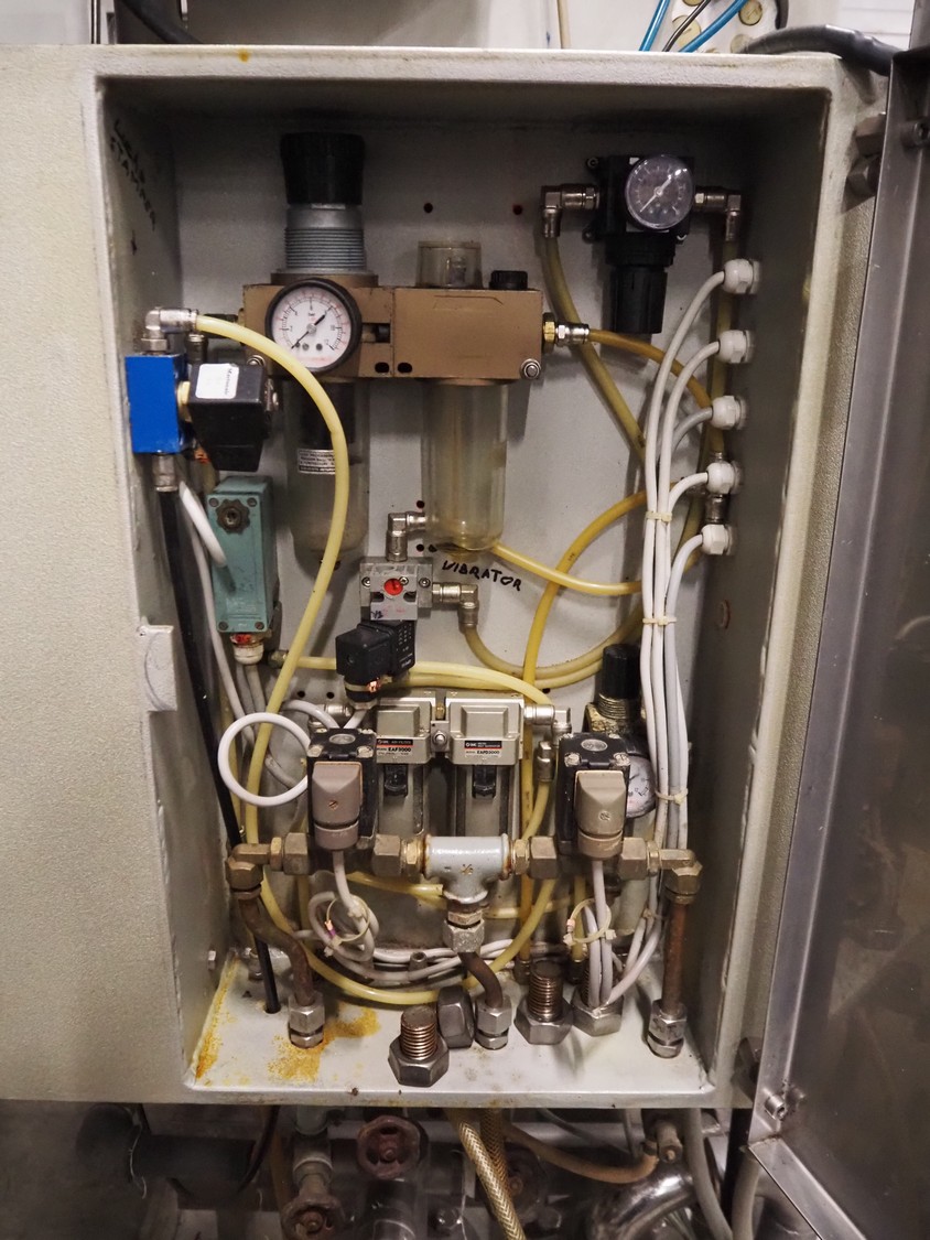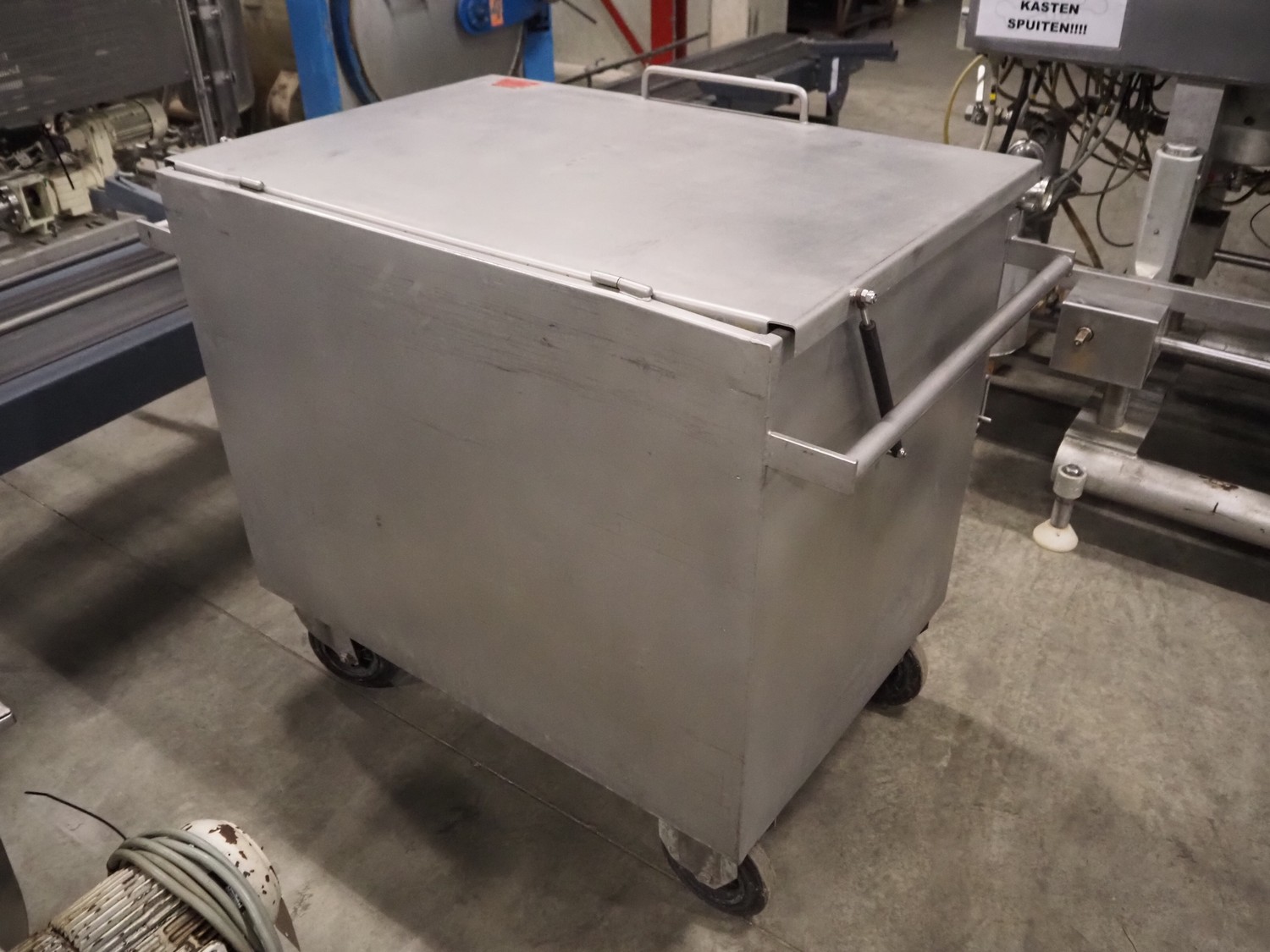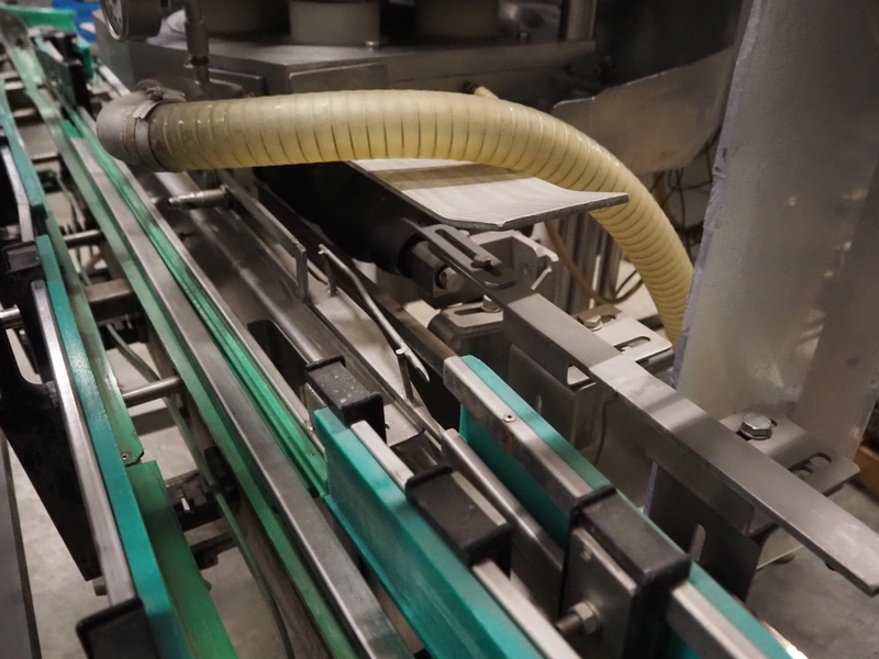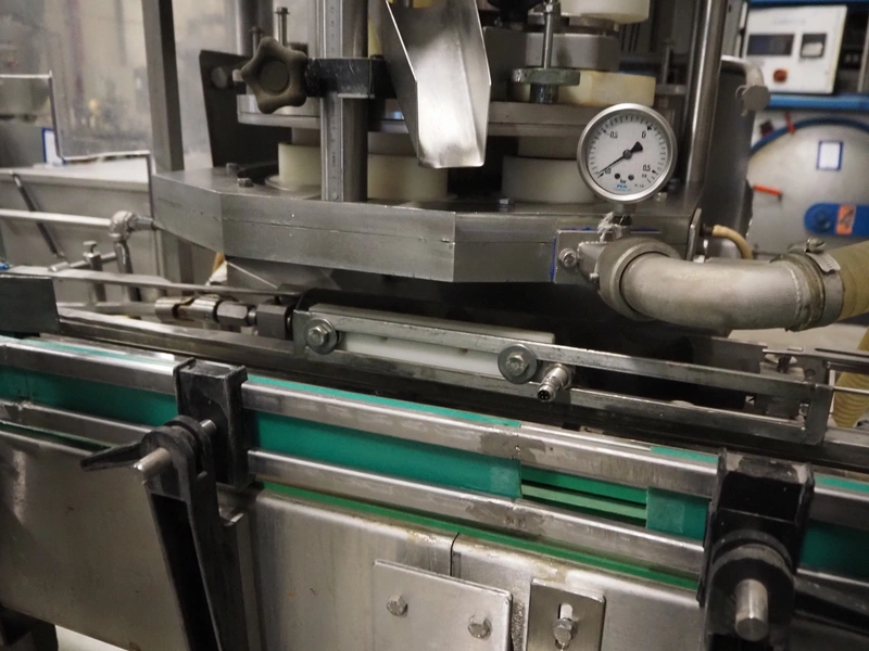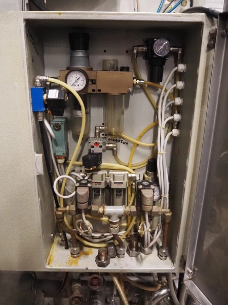 Hema Technologies volumetric inline can filler, machine: GPF.3, serial number: 114, year of construction: 1992, 6 filling heads, plastic belt width: 80 mm, diameter cans: 73 mm, total dimensions machine: 2600 mm x 2400 mm x 2200 mm, including J. Legendre outfeed belt used for cans, s/s frame, s/s belt, belt width: 80 mm, total dimensions outfeed belt: 6600 mm x 350 mm x 1750 mm, s/s trolley with spare parts, dimensions trolley: 1270 mm x 770 mm x 1100 mm.