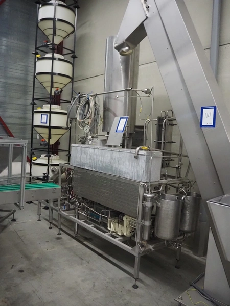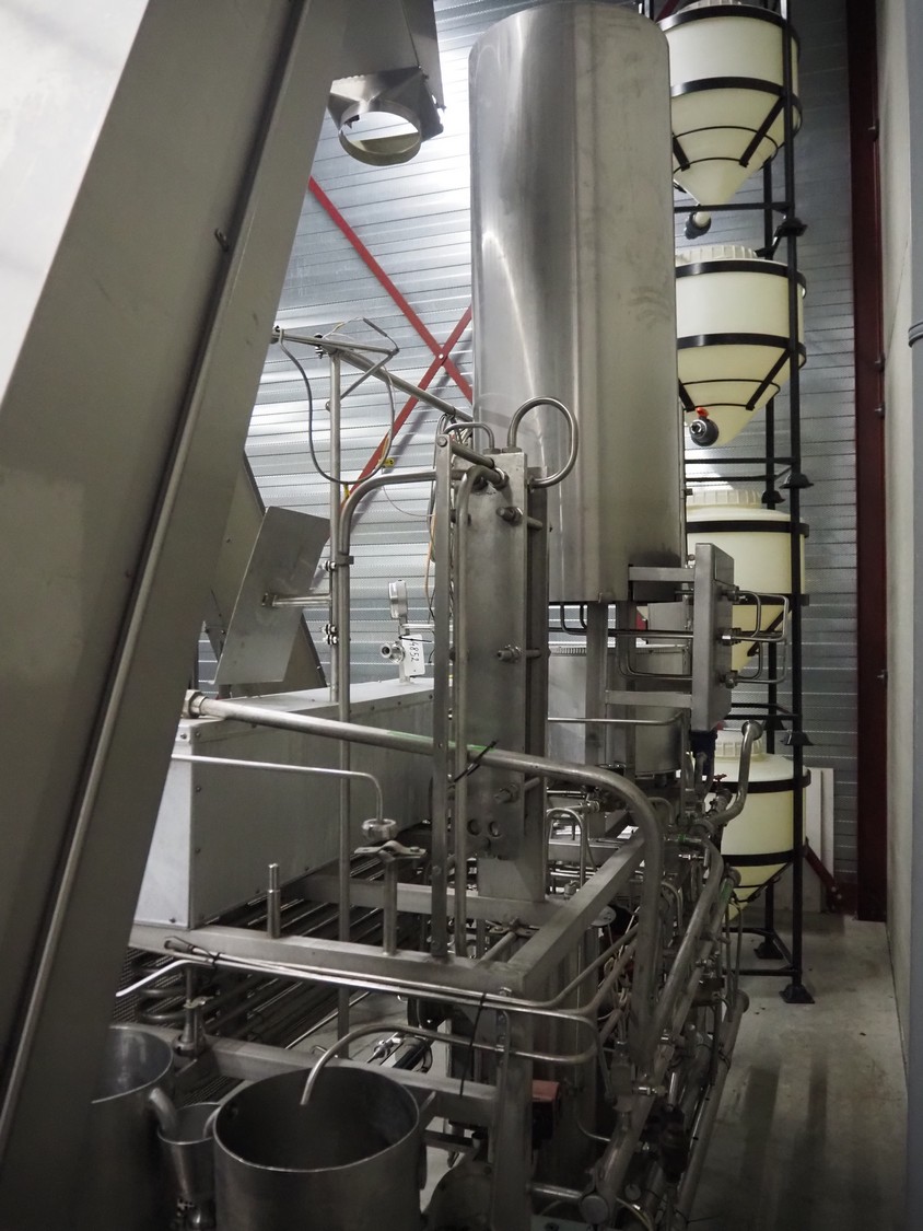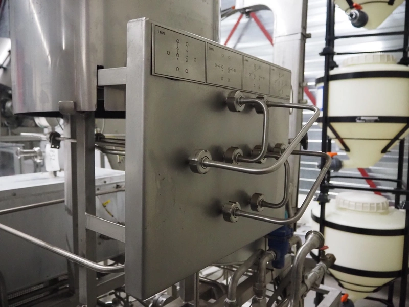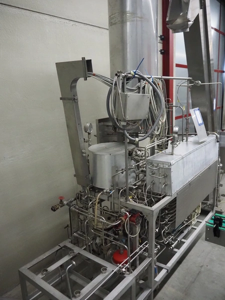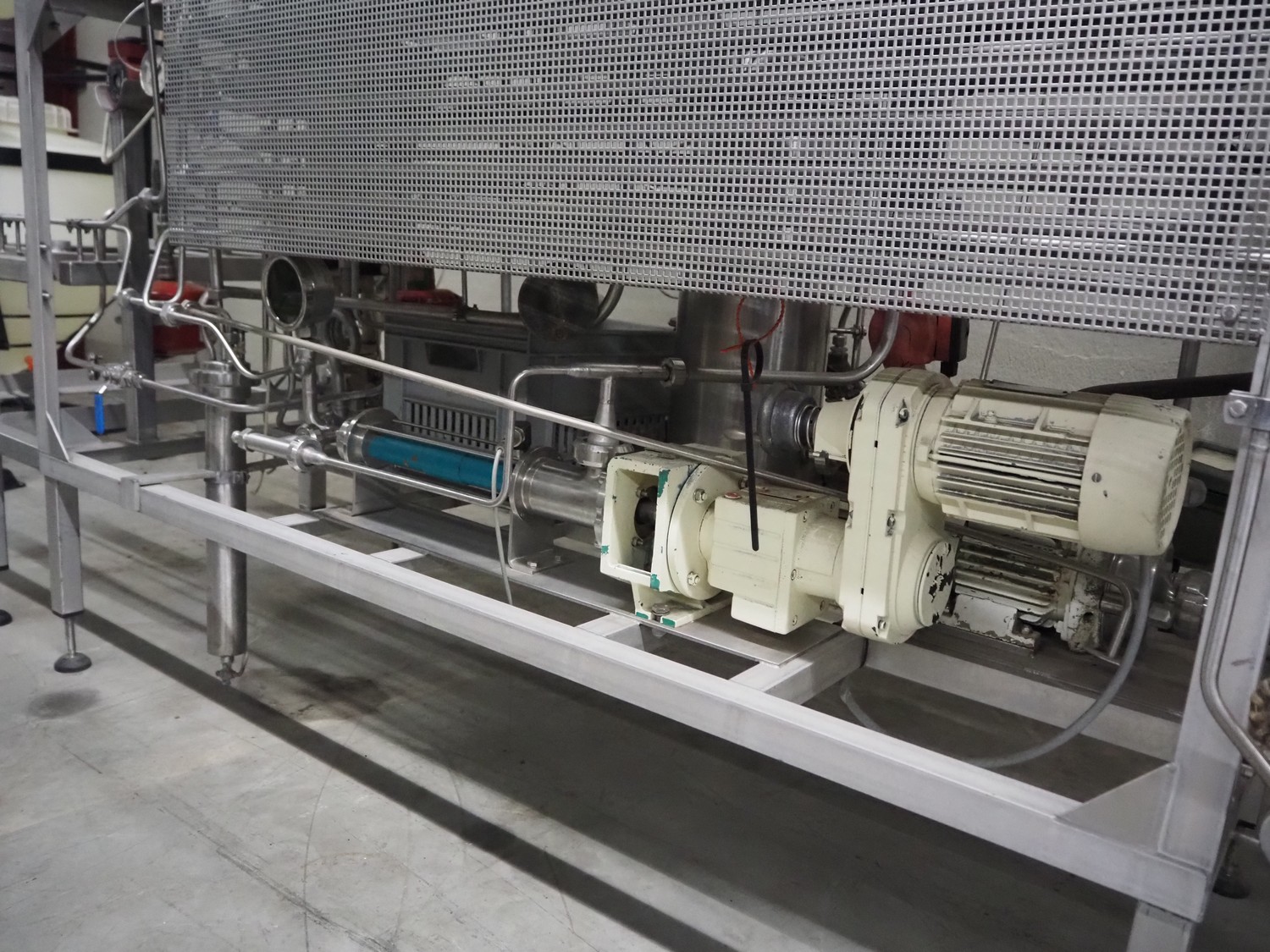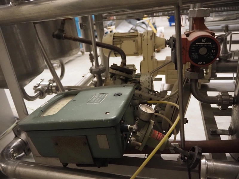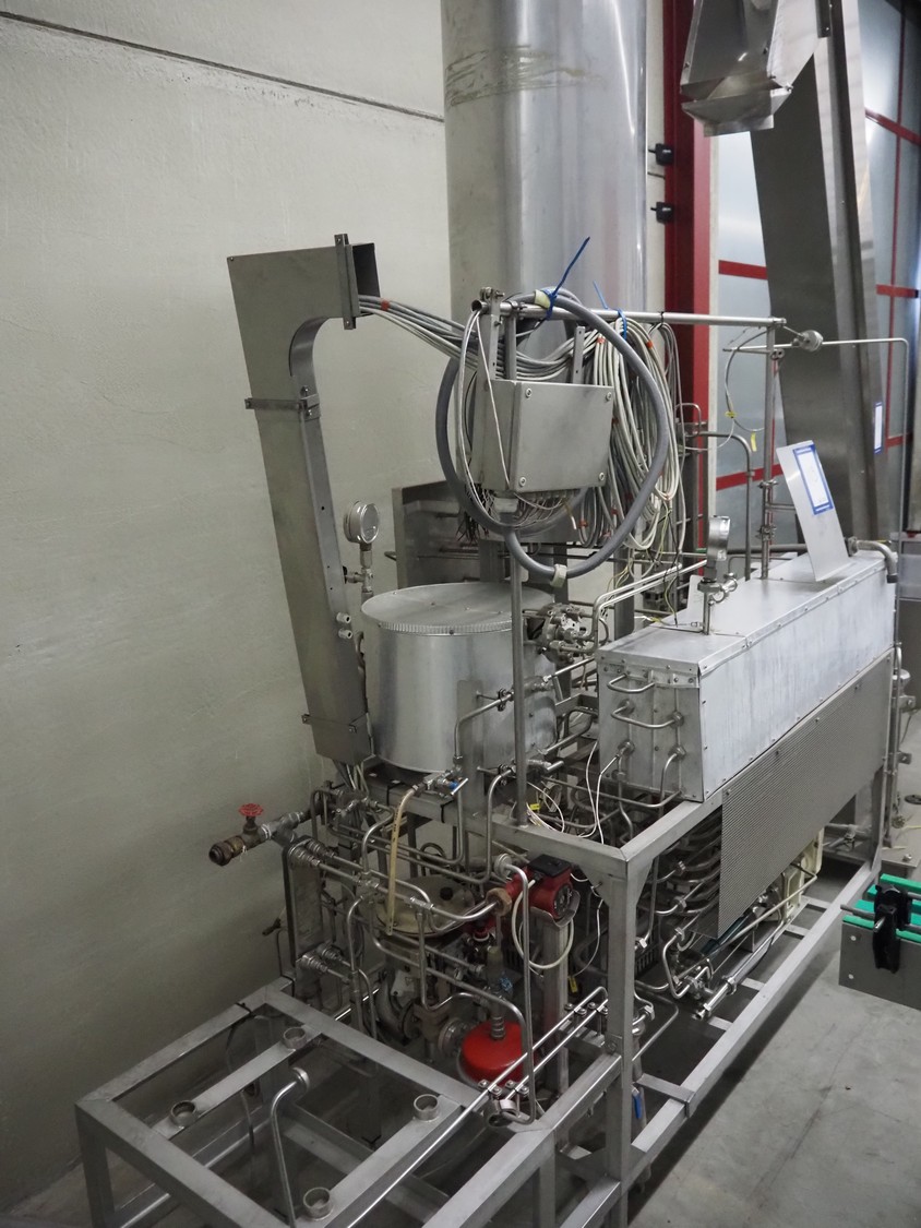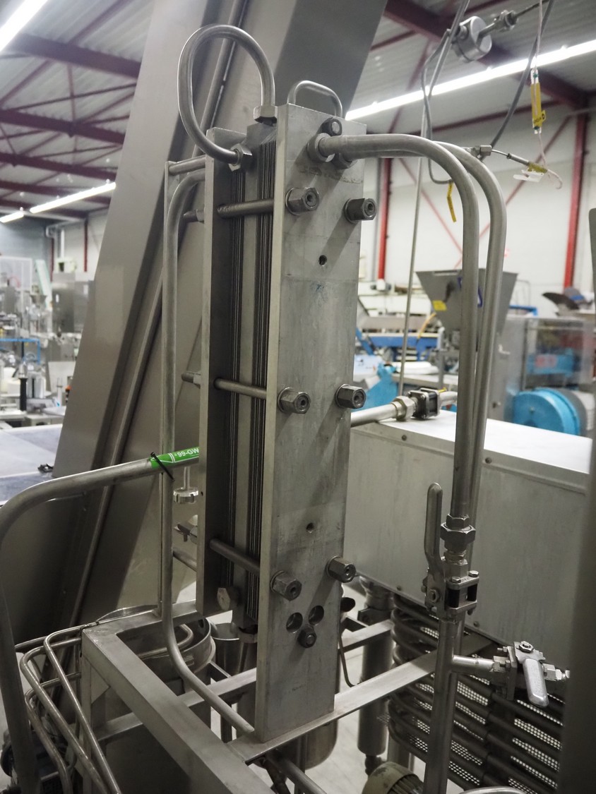 Homogenizing testing unit, consisting of: 2 plate heat exchangers, 1 tube heat exchanger and several pumps, dimensions: 2900 mm x 1000 mm x 3050 mm. Incomplete, missing homogenizer.