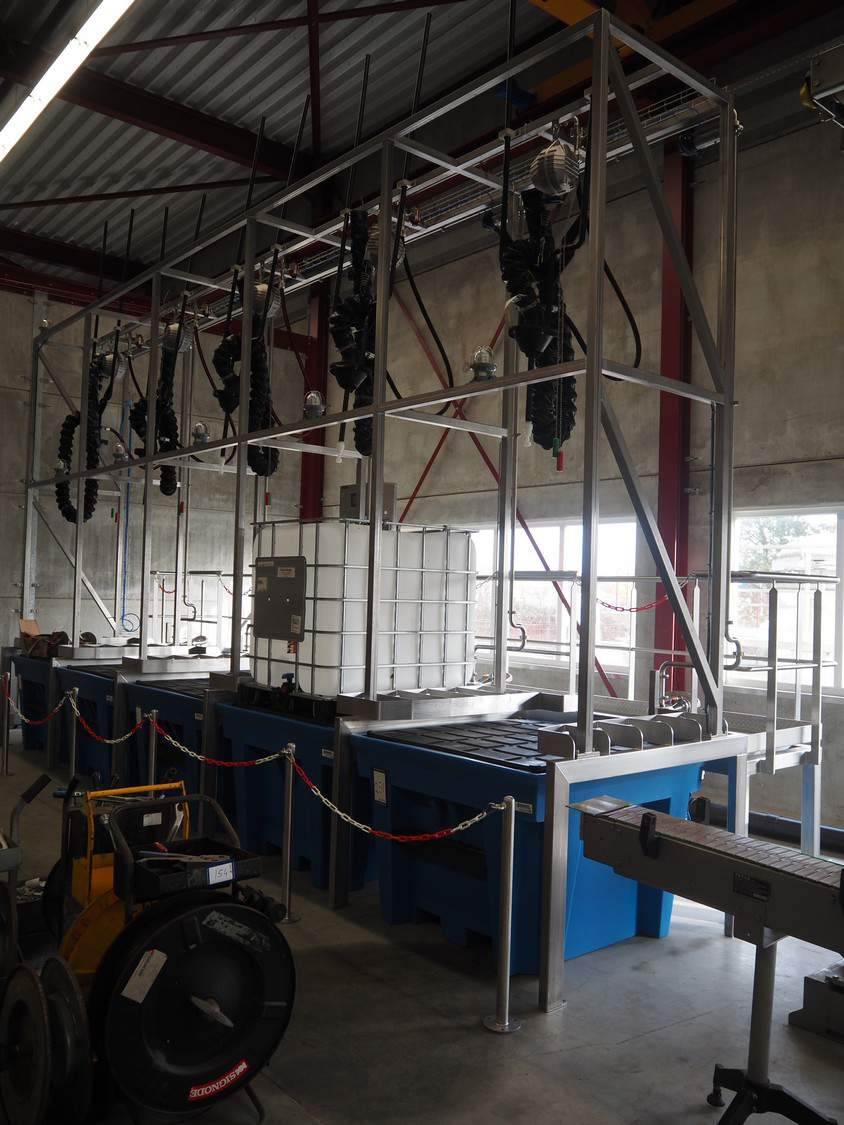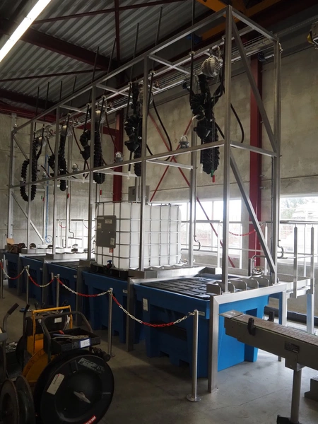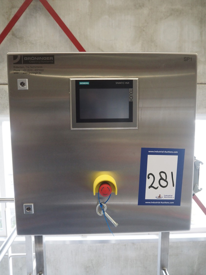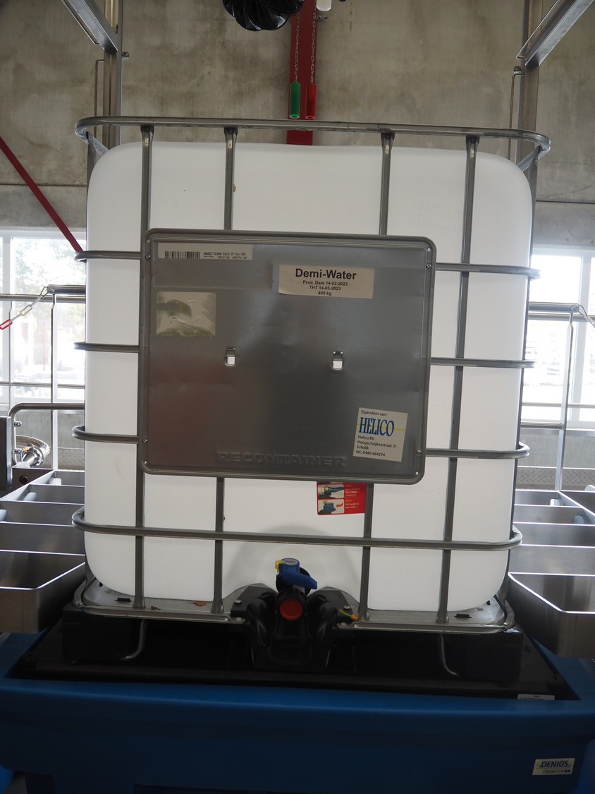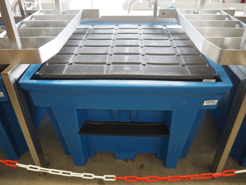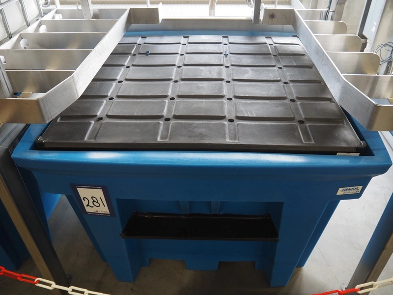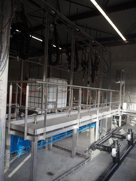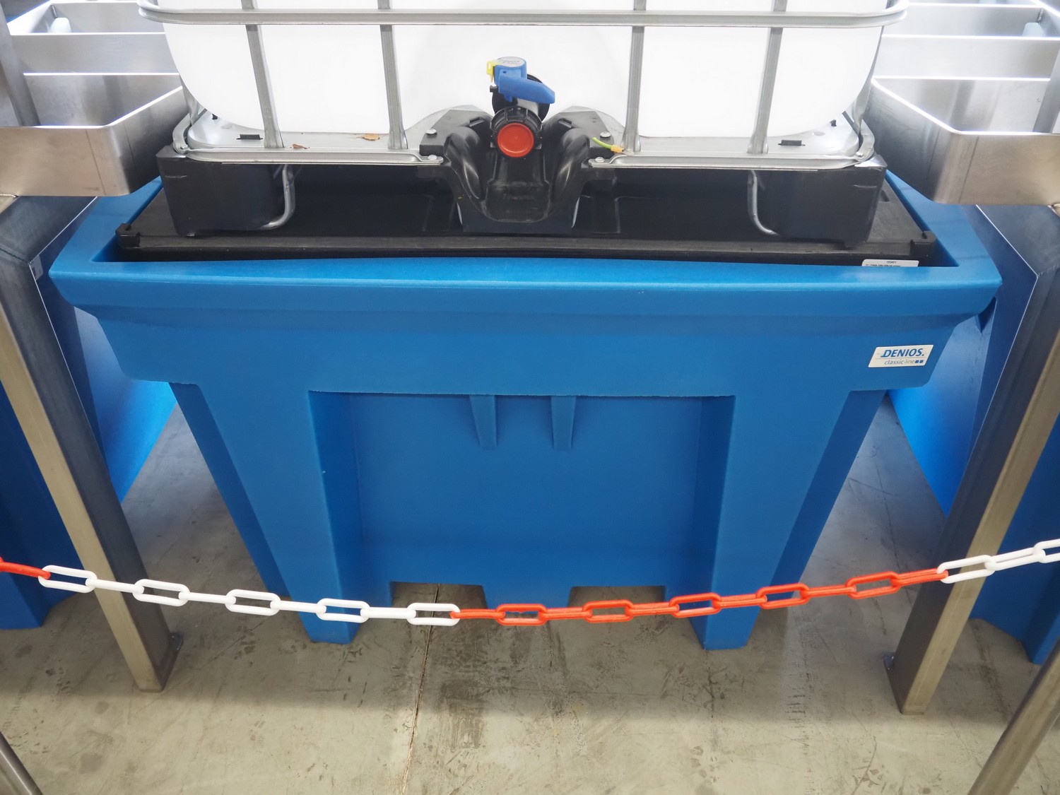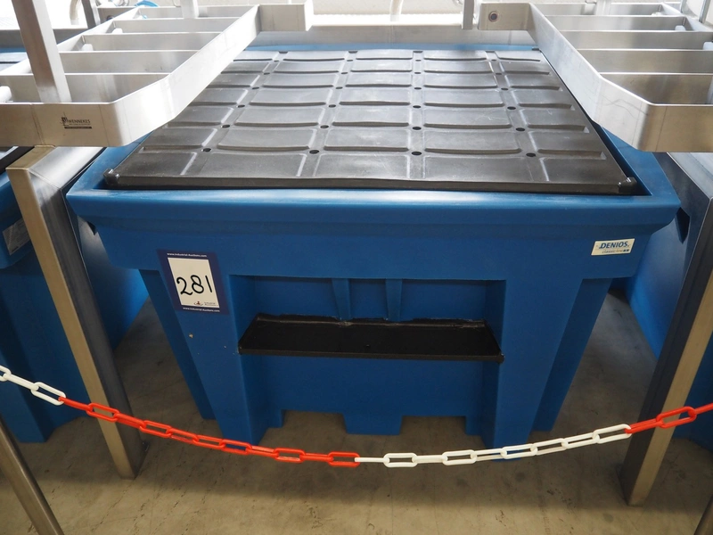 Gröninger IBC discharging and cleaning line consisting of: 5 IBC discharging and cleaning stations on Denios drip trays, 5 cleaning heads for spray cleaning and residue gas extraction on Tecna balancer, 2 CSF pumps, type: A 41-4-1.5/BD.PZ0T8B, dimensions drip trays: 1400 mm x 1350 mm x 1900 mm, dimensions s/s cleaning frame: 7550 mm x 1800 mm x 4300 mm, dimensions platform: 7500 mm x 2100 mm x 2800 mm. Without blower for gas extraction.