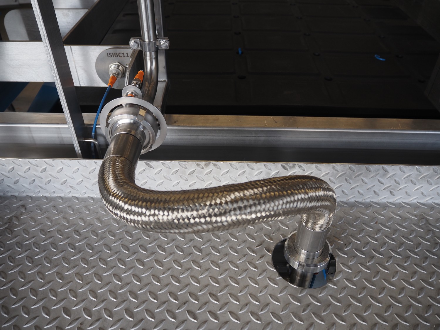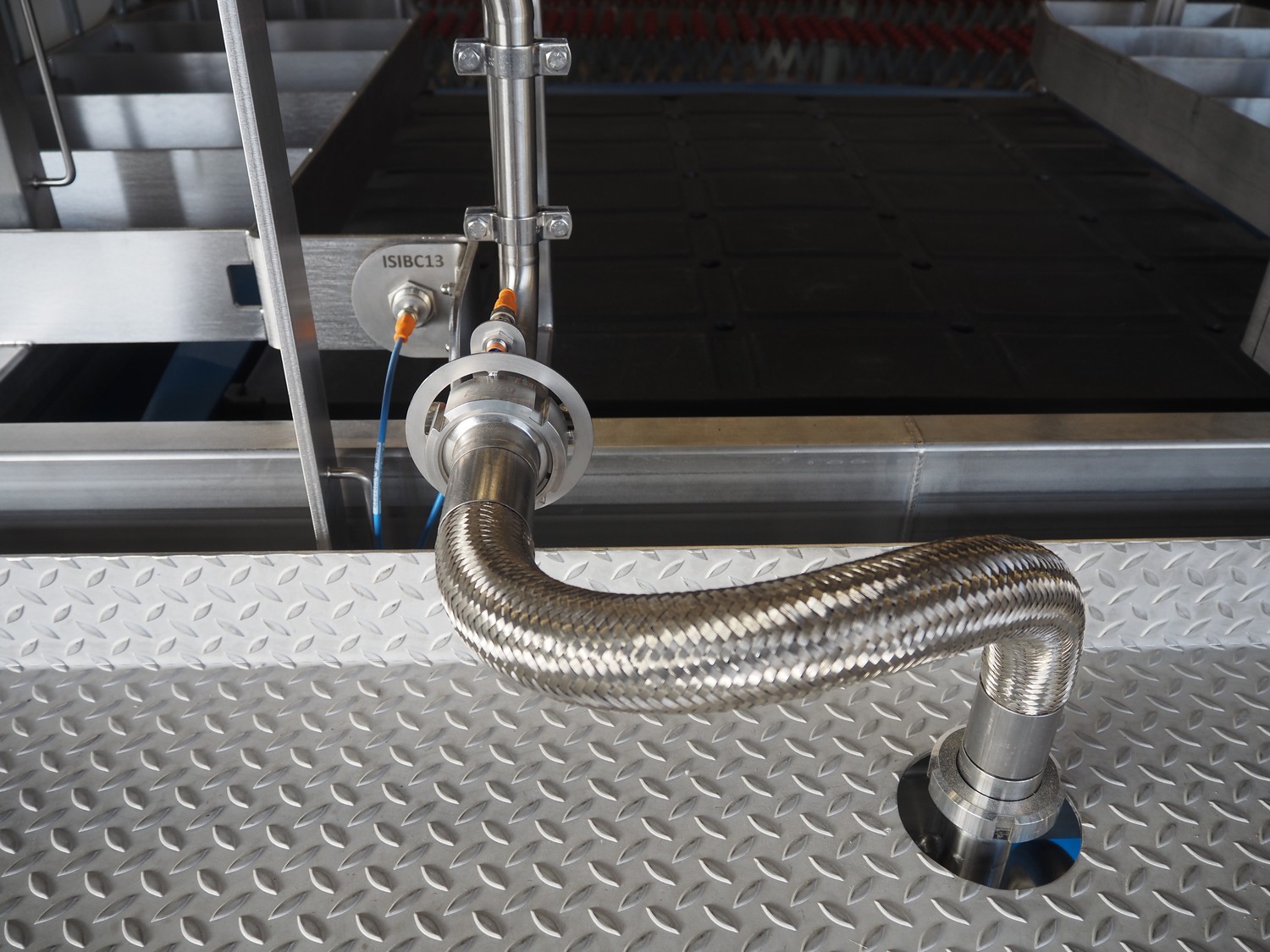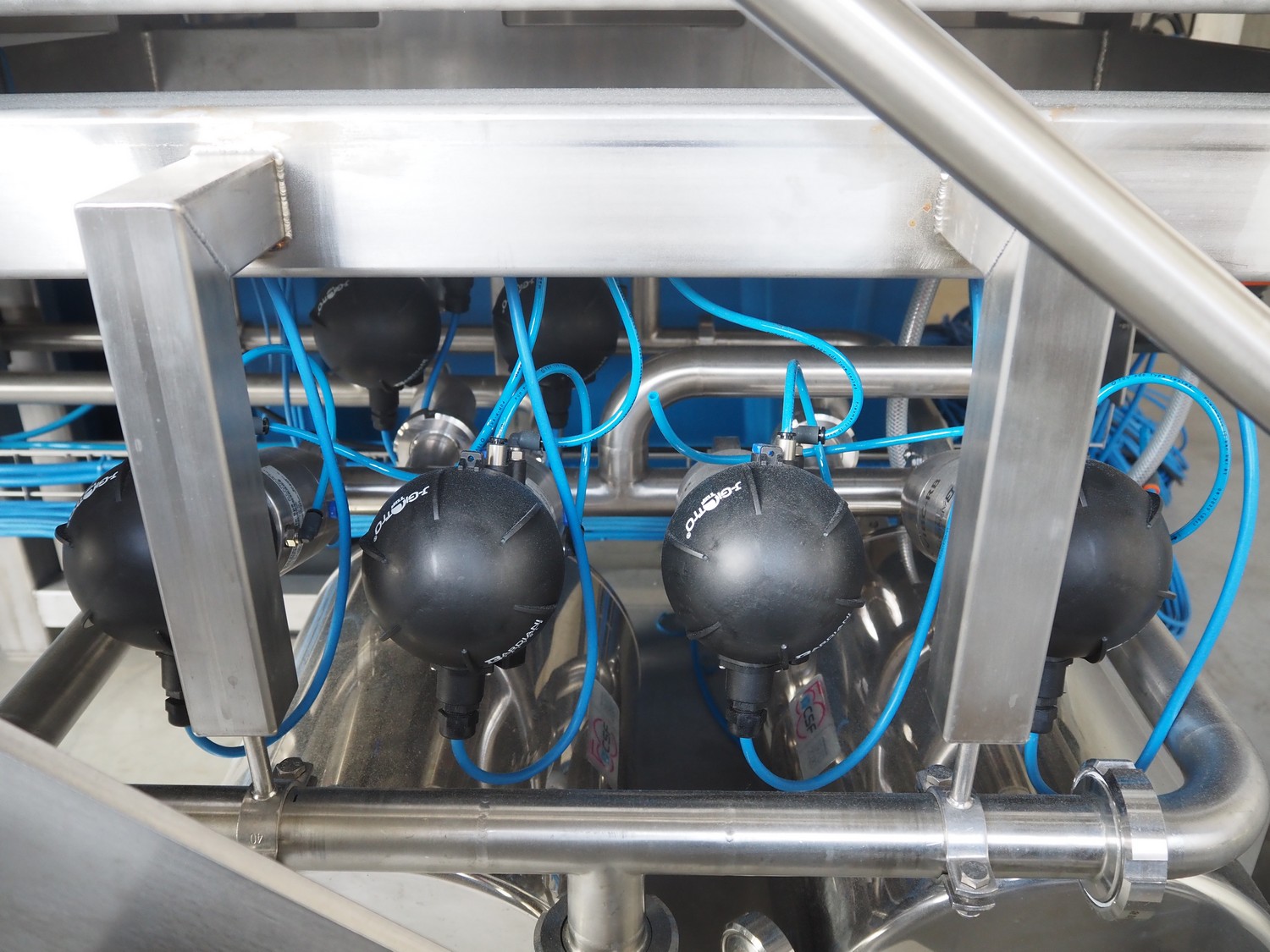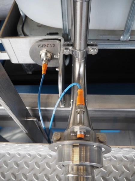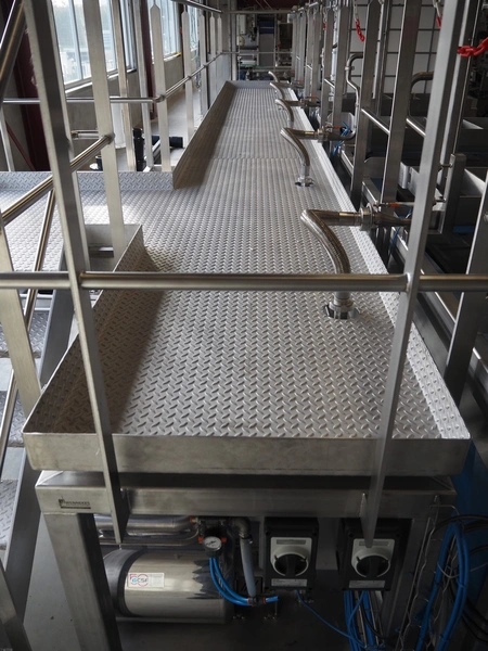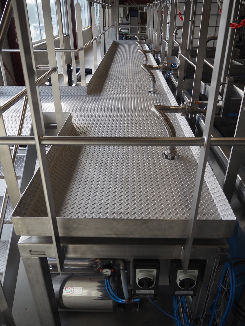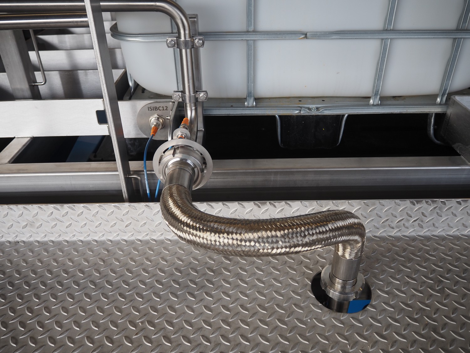 Gröninger IBC discharging and cleaning line consisting of: 5 IBC discharging and cleaning stations on Denios drip trays, 5 cleaning heads for spray cleaning and residue gas extraction on Tecna balancer, 2 CSF pumps, type: A 41-4-1.5/BD.PZ0T8B, dimensions drip trays: 1400 mm x 1350 mm x 1900 mm, dimensions s/s cleaning frame: 7550 mm x 1800 mm x 4300 mm, dimensions platform: 7500 mm x 2100 mm x 2800 mm. Without blower for gas extraction.