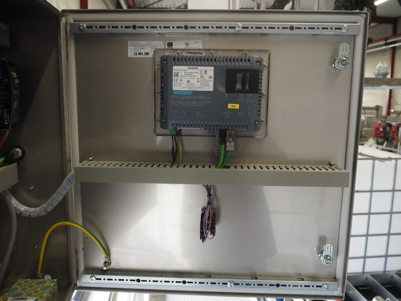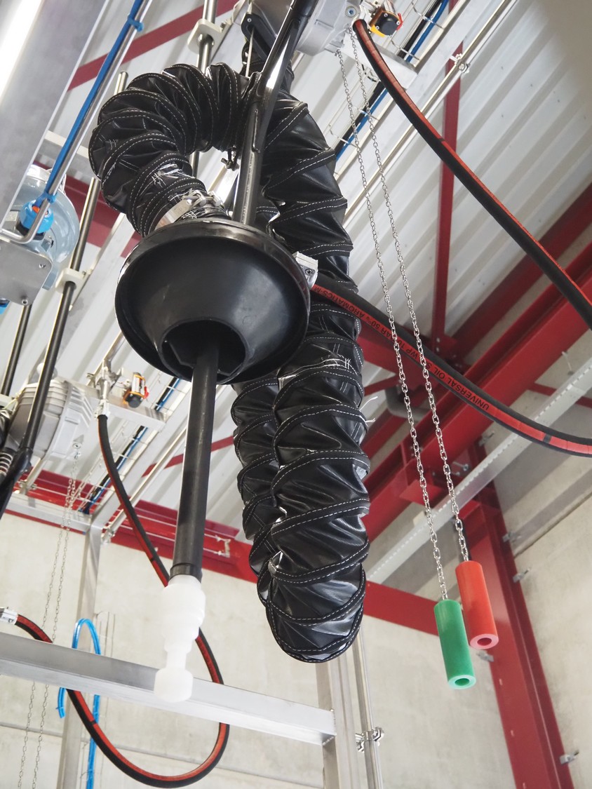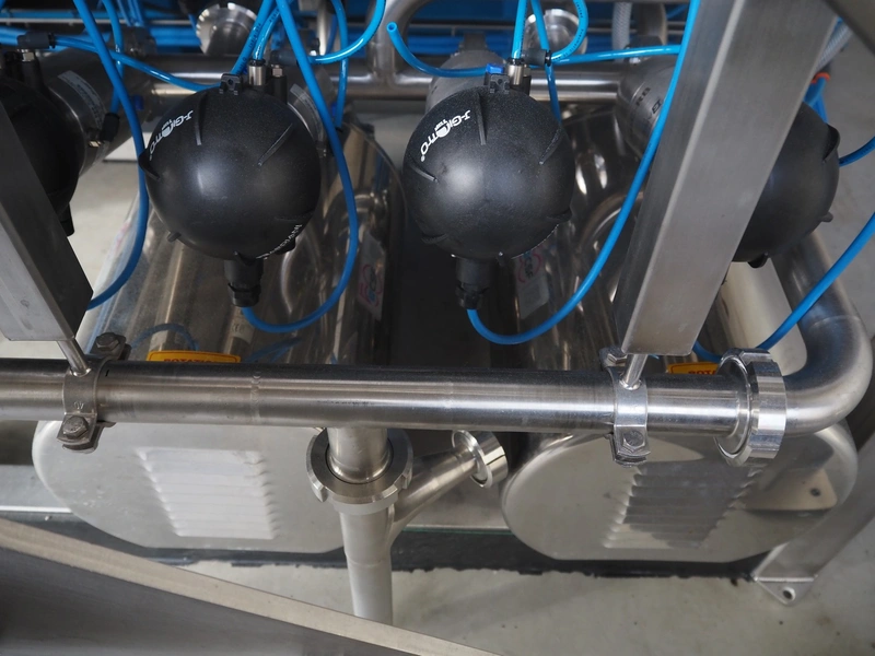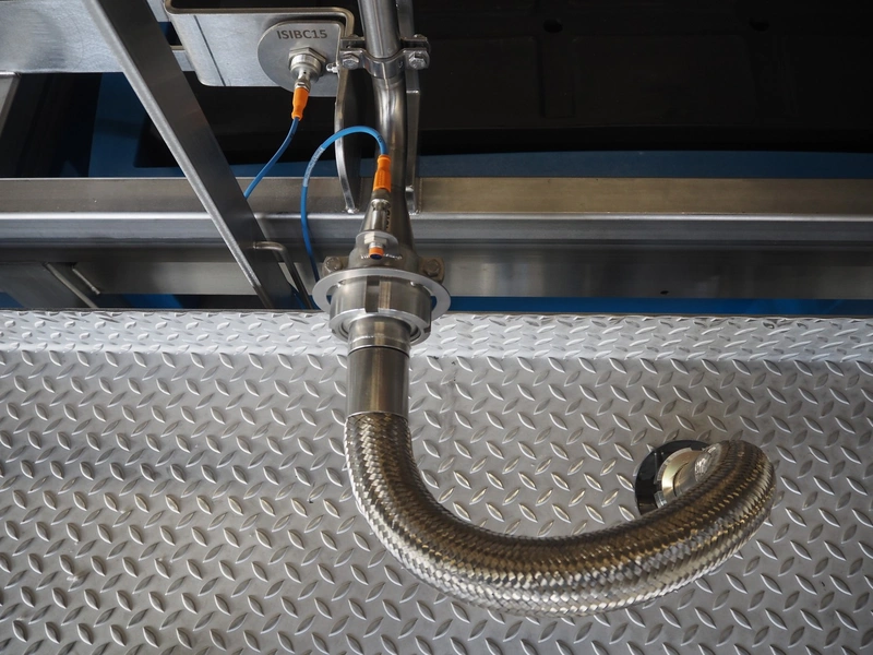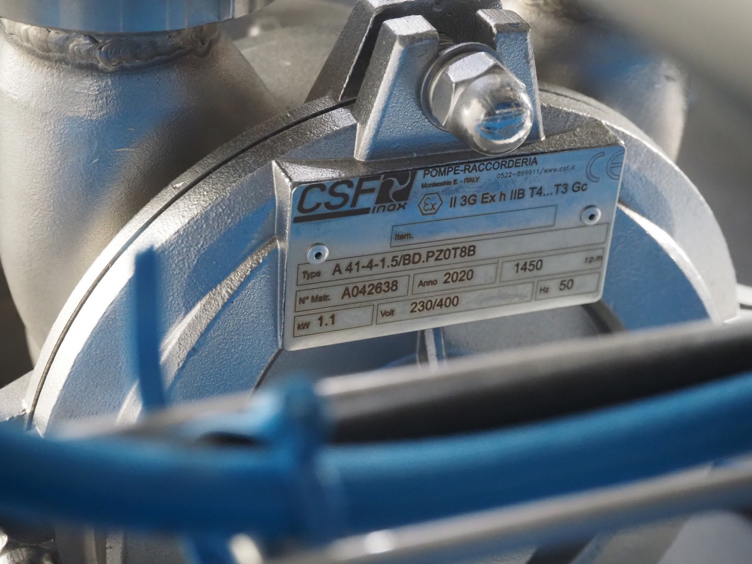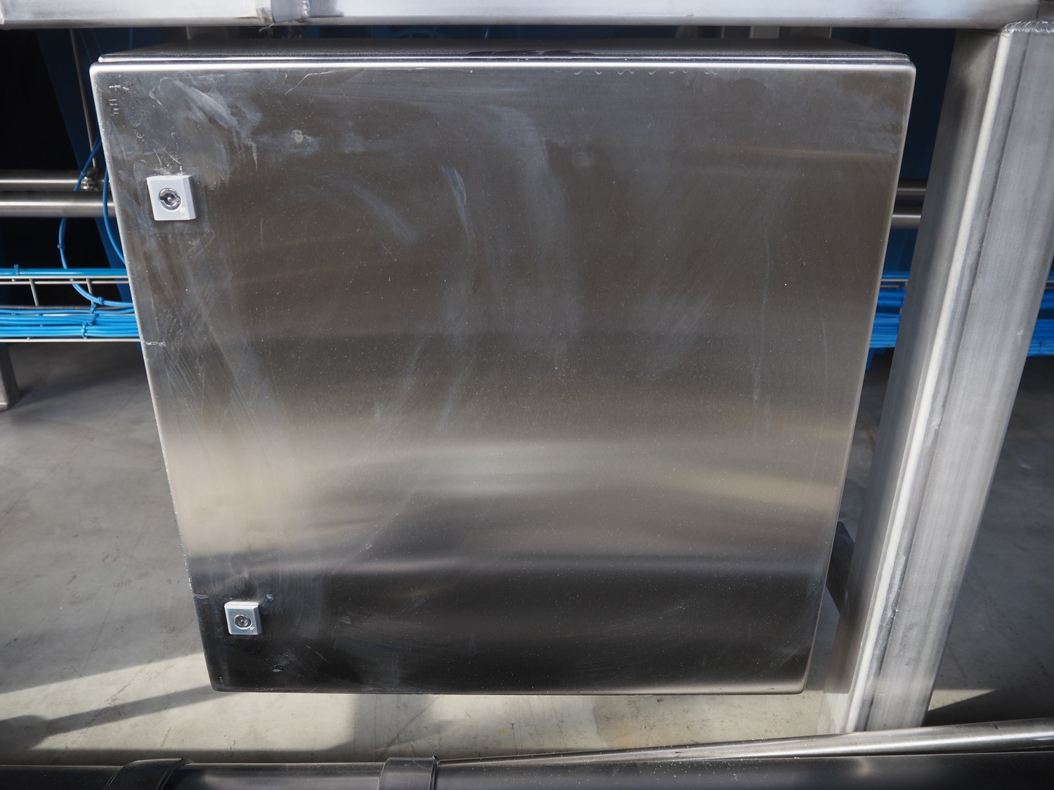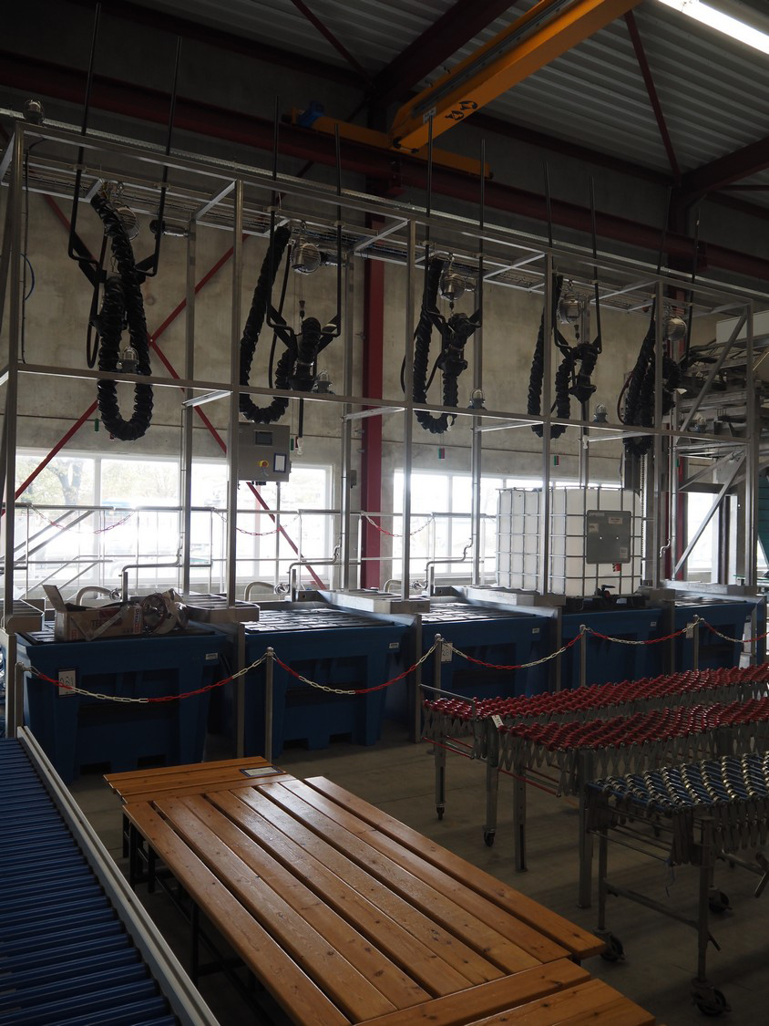 Gröninger IBC discharging and cleaning line consisting of: 5 IBC discharging and cleaning stations on Denios drip trays, 5 cleaning heads for spray cleaning and residue gas extraction on Tecna balancer, 2 CSF pumps, type: A 41-4-1.5/BD.PZ0T8B, dimensions drip trays: 1400 mm x 1350 mm x 1900 mm, dimensions s/s cleaning frame: 7550 mm x 1800 mm x 4300 mm, dimensions platform: 7500 mm x 2100 mm x 2800 mm. Without blower for gas extraction.