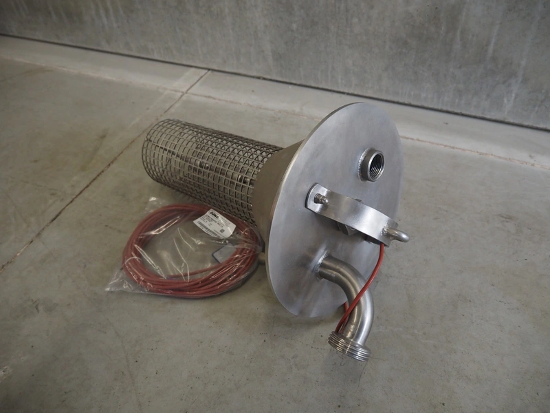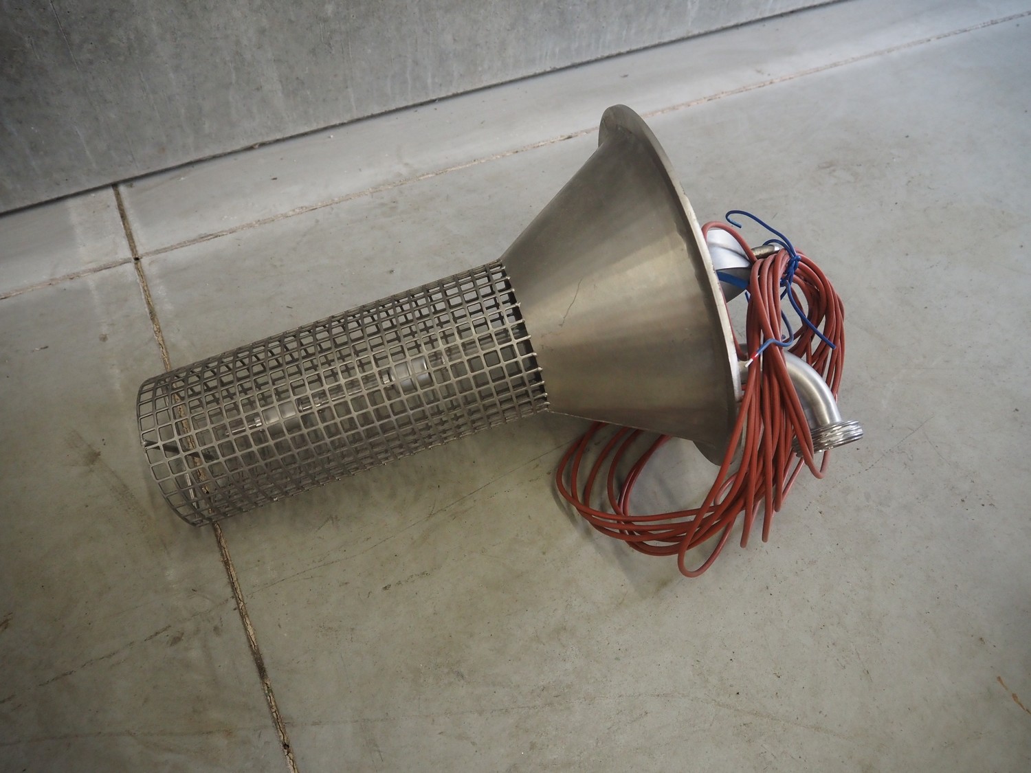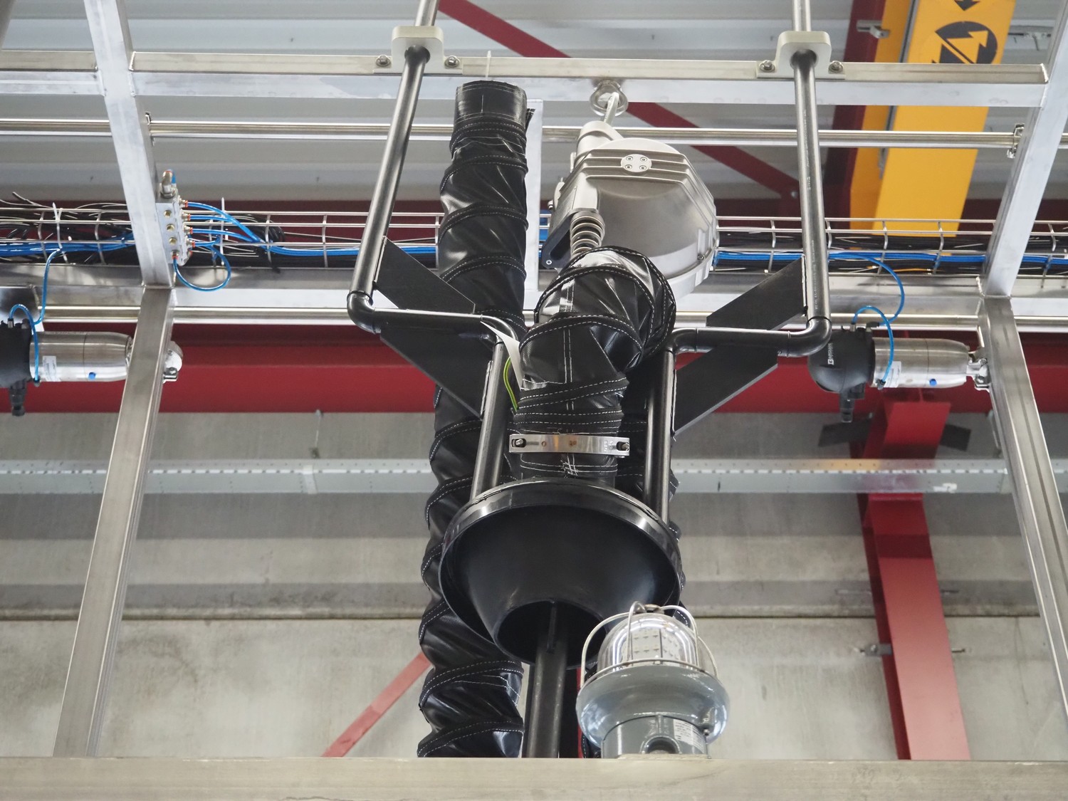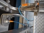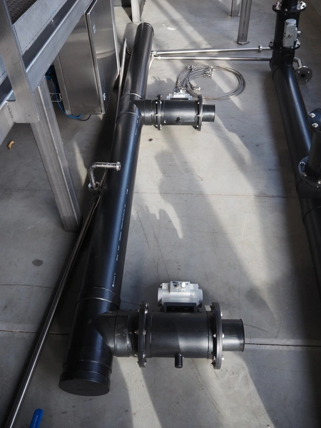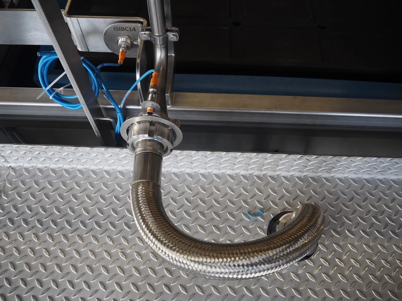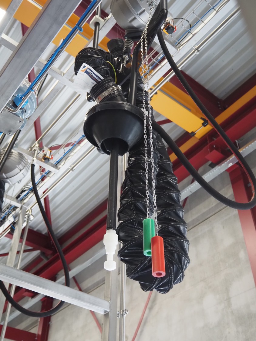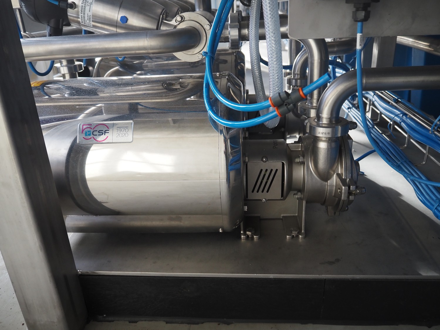 Gröninger IBC discharging and cleaning line consisting of: 5 IBC discharging and cleaning stations on Denios drip trays, 5 cleaning heads for spray cleaning and residue gas extraction on Tecna balancer, 2 CSF pumps, type: A 41-4-1.5/BD.PZ0T8B, dimensions drip trays: 1400 mm x 1350 mm x 1900 mm, dimensions s/s cleaning frame: 7550 mm x 1800 mm x 4300 mm, dimensions platform: 7500 mm x 2100 mm x 2800 mm. Without blower for gas extraction.