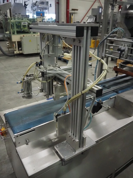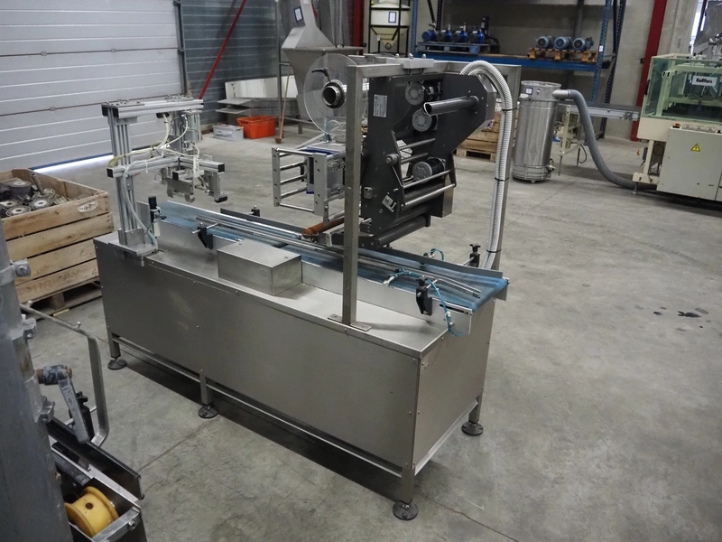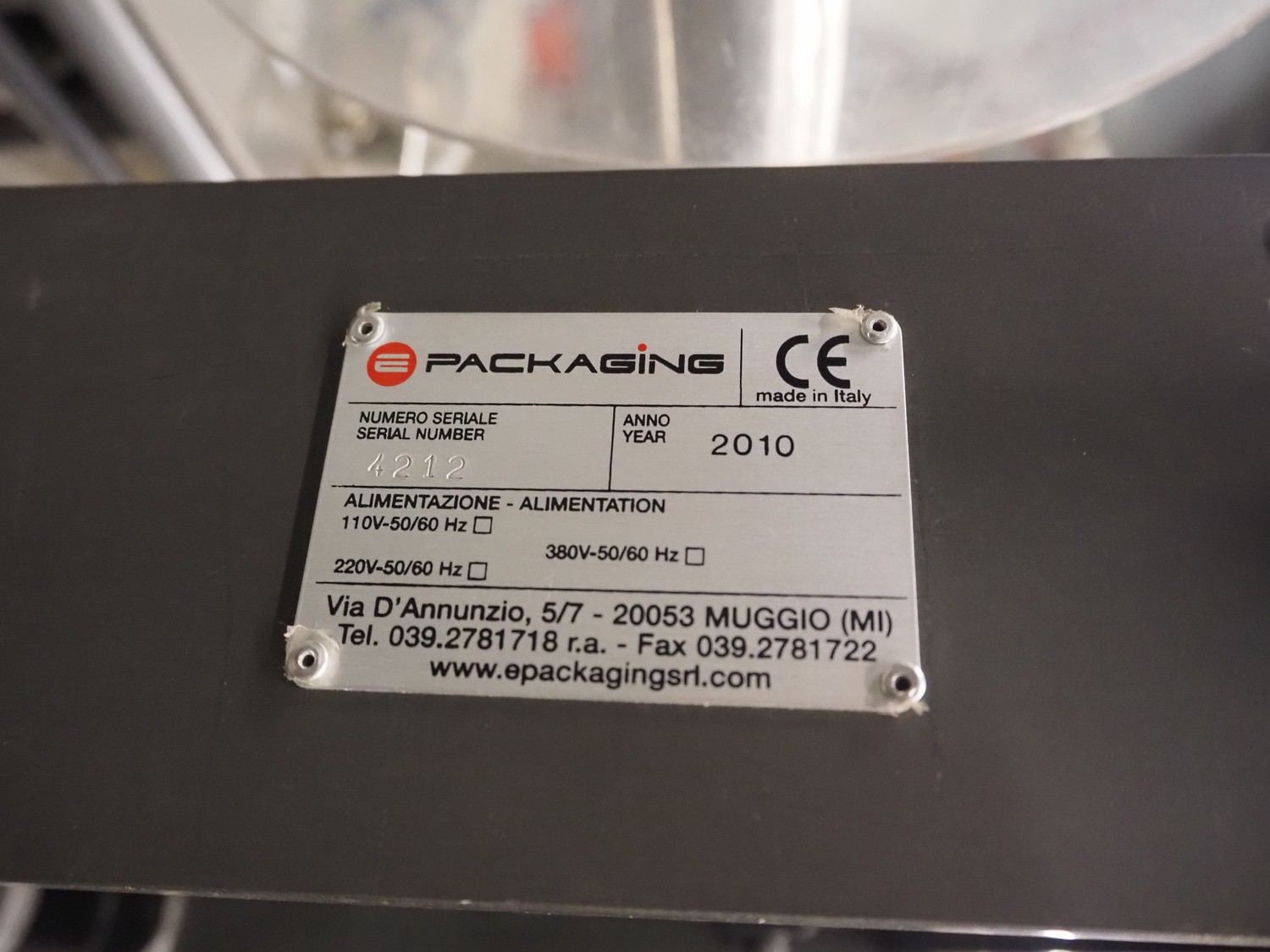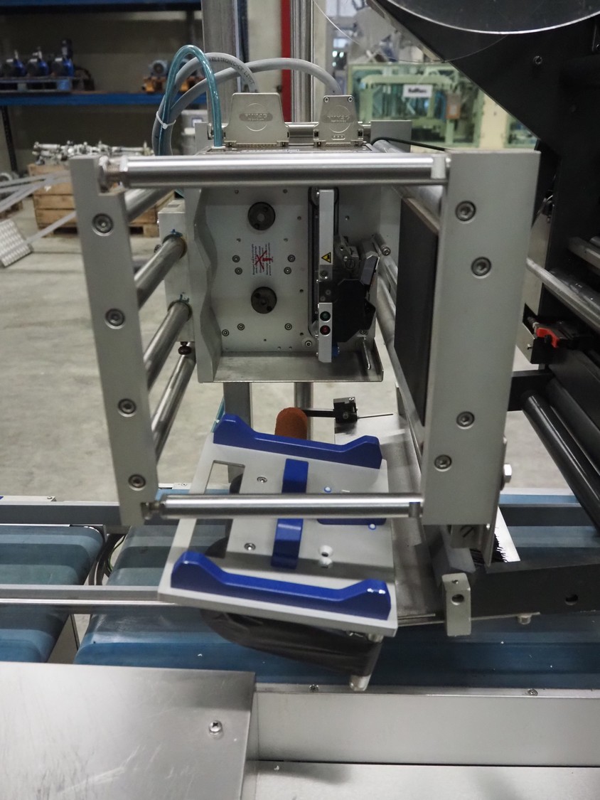 E-packaging labelling machine, serial number: 4212, year of construction: 2010, plastic belt, belt width: (1x) 350 mm, (1x) 250 mm, total dimensions: 2150 mm x 850 mm x 1750 mm.
