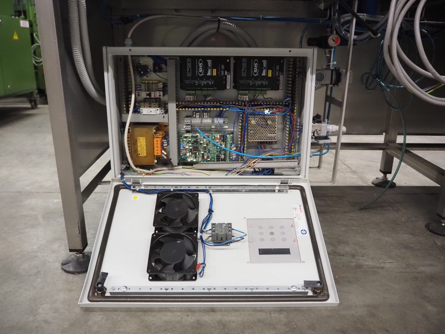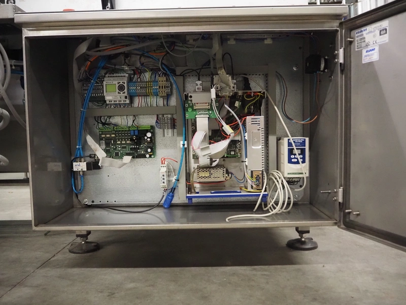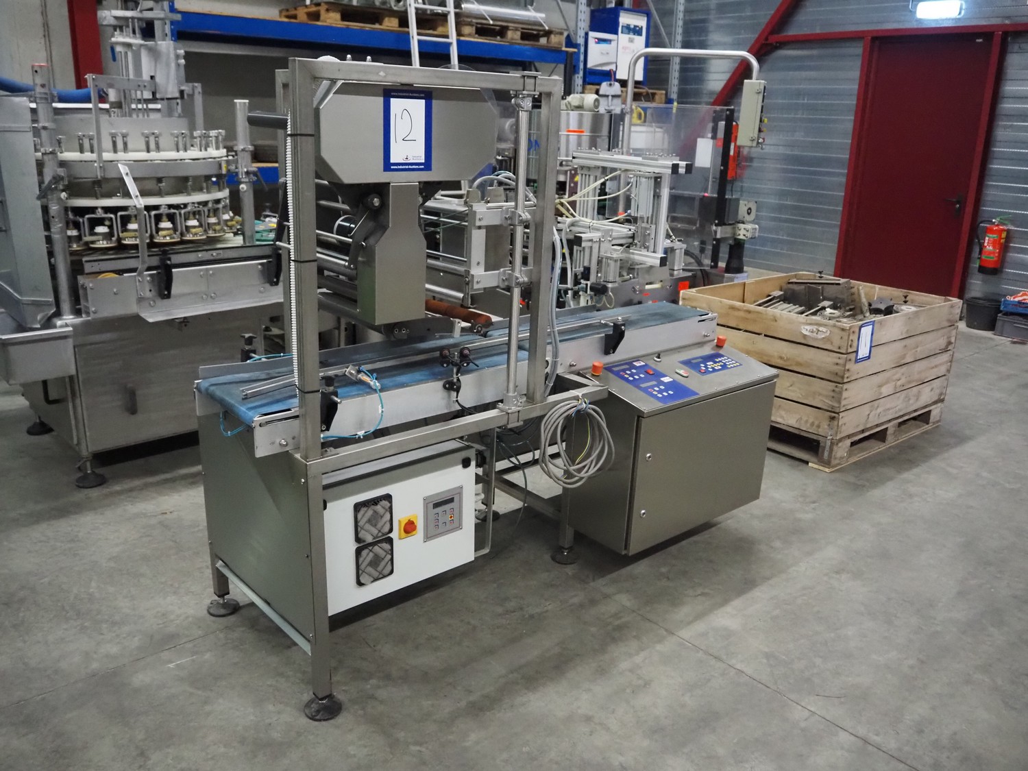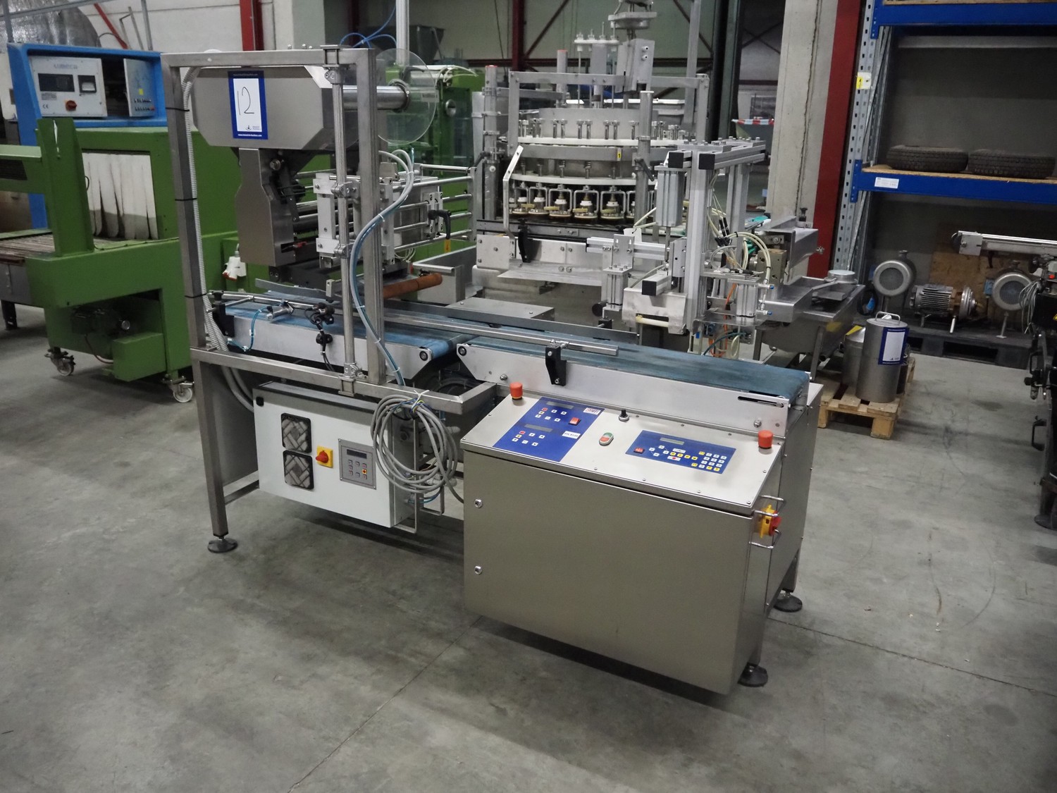 E-packaging labelling machine, serial number: 4212, year of construction: 2010, plastic belt, belt width: (1x) 350 mm, (1x) 250 mm, total dimensions: 2150 mm x 850 mm x 1750 mm.