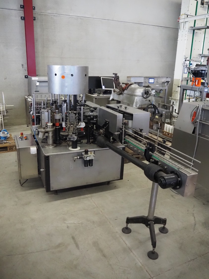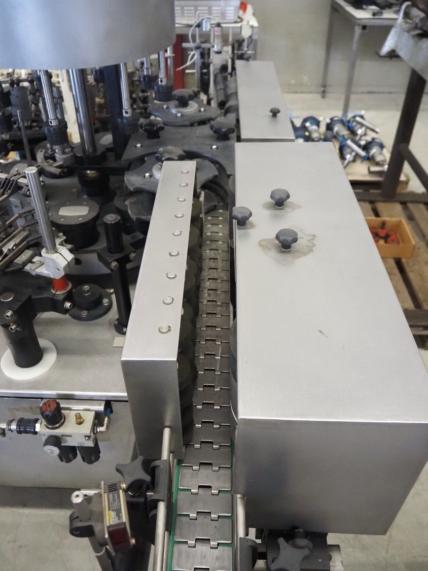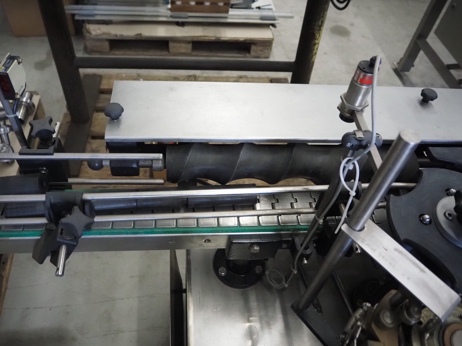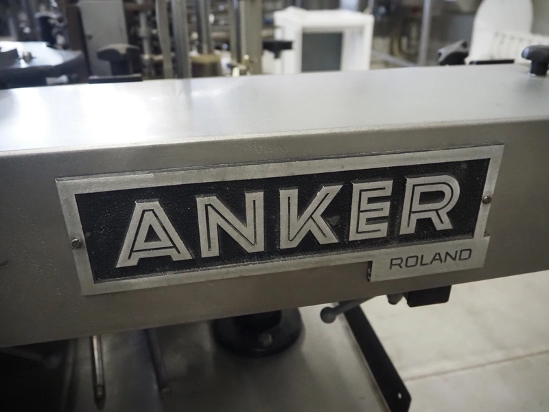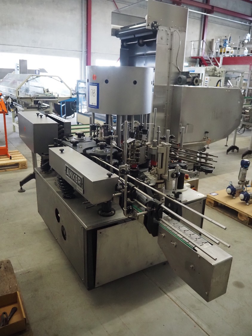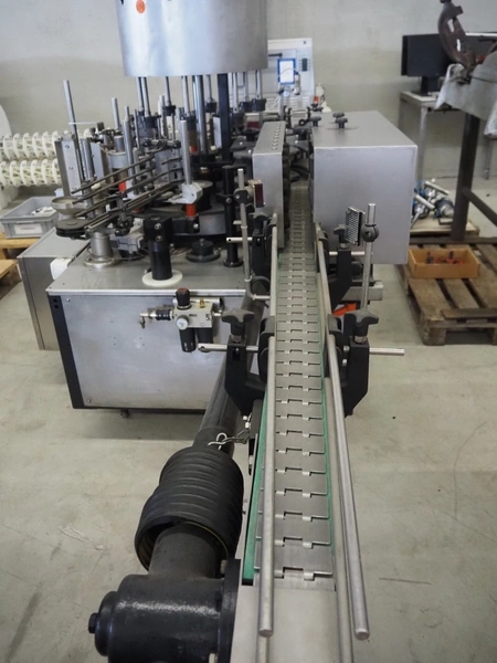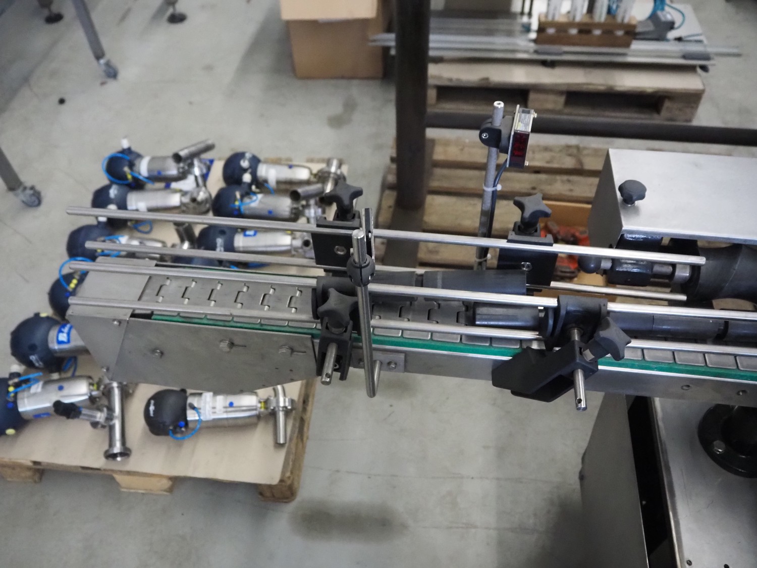 Anker labelling machine, s/s belt, belt width: 85 mm, 8 heads, diameter head: (8x) 20 mm, total dimensions: 3600 mm x 1600 mm x 1650 mm.