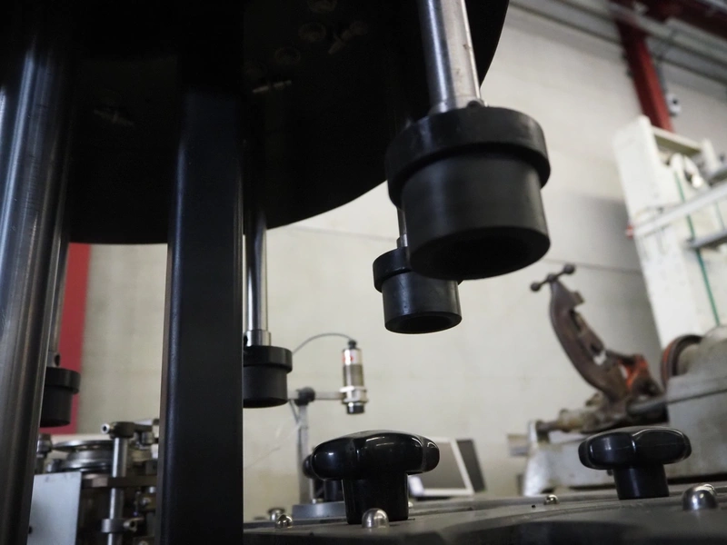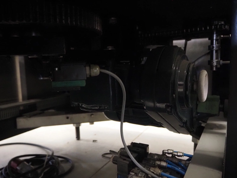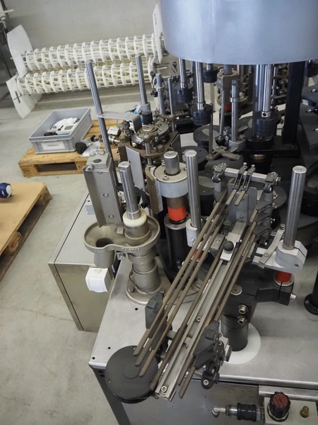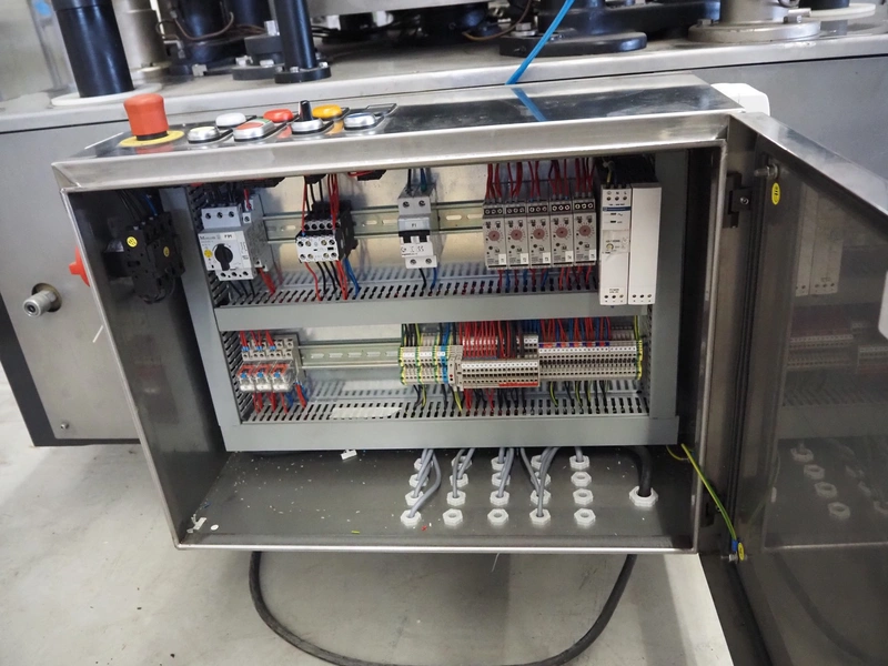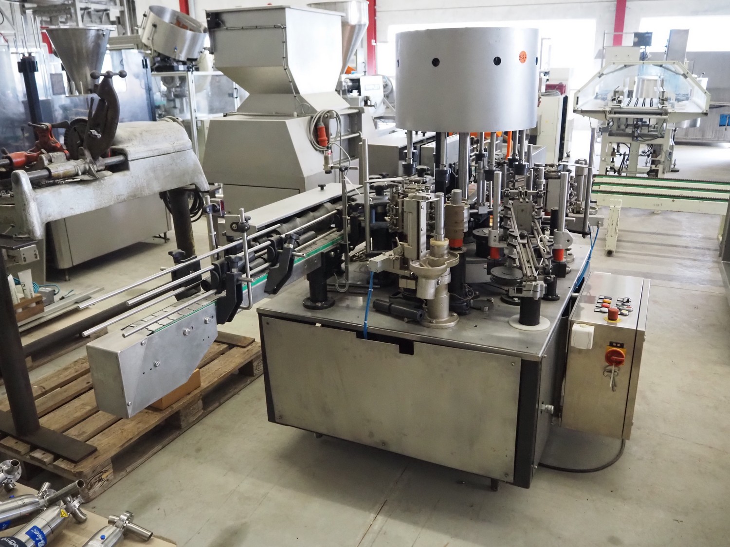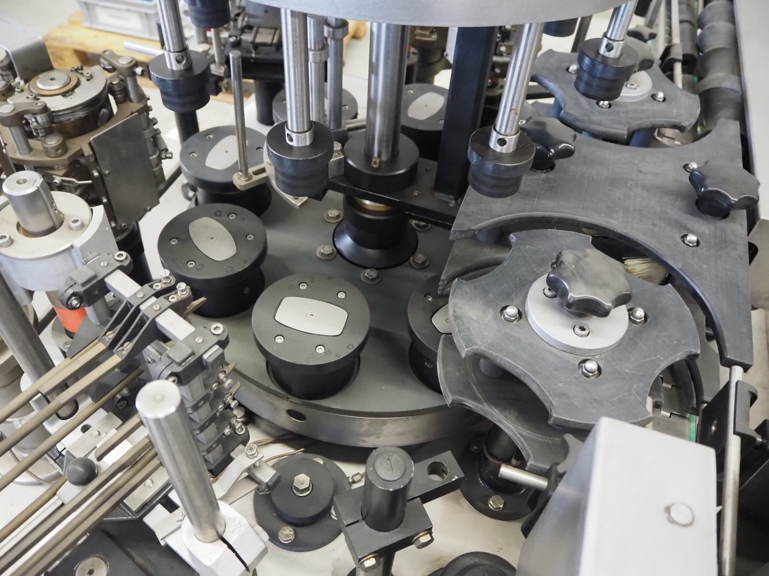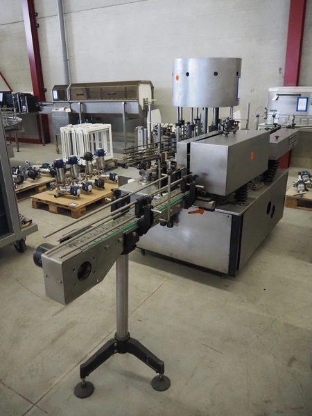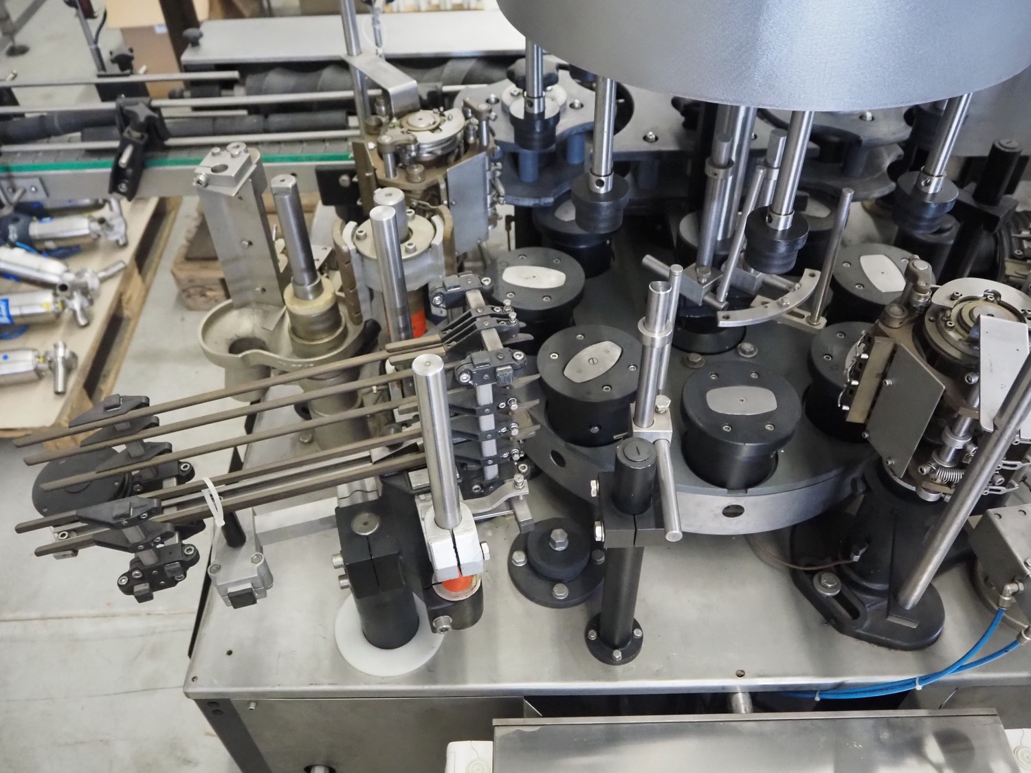 Anker labelling machine, s/s belt, belt width: 85 mm, 8 heads, diameter head: (8x) 20 mm, total dimensions: 3600 mm x 1600 mm x 1650 mm.