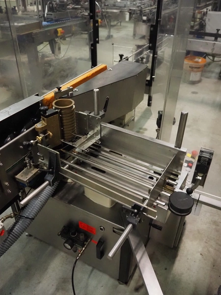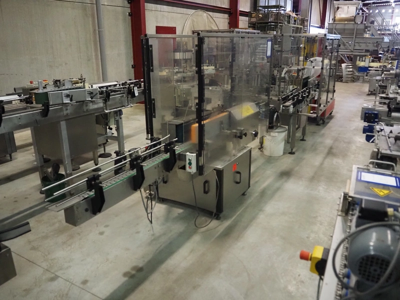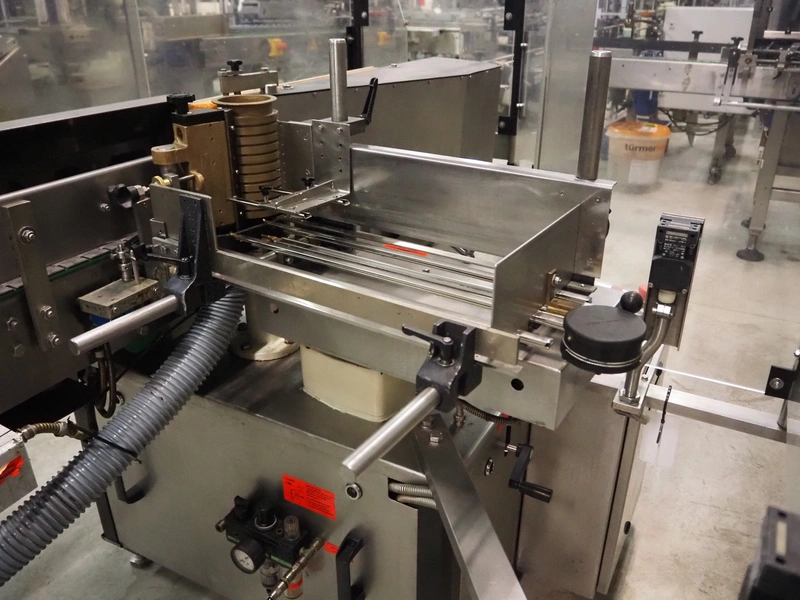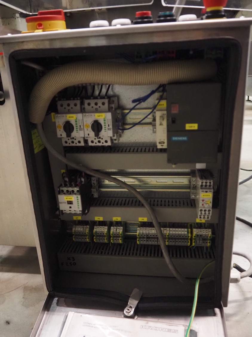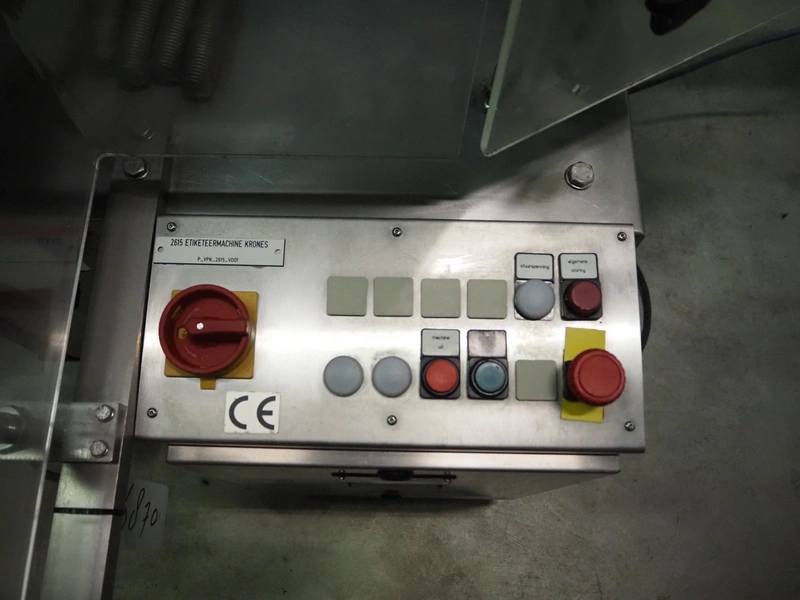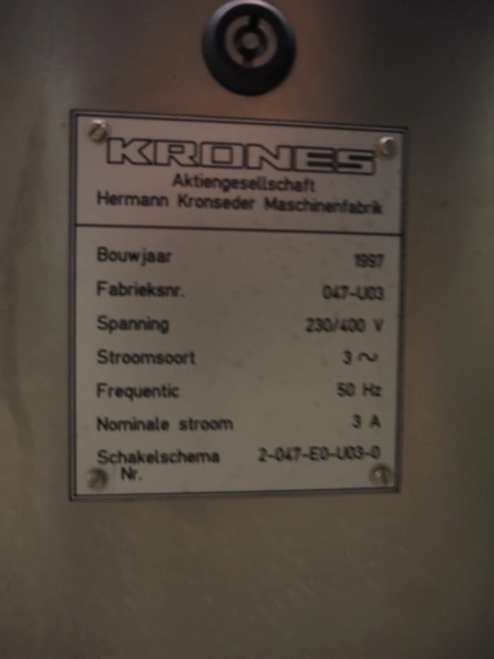 Krones labelling machine, number: 047-UO3, year of construction: 1997, 230/400 V, 3 Ph, 50 Hz, 3 A, s/s belt, belt width: 80 mm, label width: 150 mm, total dimensions: 3500 mm x 1300 mm x 1800 mm.