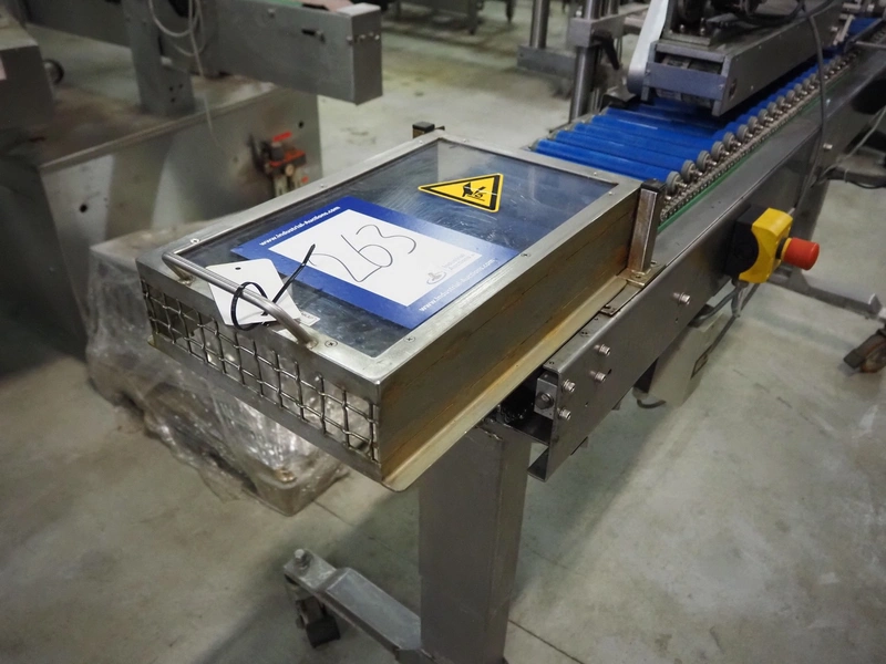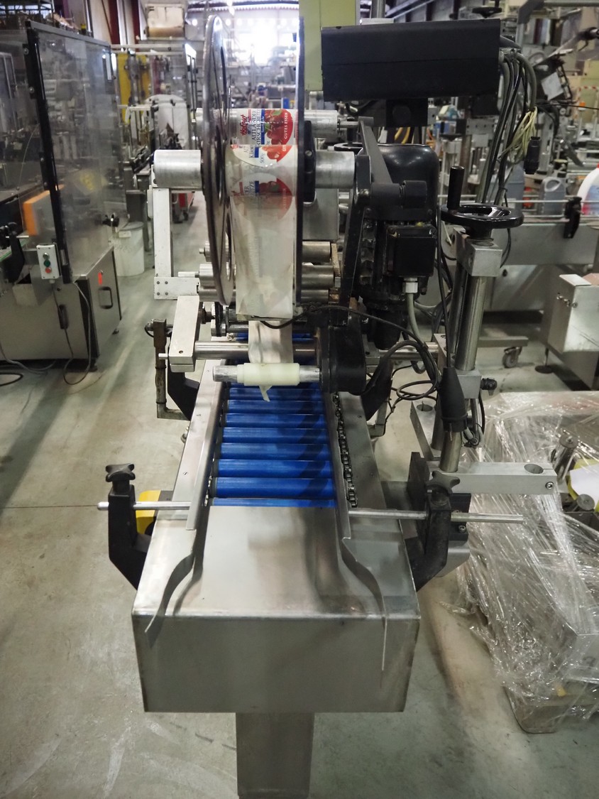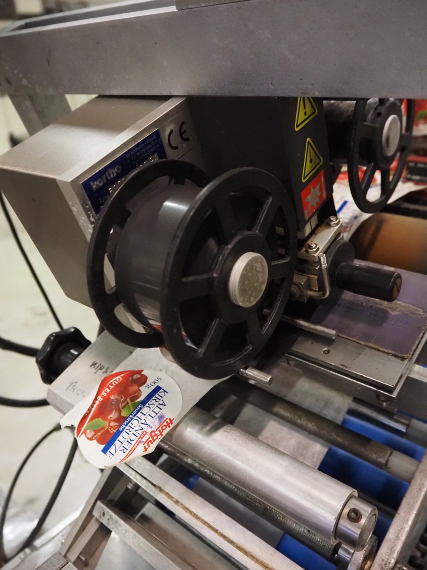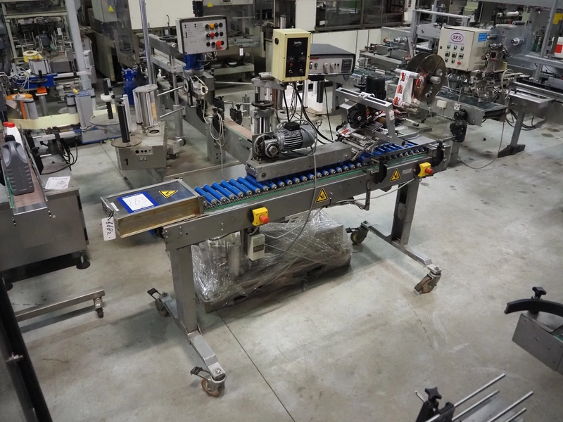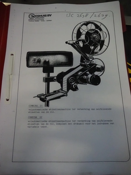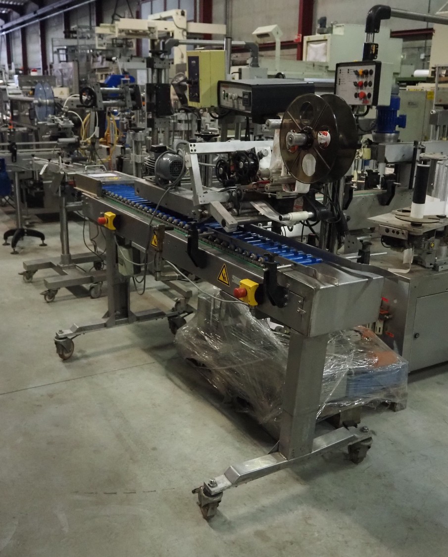 Eshuis BV mobile labelling machine with Kortho Labeler, type labeler: 80680 4 08 94, plastic rollers, roller width: 200 mm, labelling width: 75 mm, total dimensions: 2350 mm x 900 mm x 1850 mm.