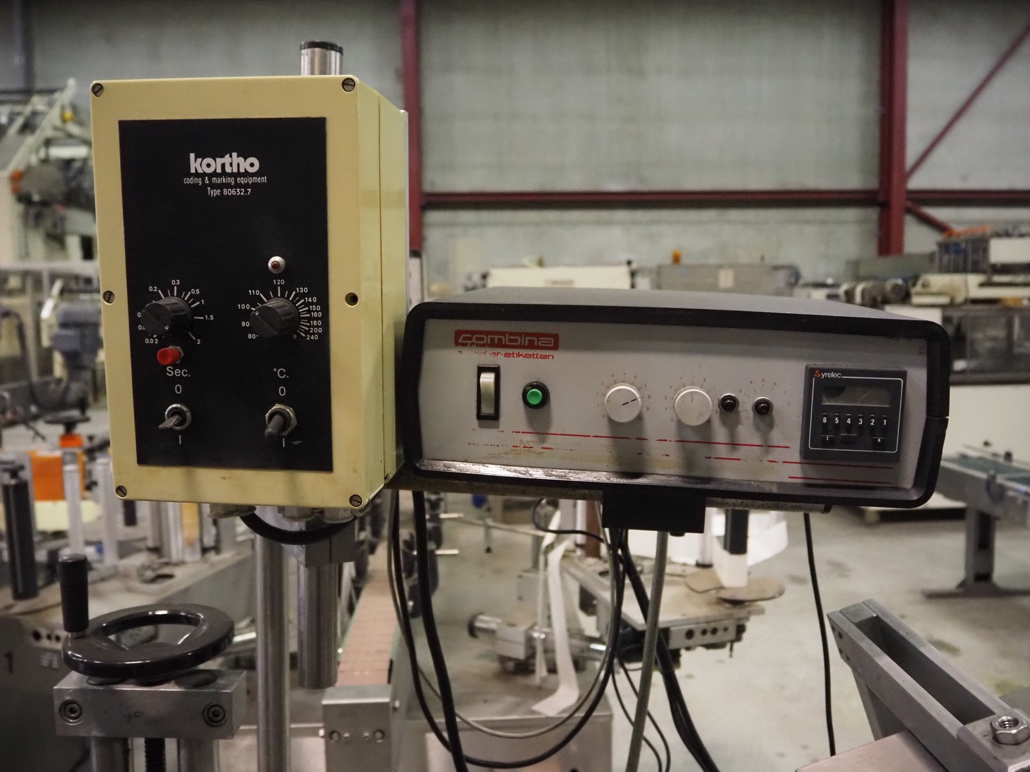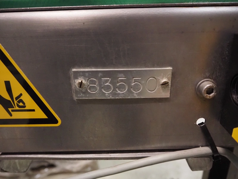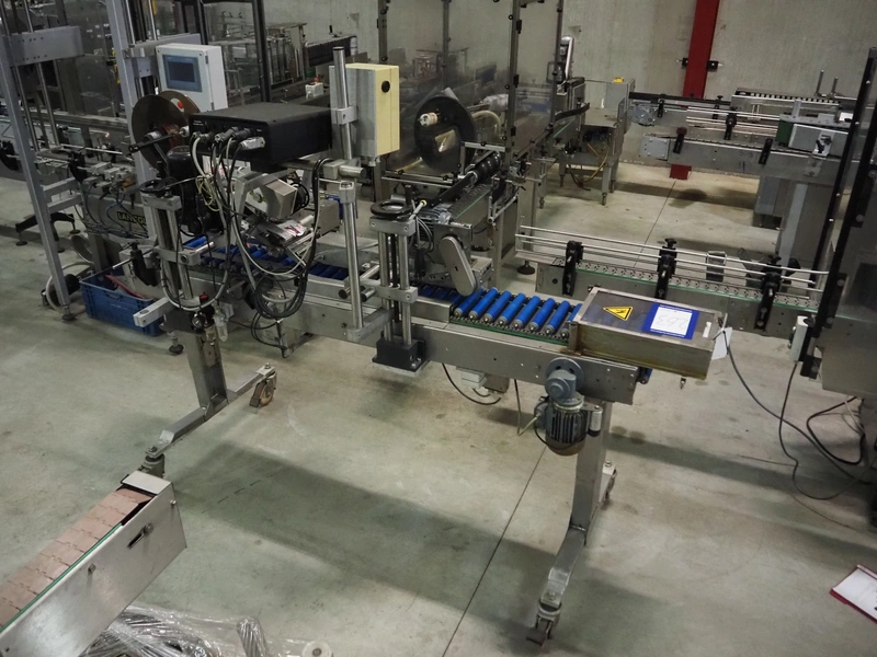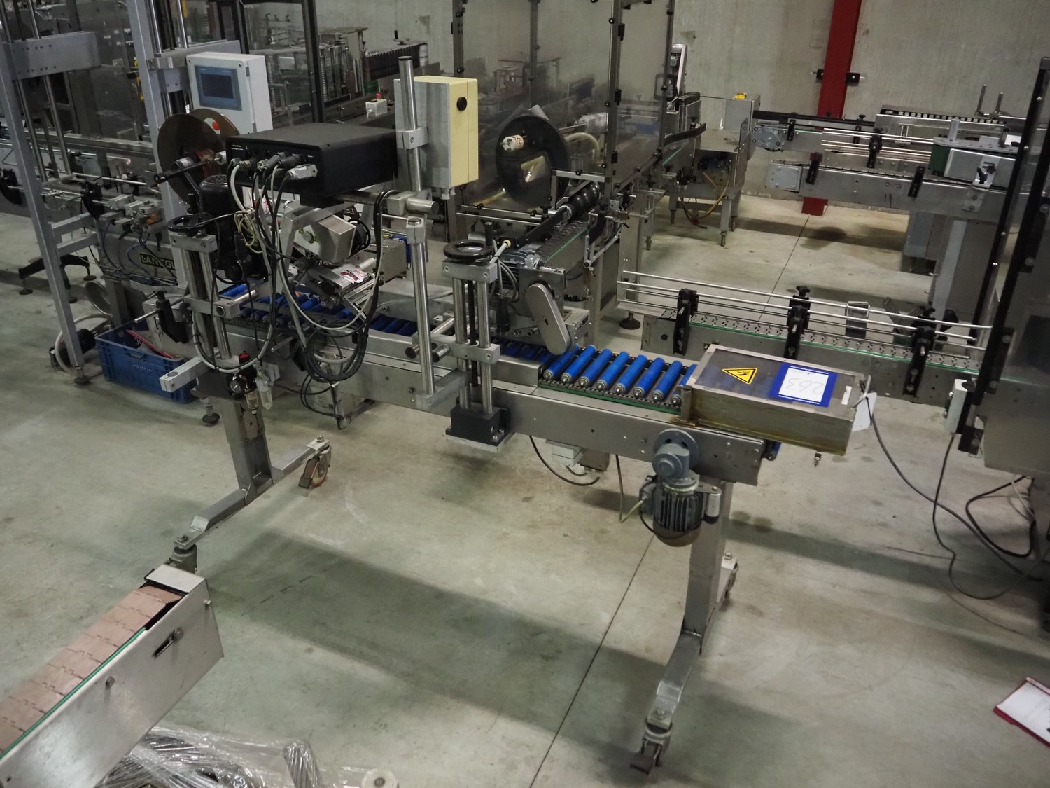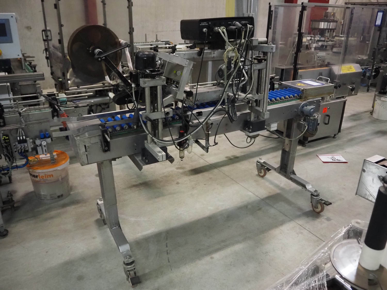 Eshuis BV mobile labelling machine with Kortho Labeler, type labeler: 80680 4 08 94, plastic rollers, roller width: 200 mm, labelling width: 75 mm, total dimensions: 2350 mm x 900 mm x 1850 mm.