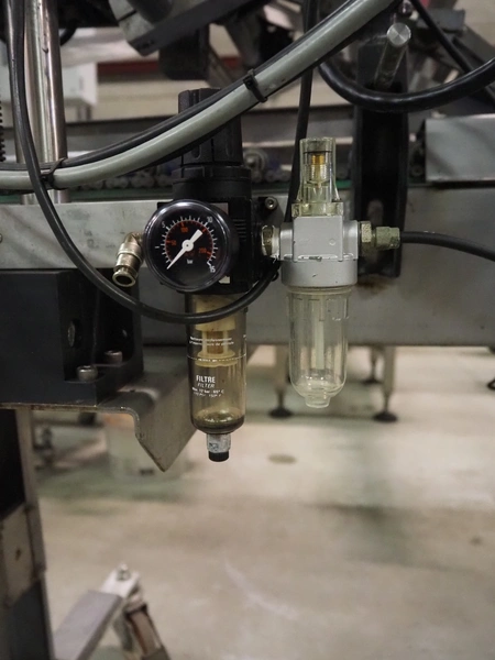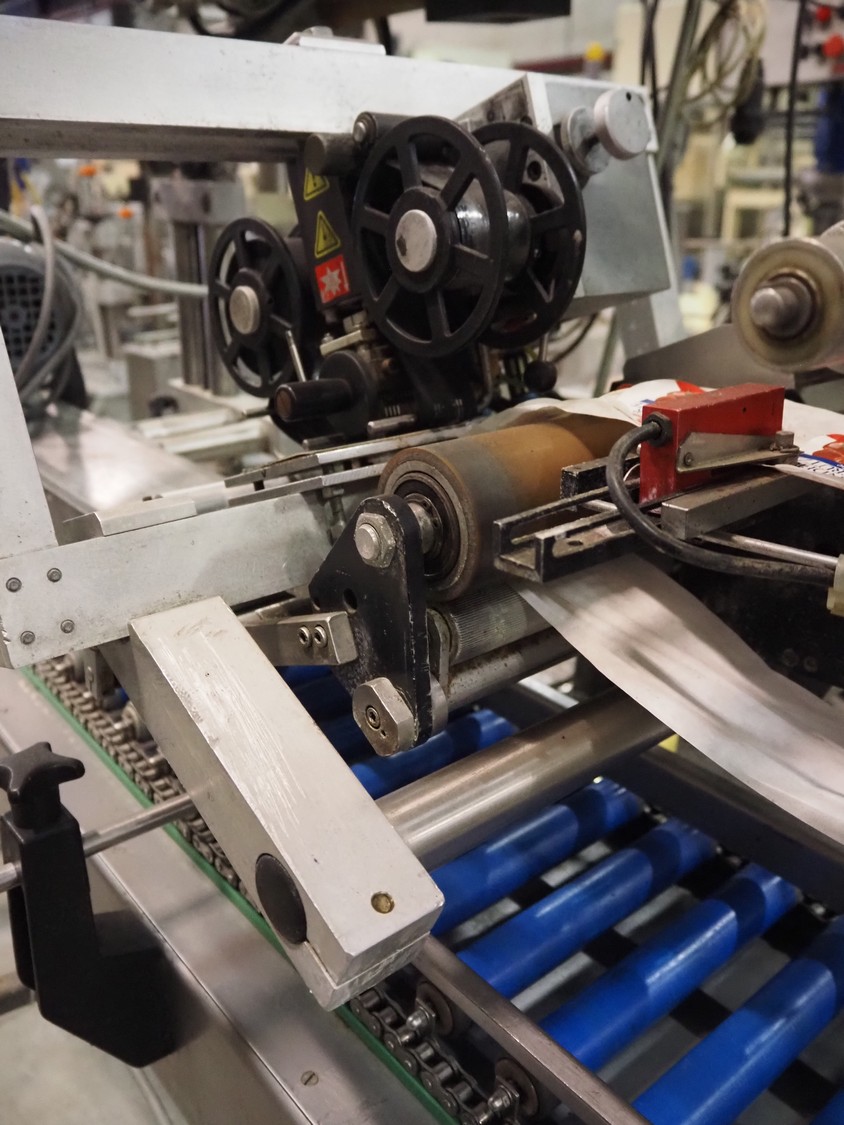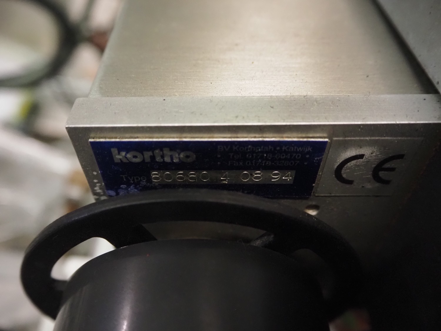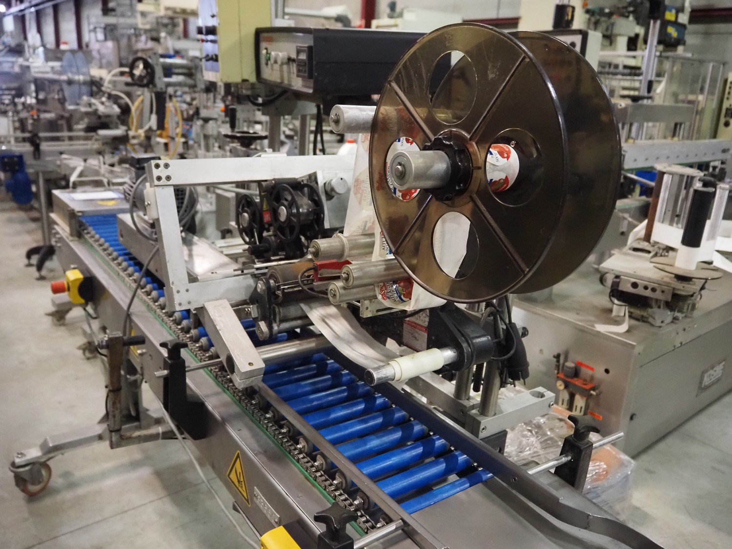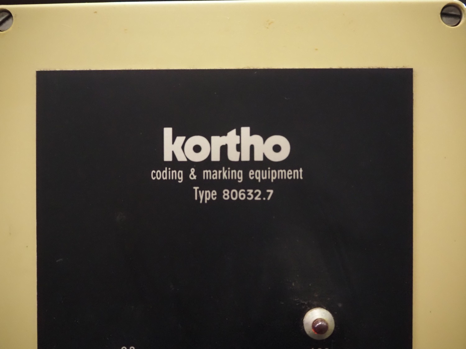 Eshuis BV mobile labelling machine with Kortho Labeler, type labeler: 80680 4 08 94, plastic rollers, roller width: 200 mm, labelling width: 75 mm, total dimensions: 2350 mm x 900 mm x 1850 mm.