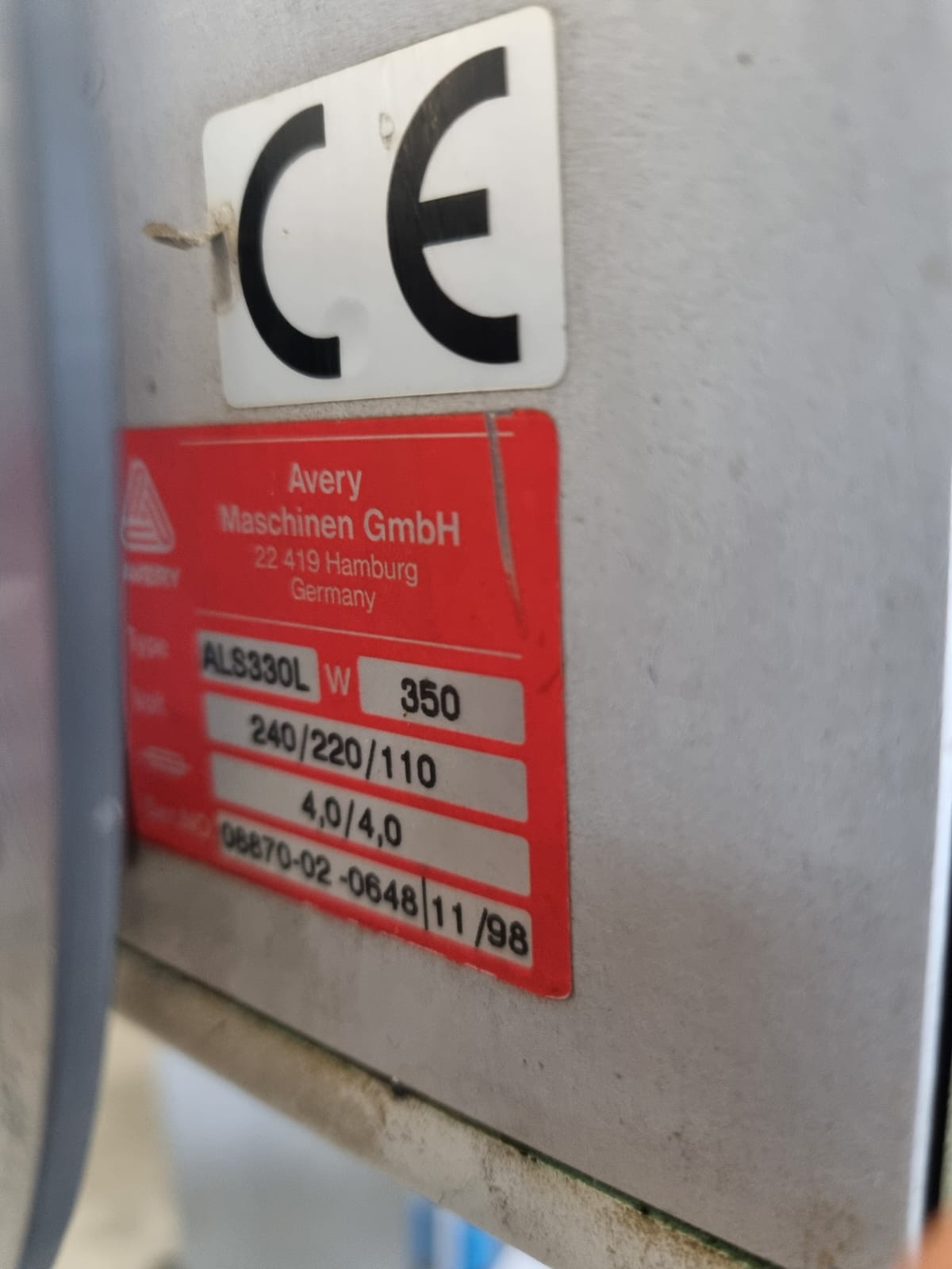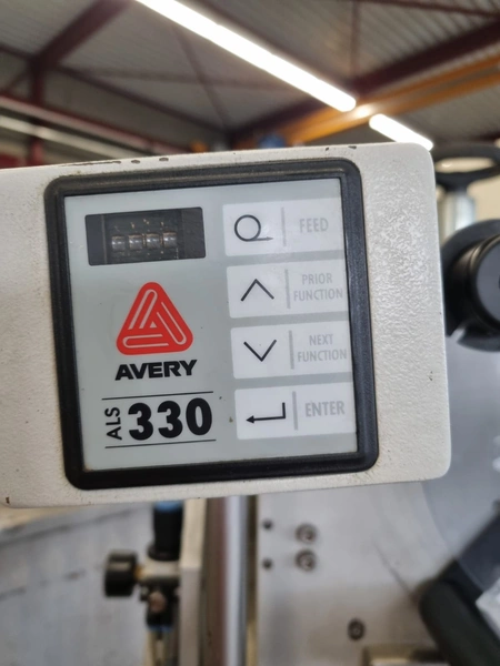 Avery Maschinen GmbH labeller, type: ALS330L, serial number: 08870-02-0648, year of construction: 1998, 240/220/110 V, 4.0 A, 250 W, dimensions: 800 mm x 1000 mm x 2000 mm.
