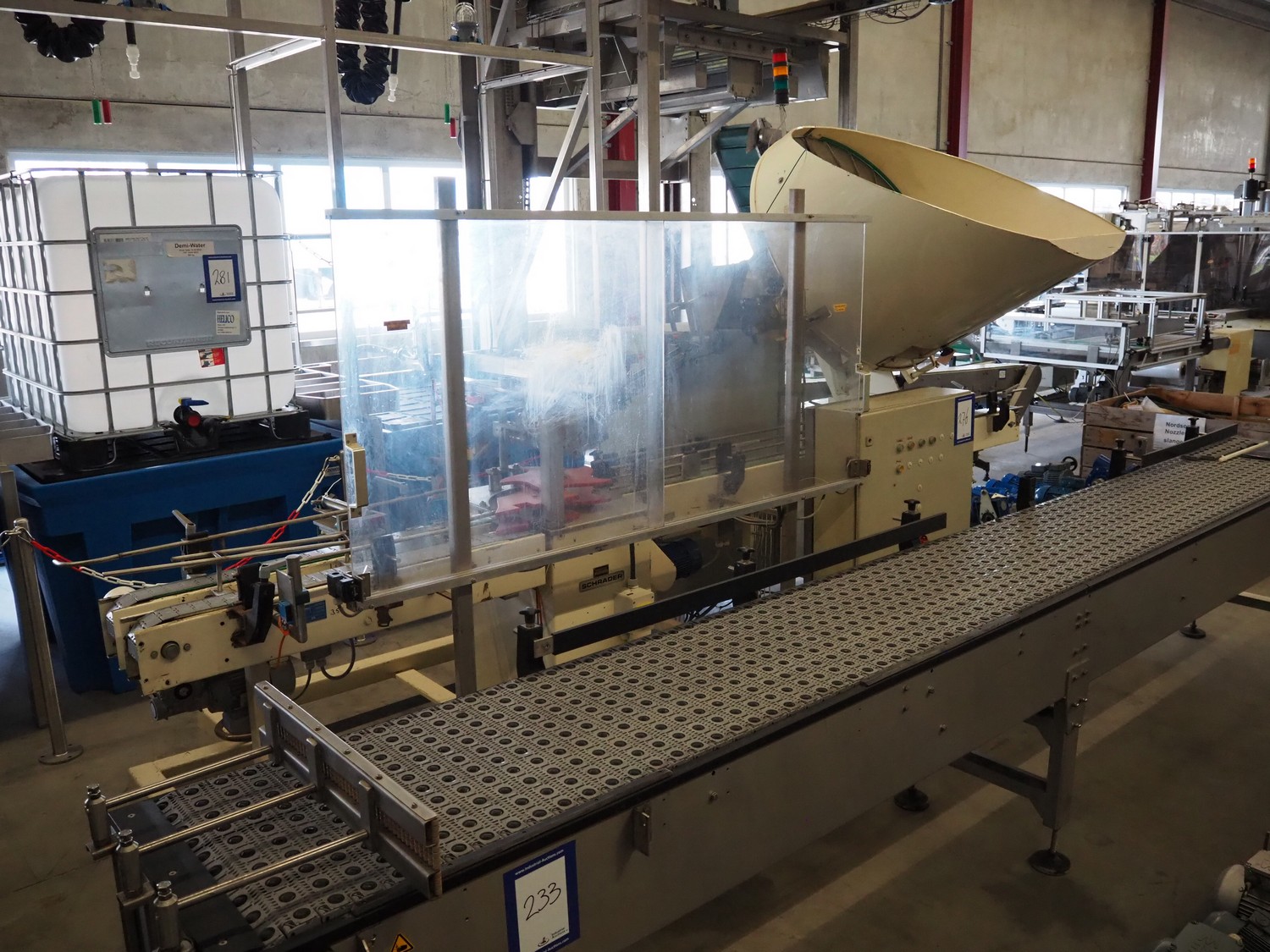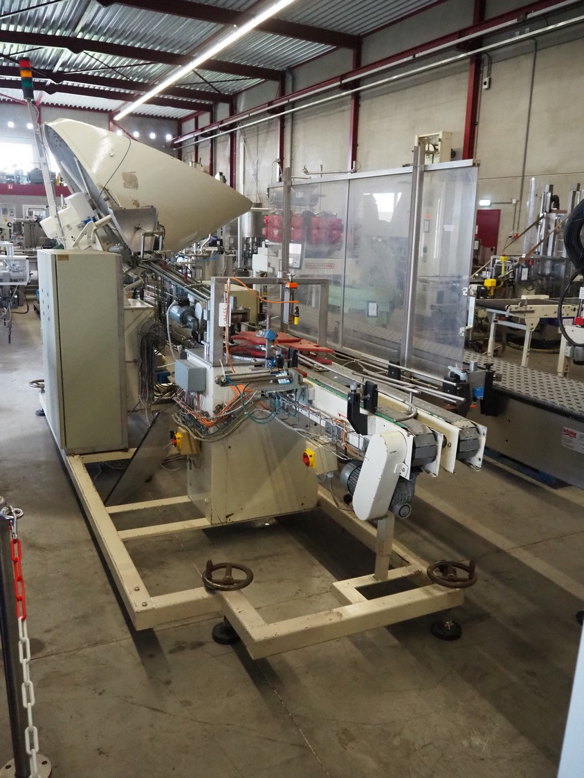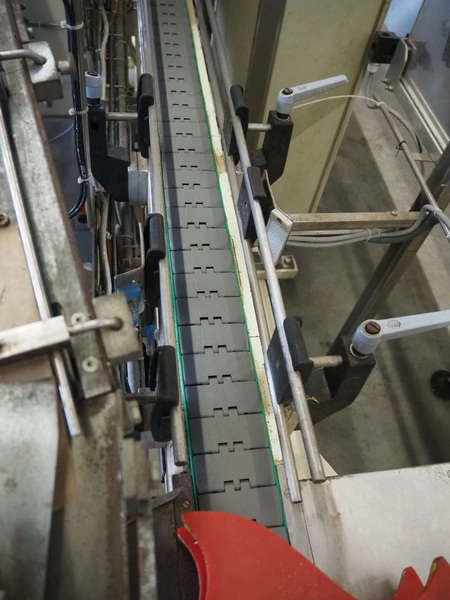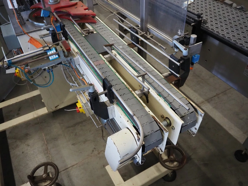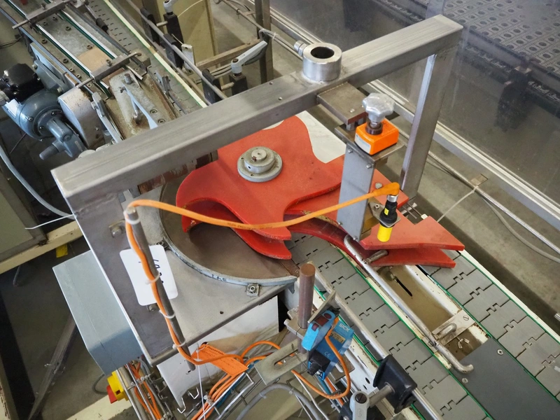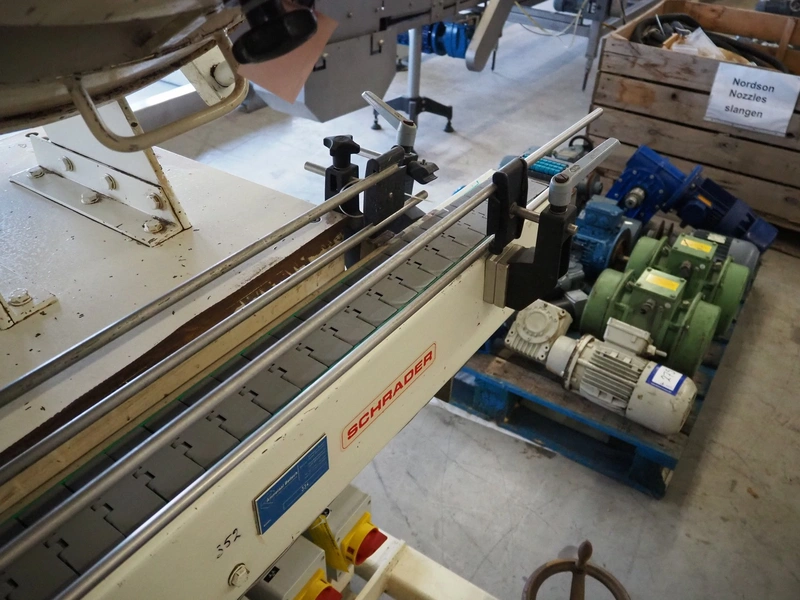 Schrader lid applicator, plastic belt, belt width: 80 mm, total dimensions: 4300 mm x 1400 mm x 2680 mm.