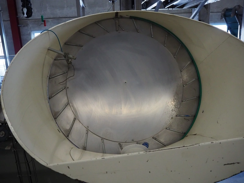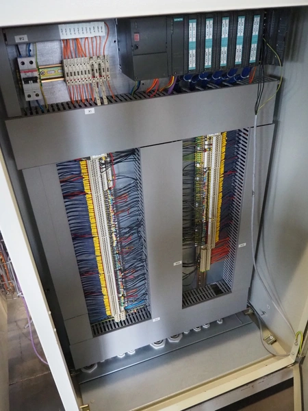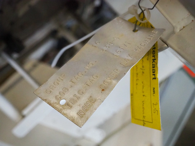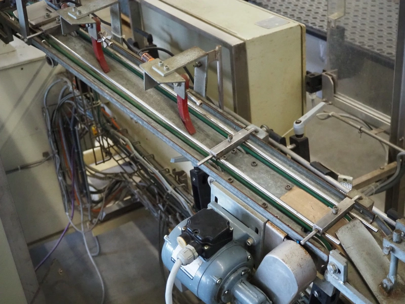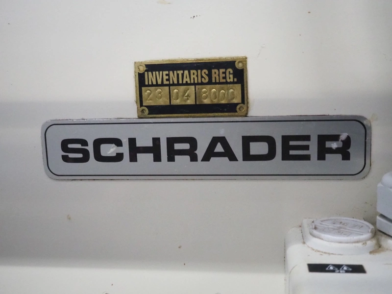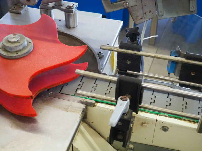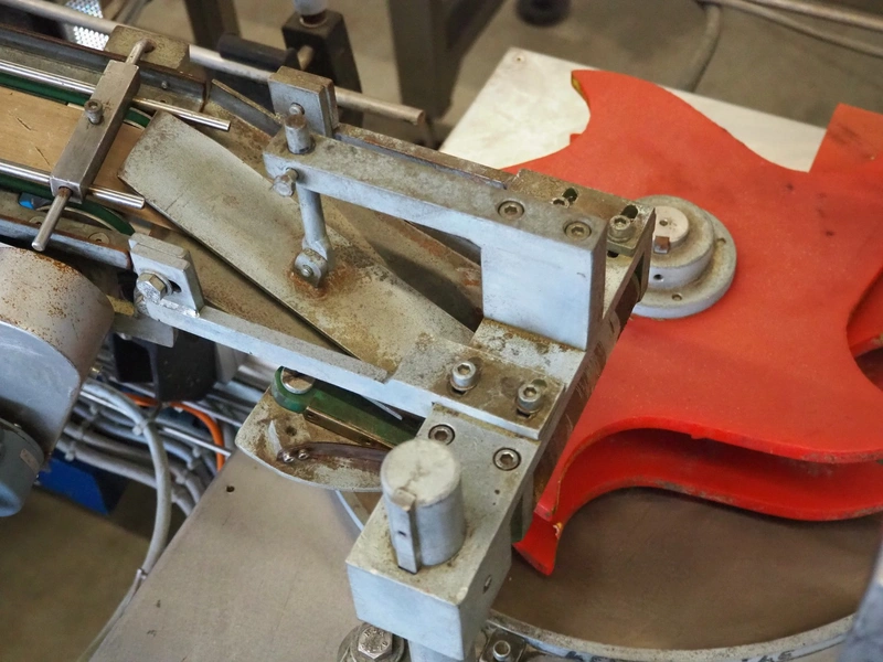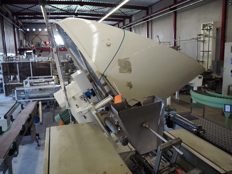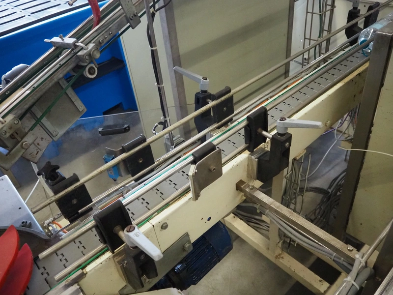 Schrader lid applicator, plastic belt, belt width: 80 mm, total dimensions: 4300 mm x 1400 mm x 2680 mm.