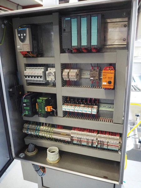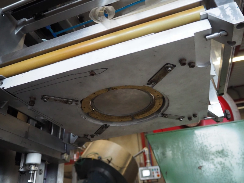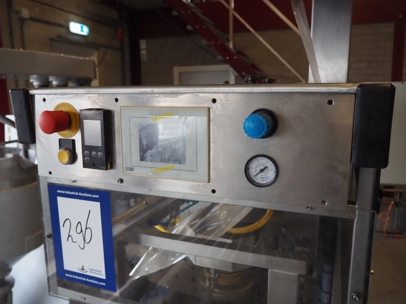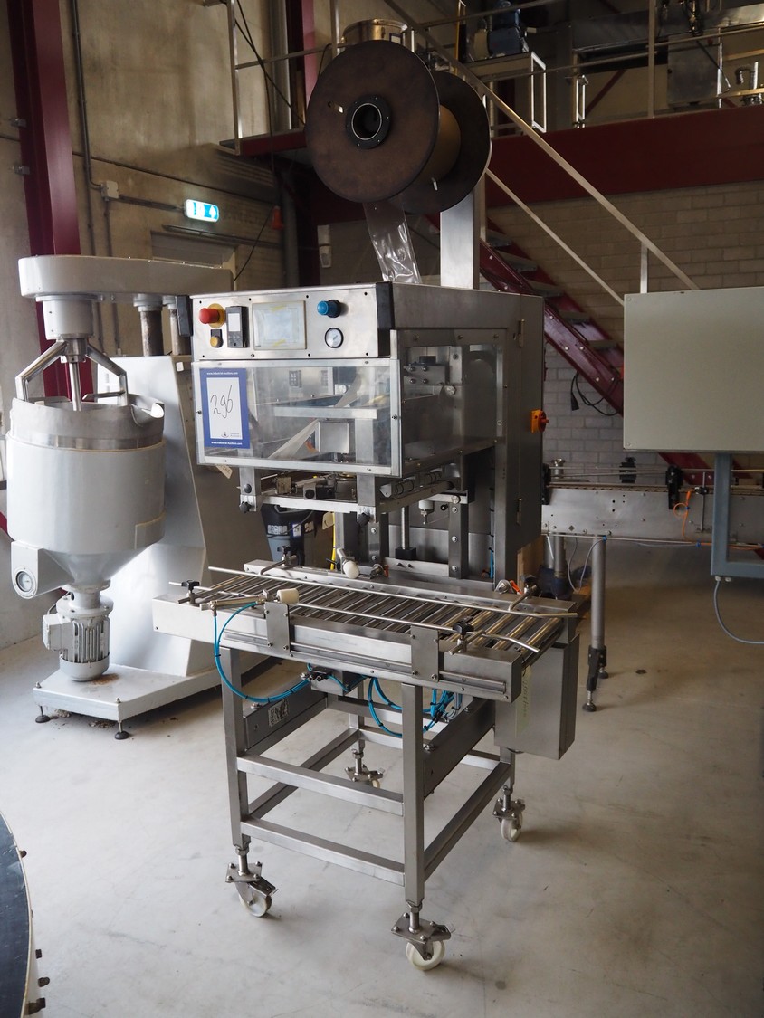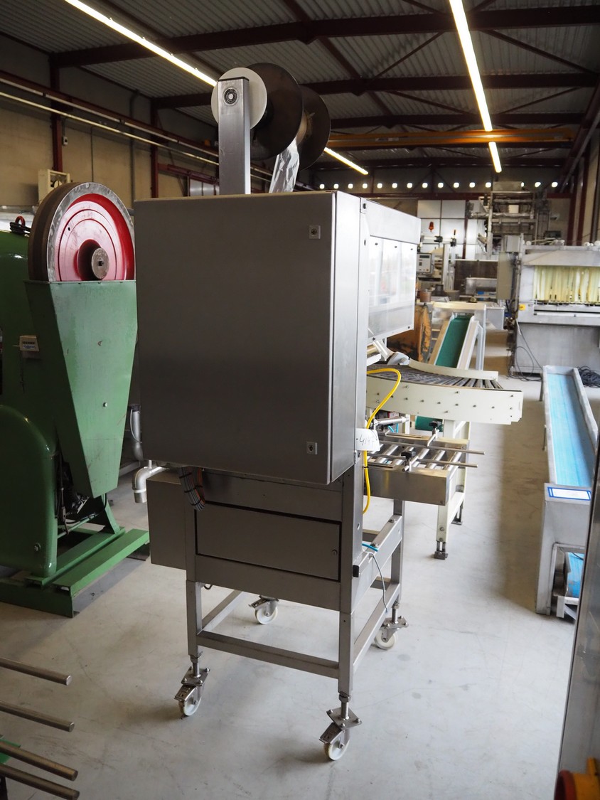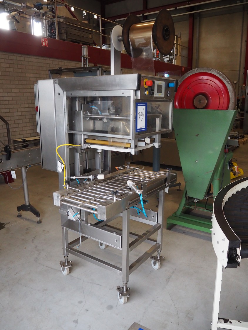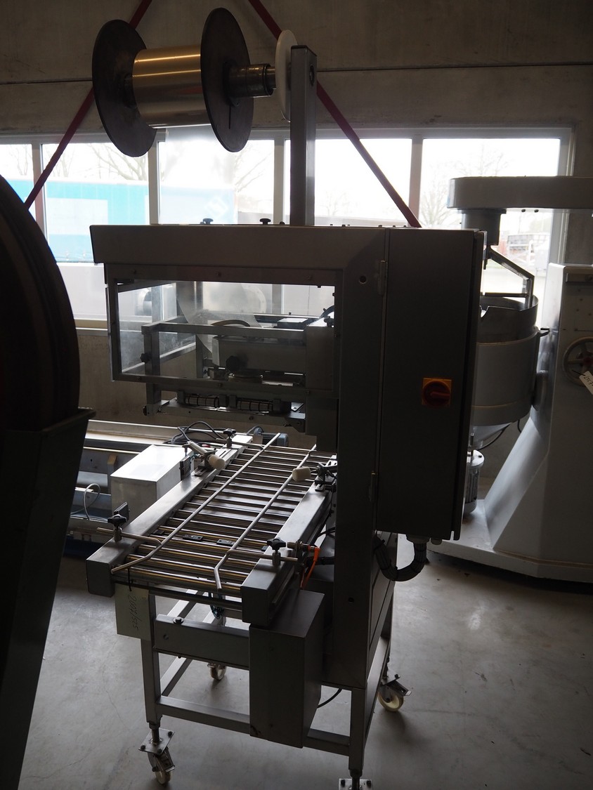 Superfos mobile bucket sealing machine with gassing option, year of construction: 1993, dimensions dye: Ø 205 mm, film width: 210 mm, s/s rollers, roller width: 350 mm, total dimensions: 1200 mm x 980 mm x 2260 mm.