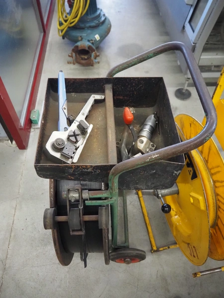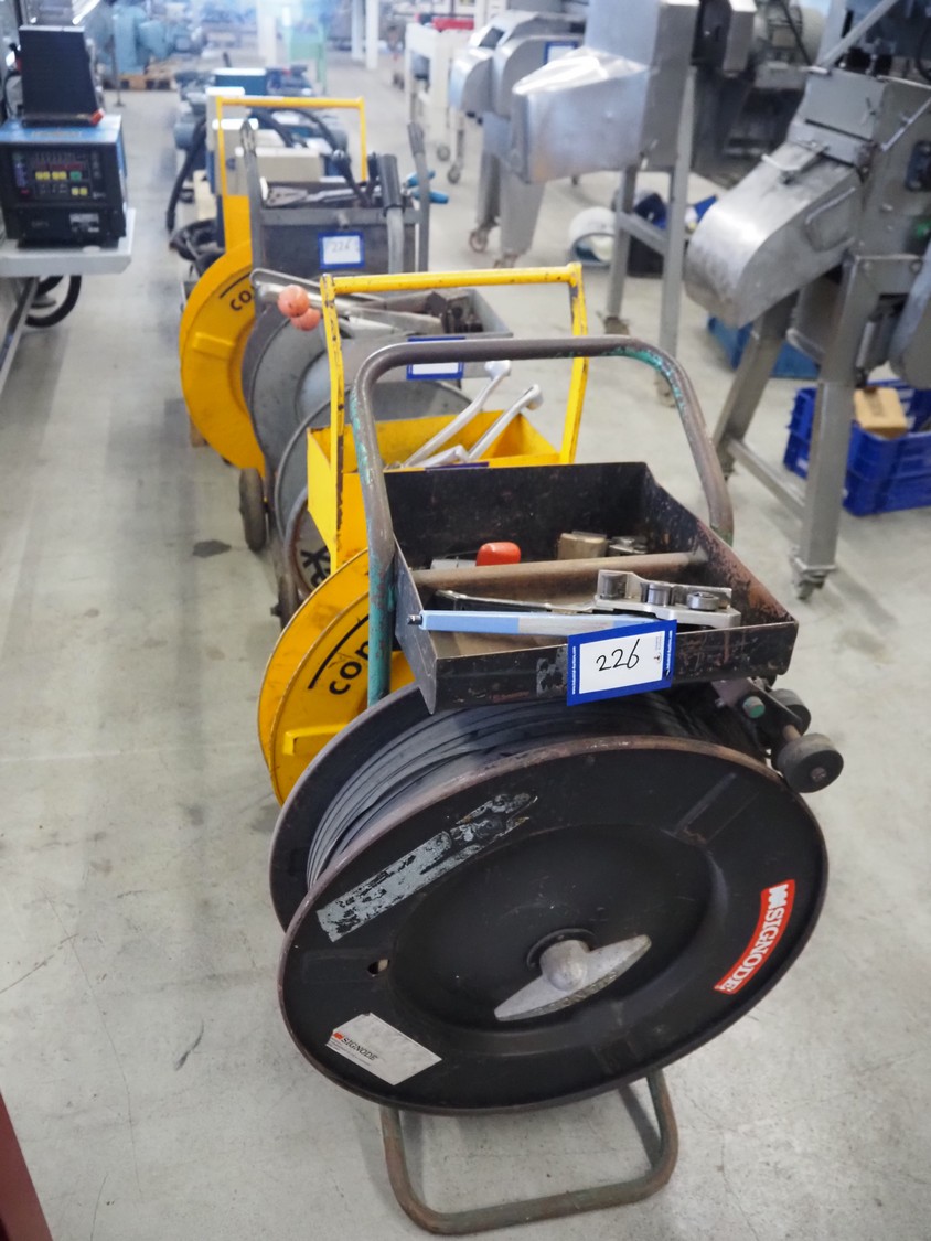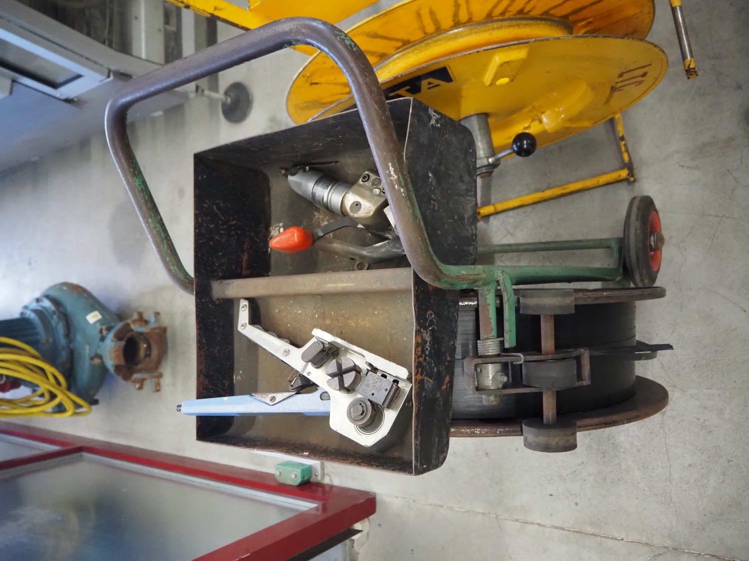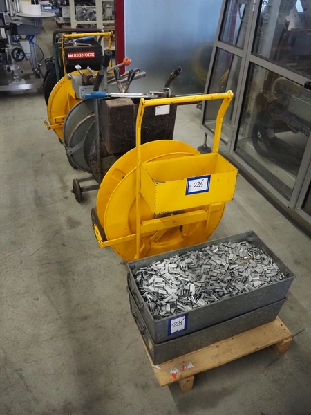 5 Signode steel strapping trolleys, dimensions: (3x) 500 mm x 530 mm x 1000 mm, including 2 steel boxes with clips.