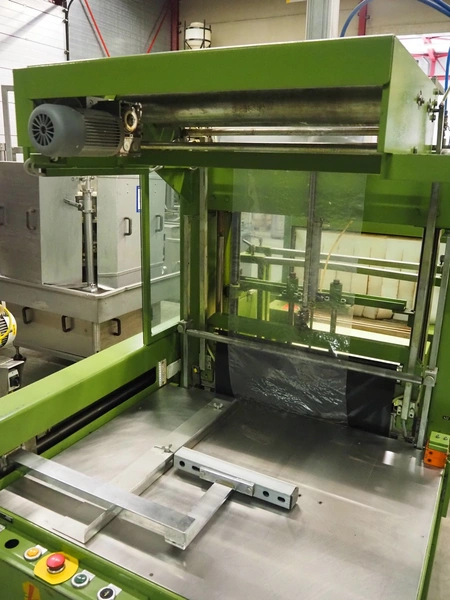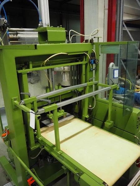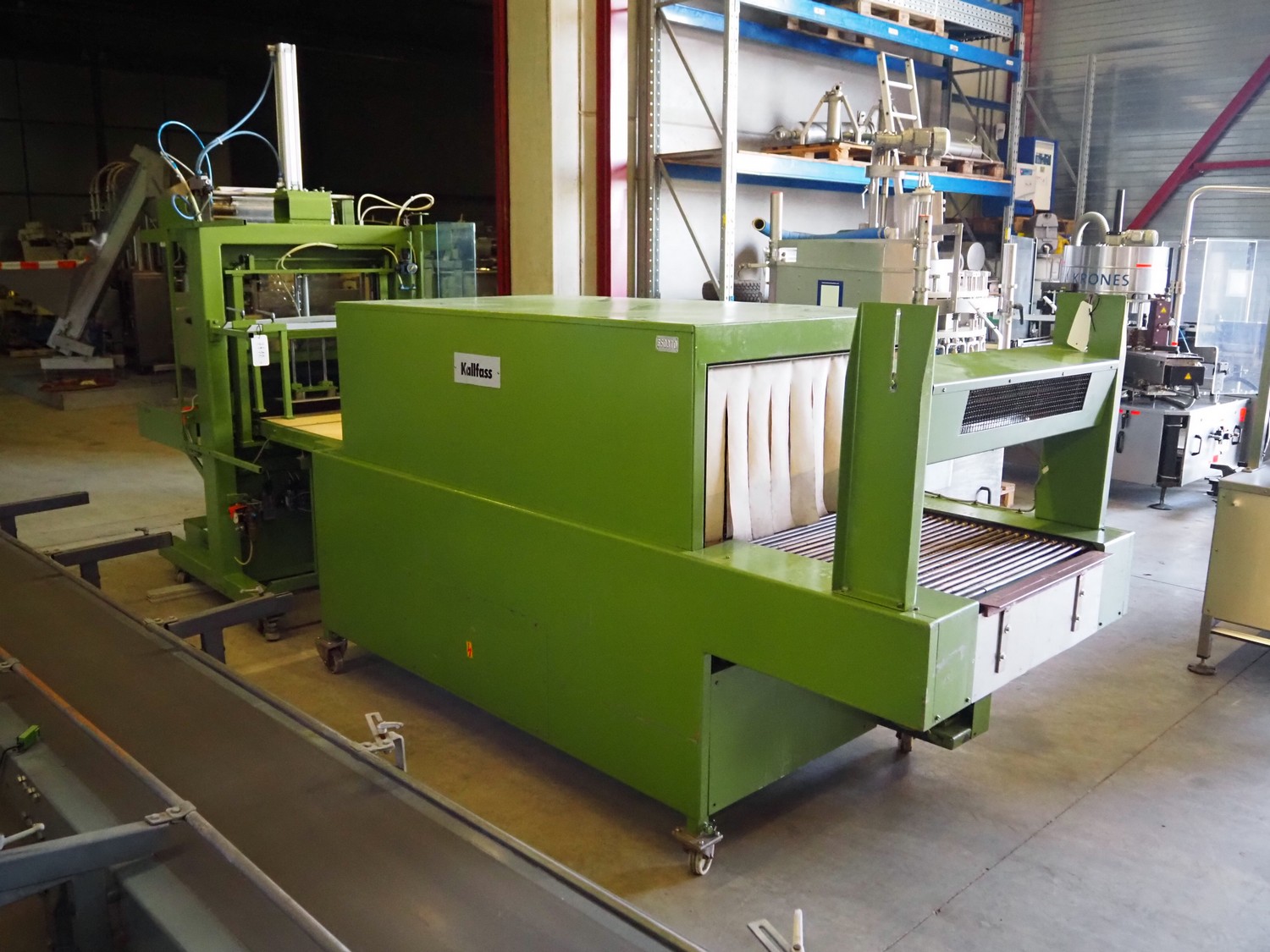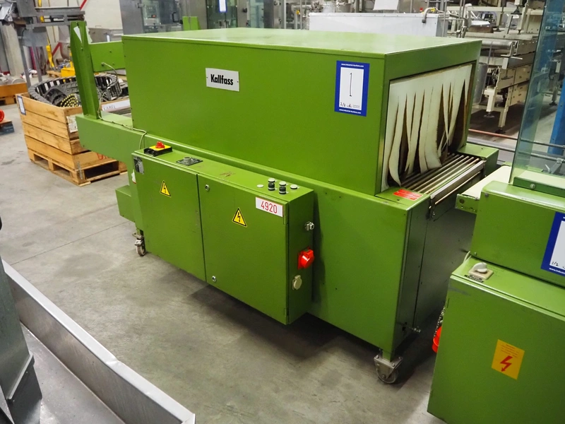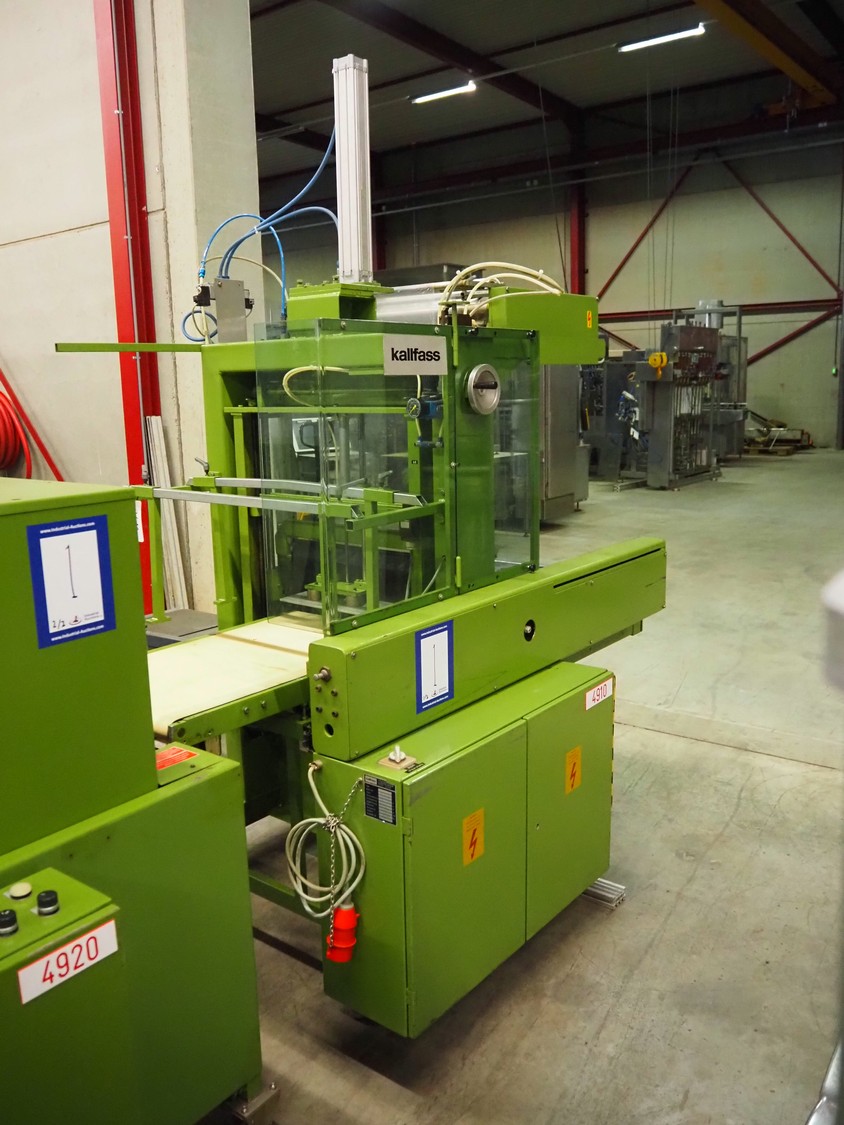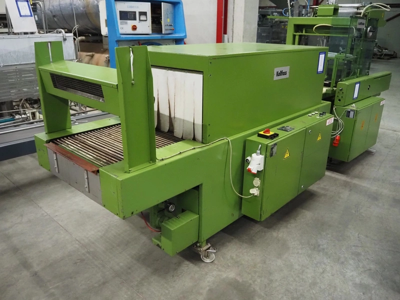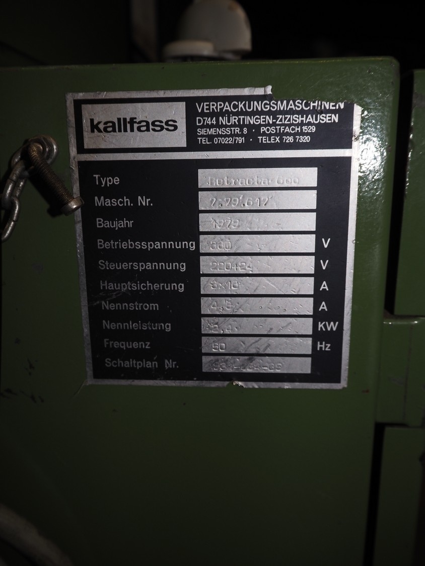 Kalfass GmbH & Co shrink packaging line, consisting of: Kalfass packing machine, type: etracta 600, machine number: 7.79.617, year of construction: 1979, 220/380 V, 50 Hz, 16 A, 2,4 kW, film width: 400 mm, plastic belt width: 500 mm, total dimensions: 1900 mm x 1300 mm x 2600 mm, Kalfass shrinktunnel, type: Universal 650 N, clearance: 650 mm x 450 mm, total dimensions: 2600 mm x 1300 mm x 2600 mm.
