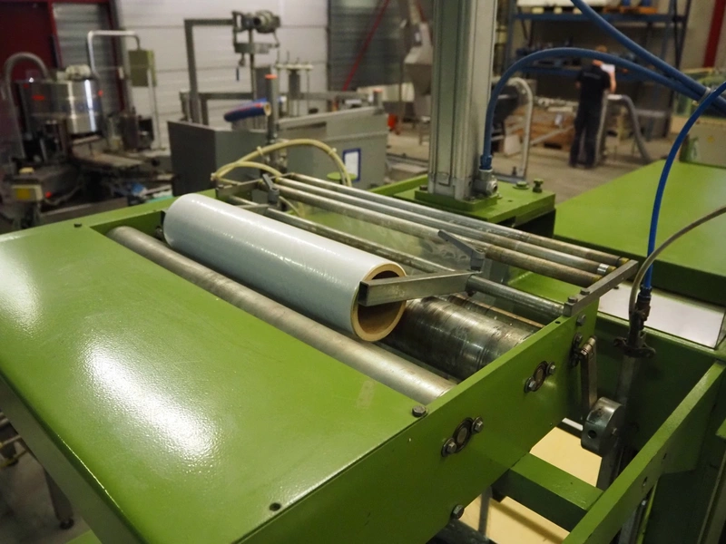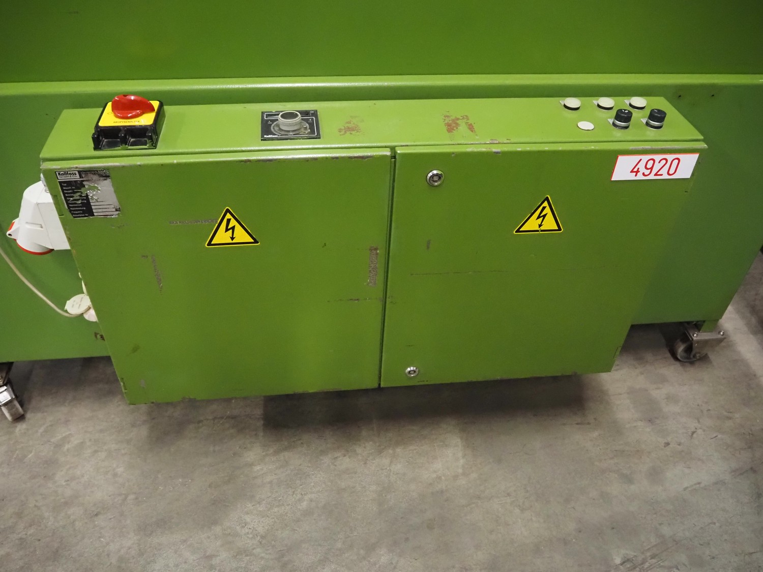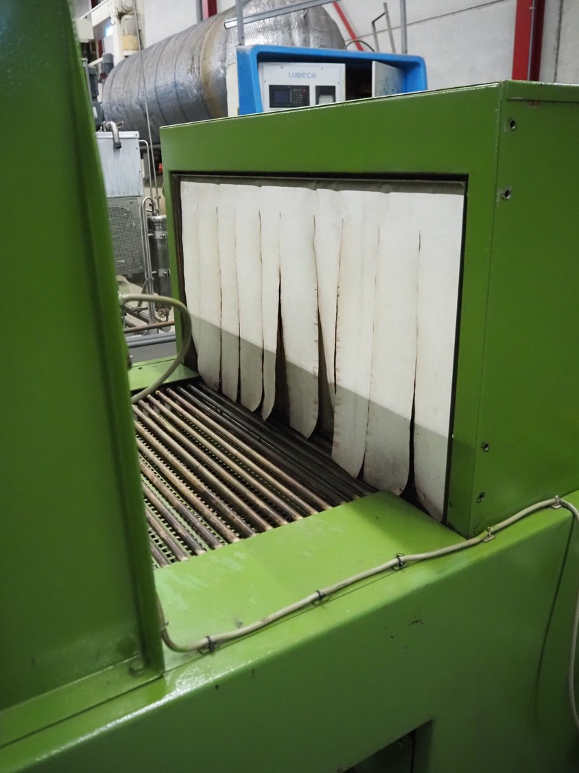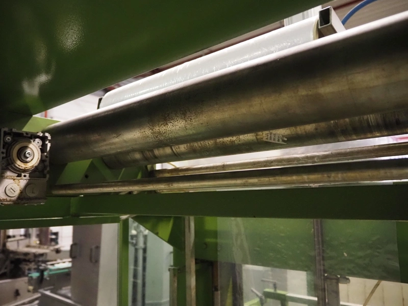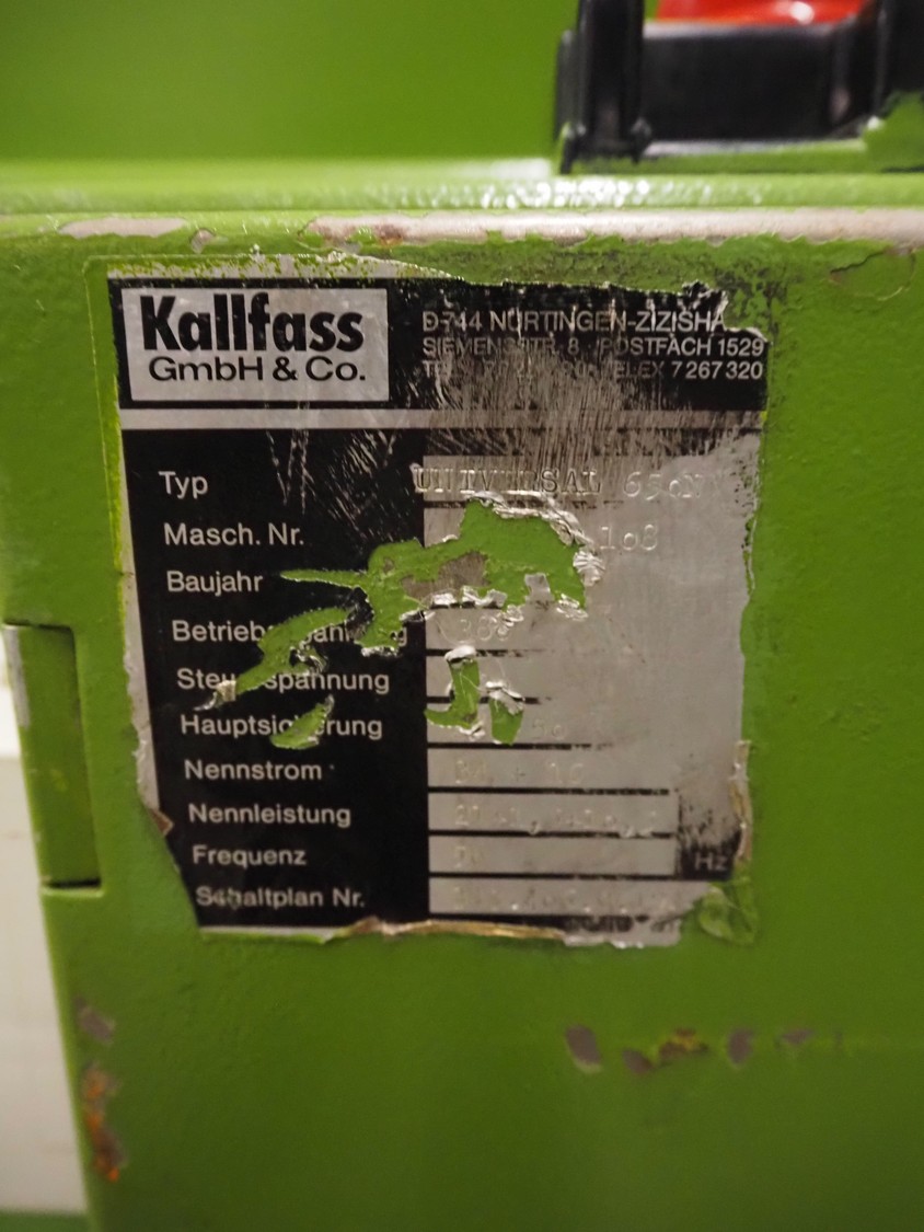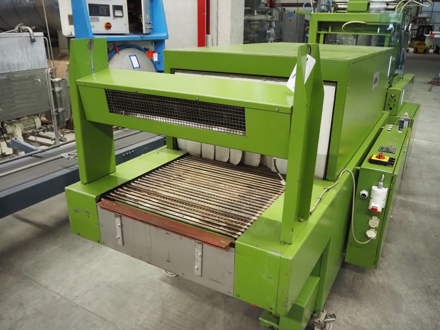 Kalfass GmbH & Co shrink packaging line, consisting of: Kalfass packing machine, type: etracta 600, machine number: 7.79.617, year of construction: 1979, 220/380 V, 50 Hz, 16 A, 2,4 kW, film width: 400 mm, plastic belt width: 500 mm, total dimensions: 1900 mm x 1300 mm x 2600 mm, Kalfass shrinktunnel, type: Universal 650 N, clearance: 650 mm x 450 mm, total dimensions: 2600 mm x 1300 mm x 2600 mm.