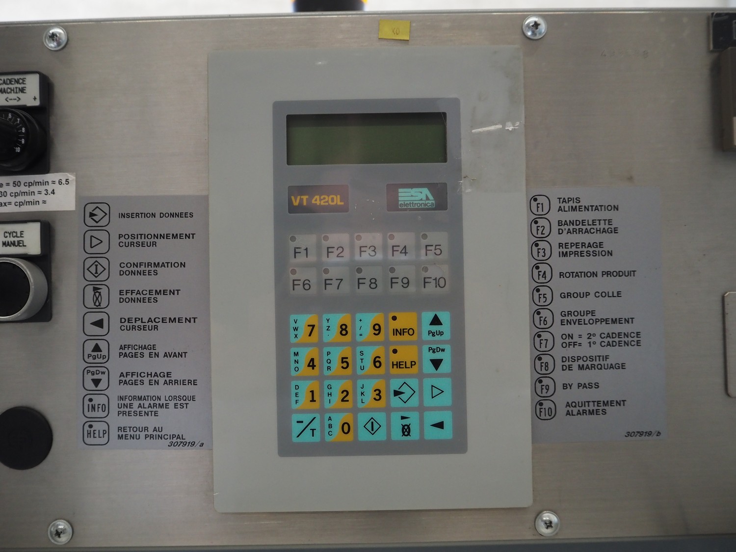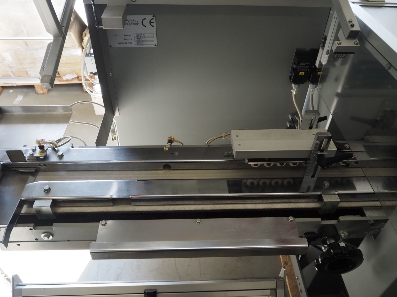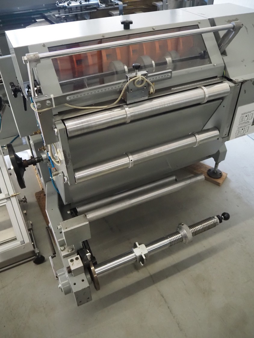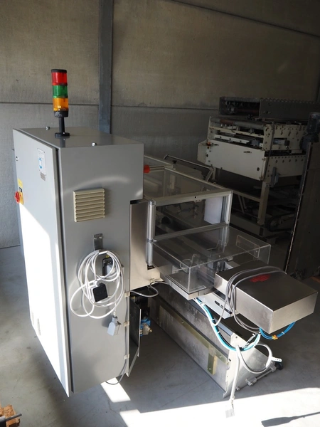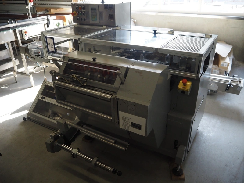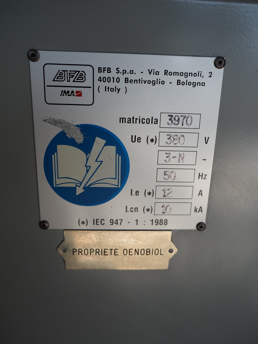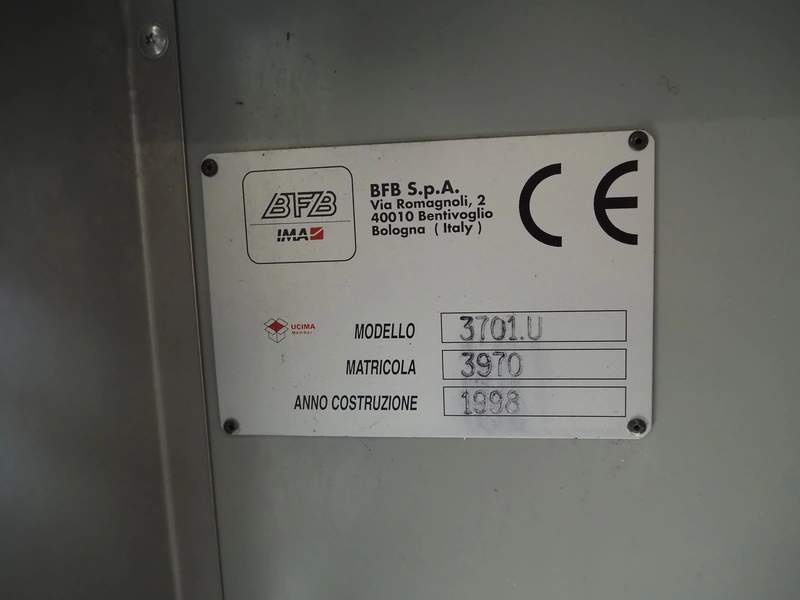 BFB S.p.A. overwrapping machine, model: 3701u, serial number: 3970, 380 V, 3 Ph, 50 Hz, 12 A, 10 kA, belt width: 190 mm, total dimensions: 2600 mm x 1500 mm x 1800 mm. Including transport belt, plastic belt, belt width: 200 mm, total dimensions: 2550 mm x 550 mm x 400 mm.