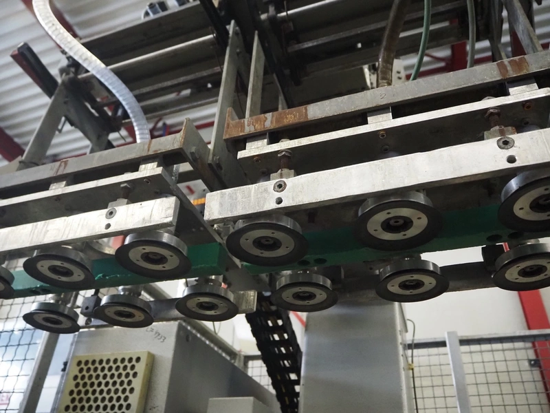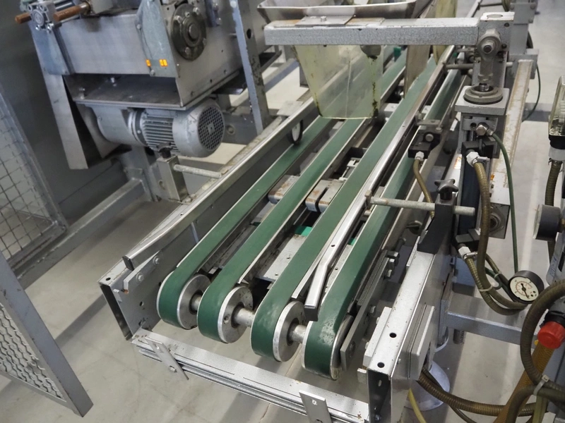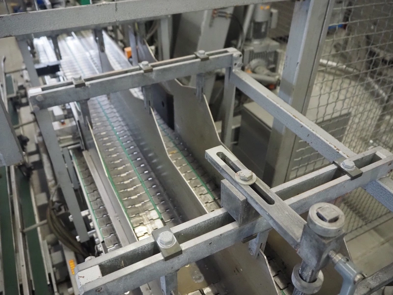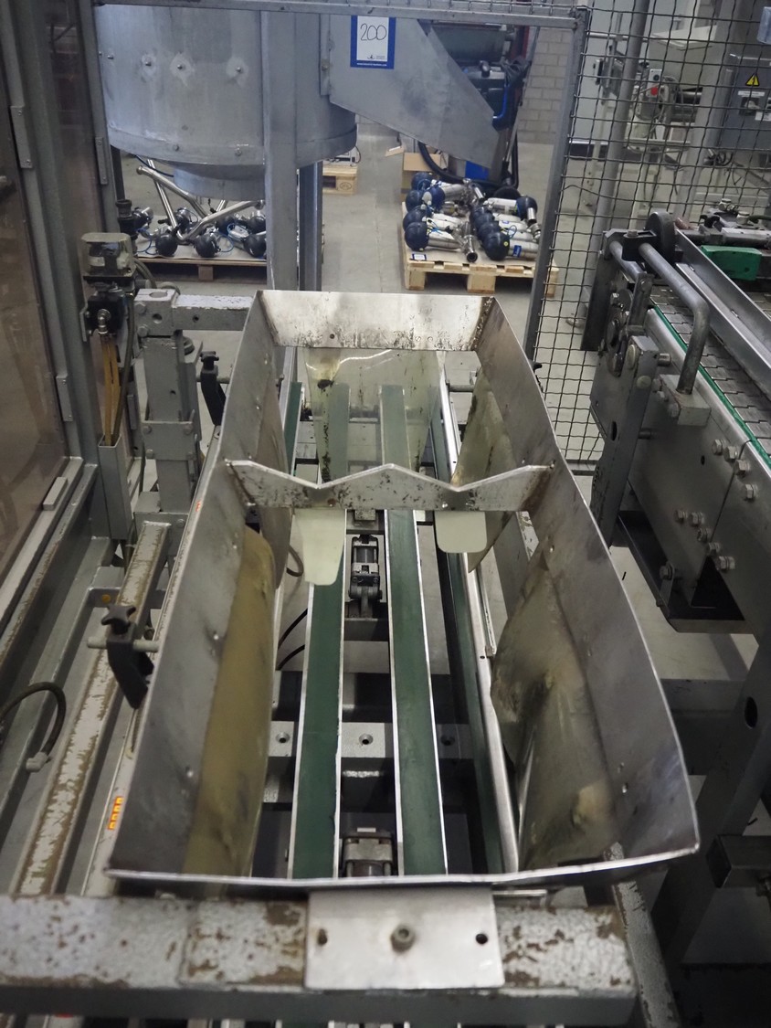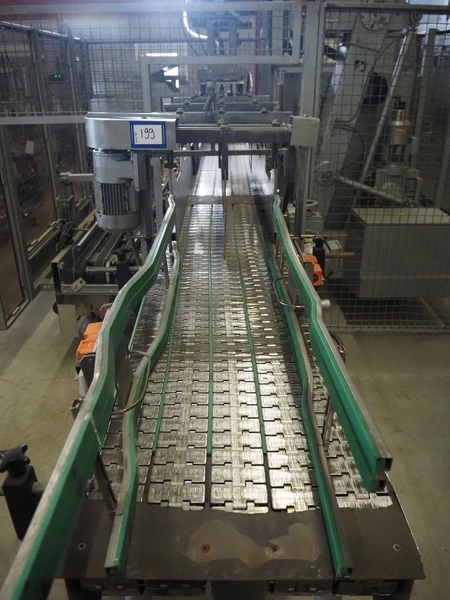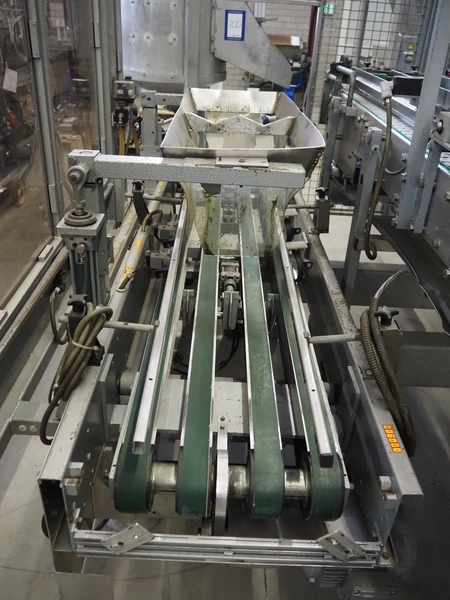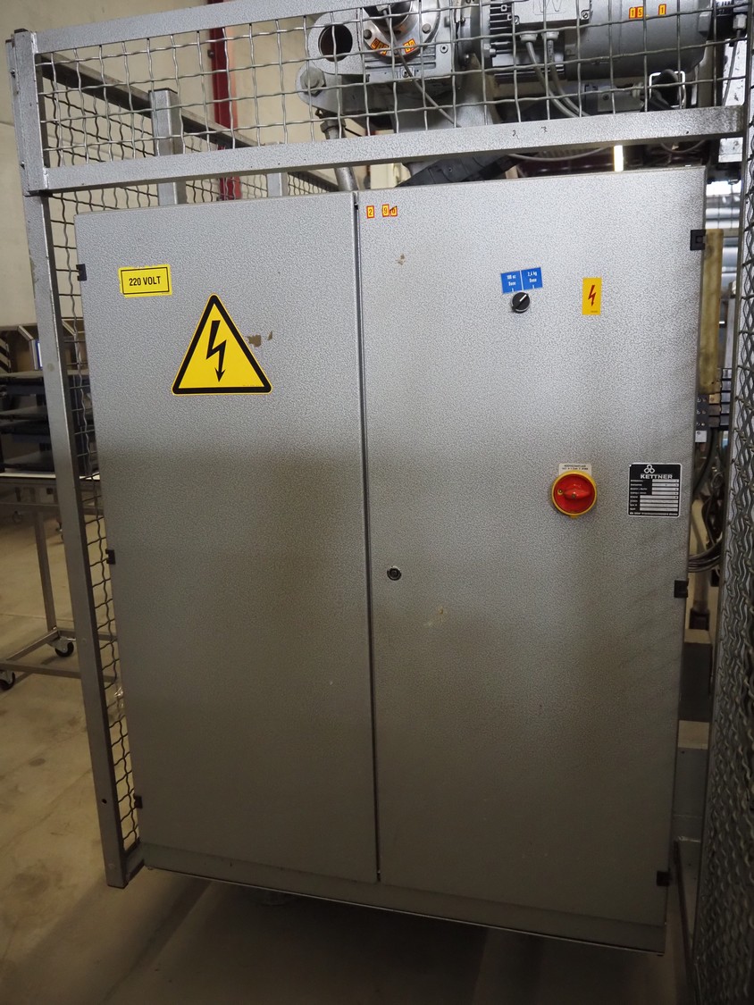 Kettner bottle packing line consisting of: infeed transport belt, s/s belt, belt width: (5x) 80 mm, Kettner packing robot, type: Rob. E2/C-H, year of construction: 1985, 12 suckers, diameter each sucker: 90 mm, outfeed transport belt, plastic belt, belt width: (4x) 50 mm, total dimensions: 4900 mm x 3200 mm x 2660 mm.