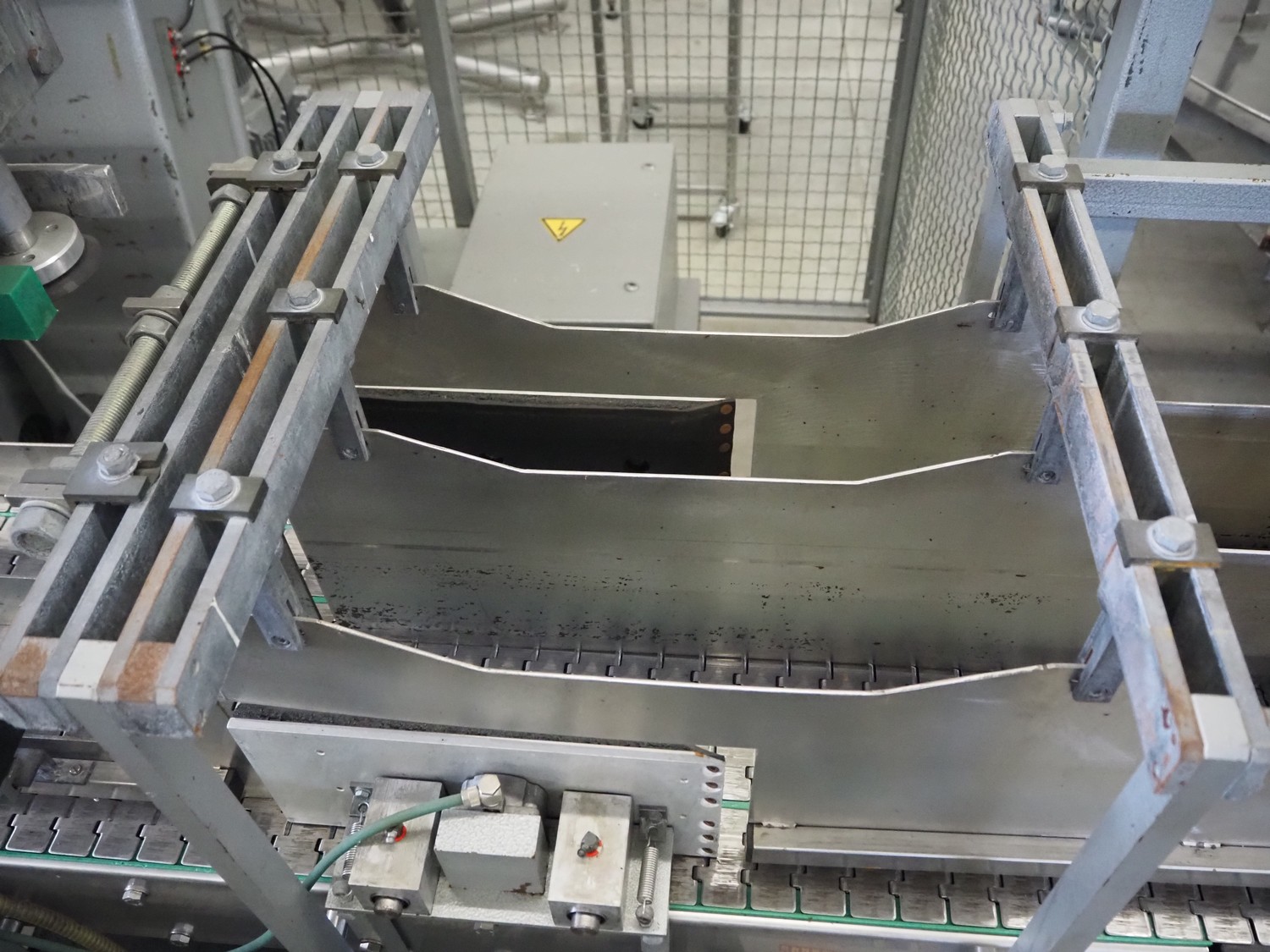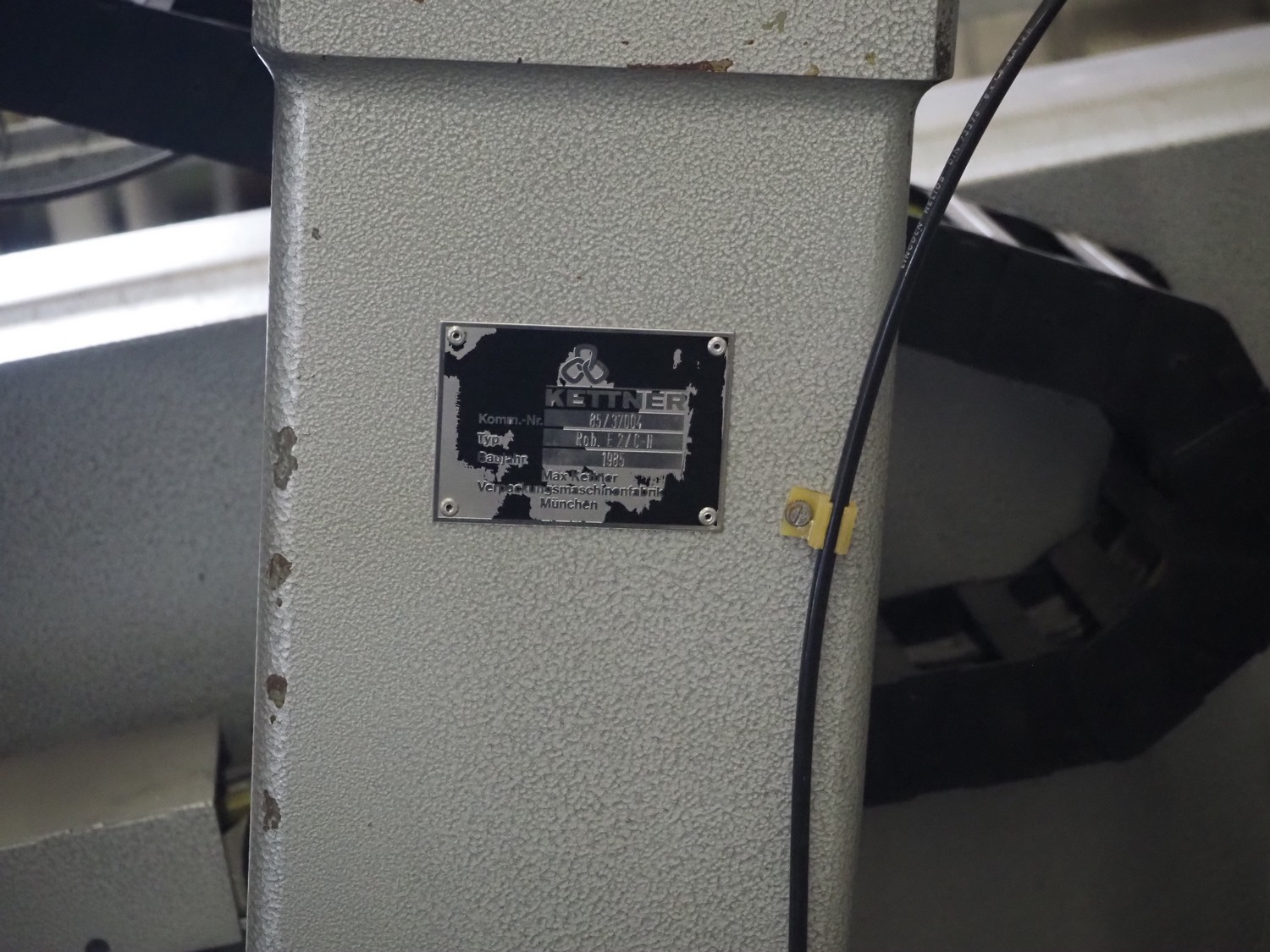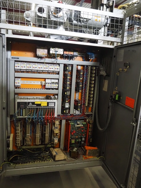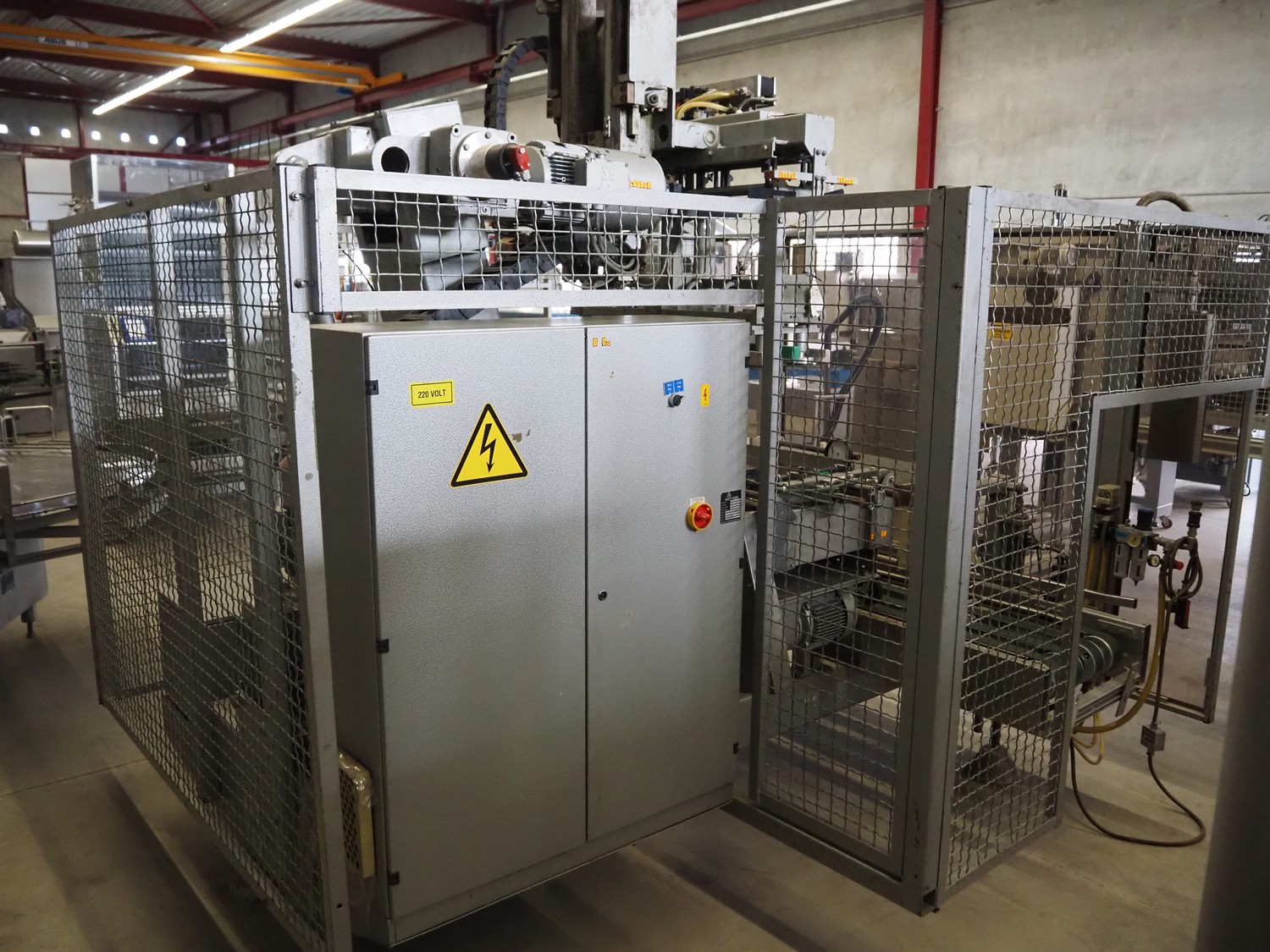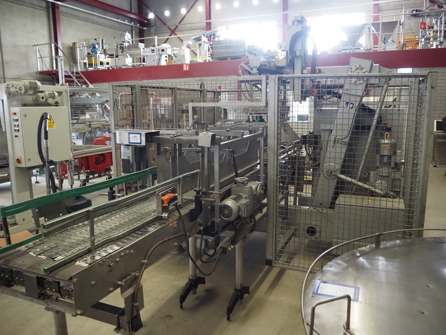 Kettner bottle packing line consisting of: infeed transport belt, s/s belt, belt width: (5x) 80 mm, Kettner packing robot, type: Rob. E2/C-H, year of construction: 1985, 12 suckers, diameter each sucker: 90 mm, outfeed transport belt, plastic belt, belt width: (4x) 50 mm, total dimensions: 4900 mm x 3200 mm x 2660 mm.