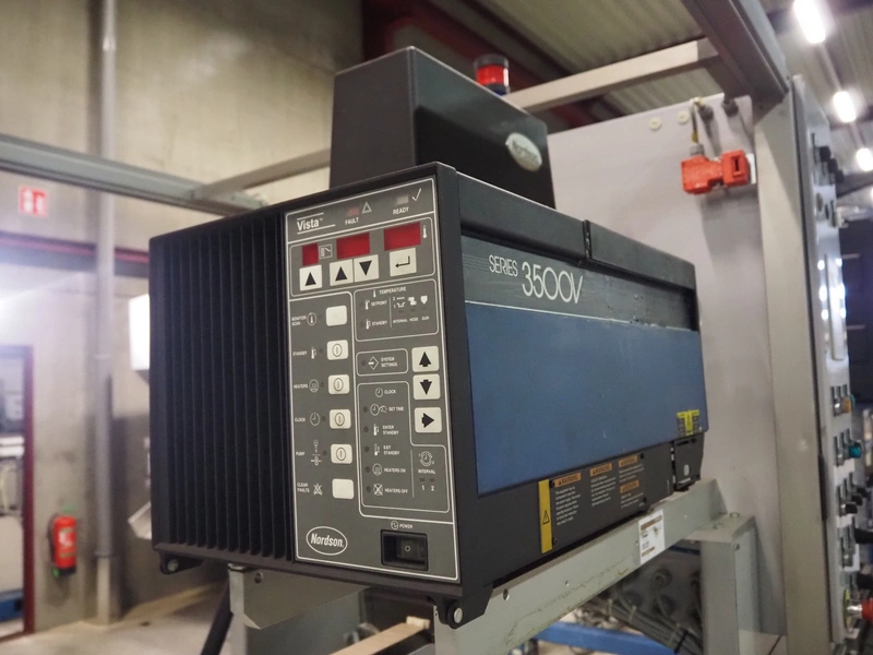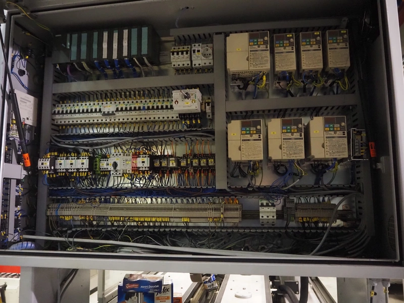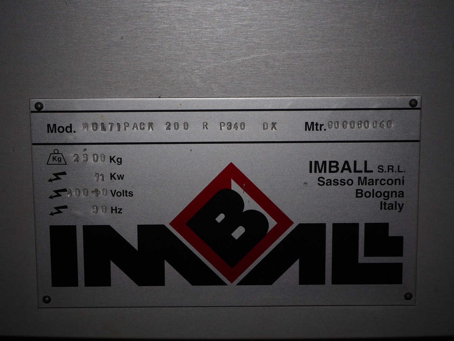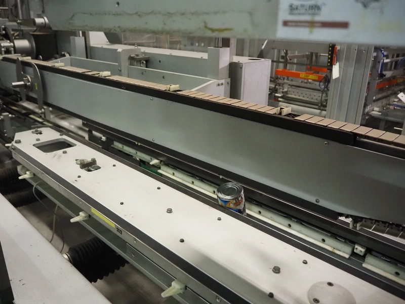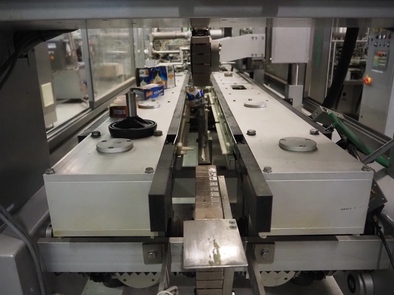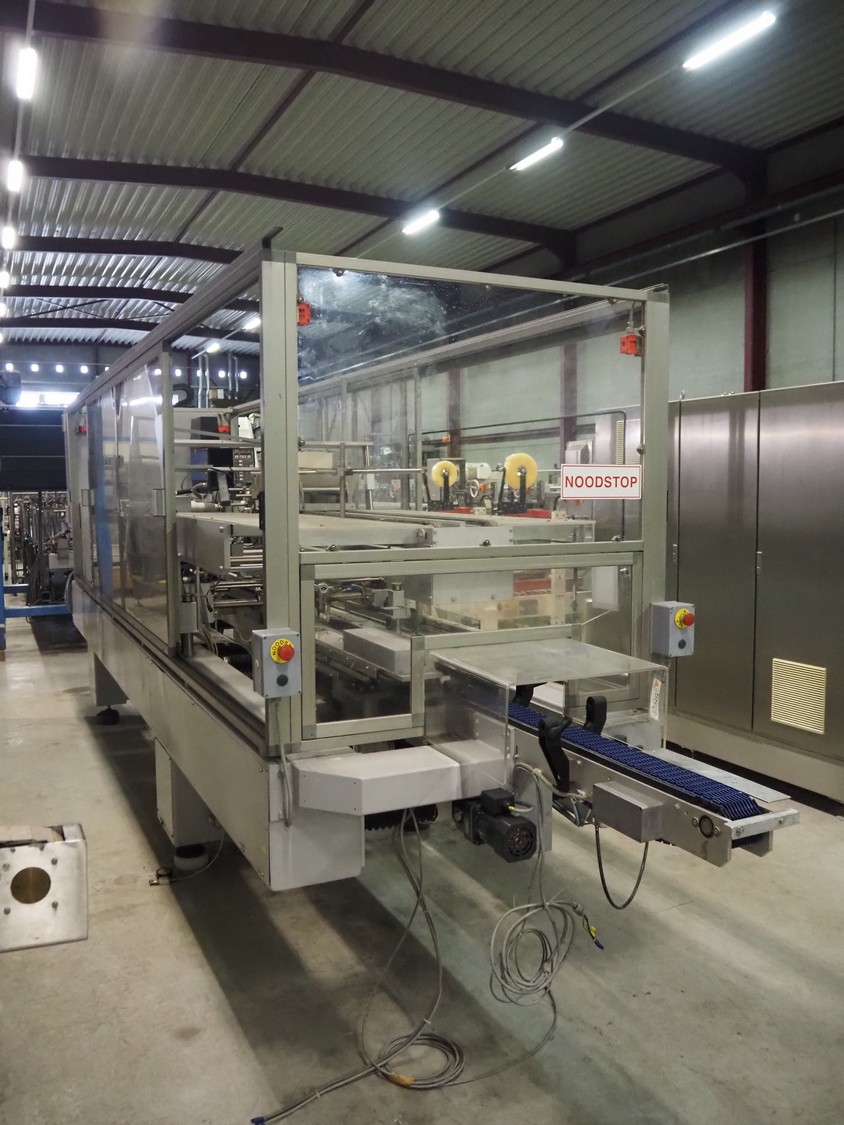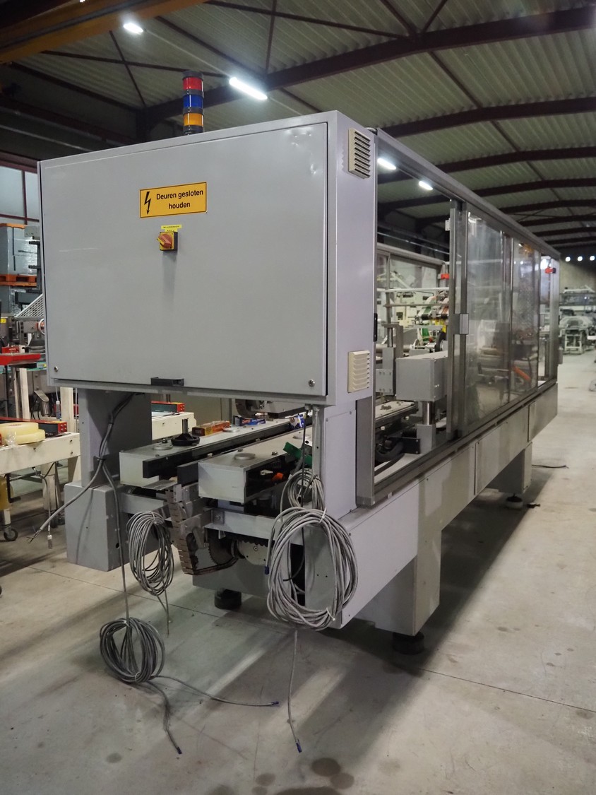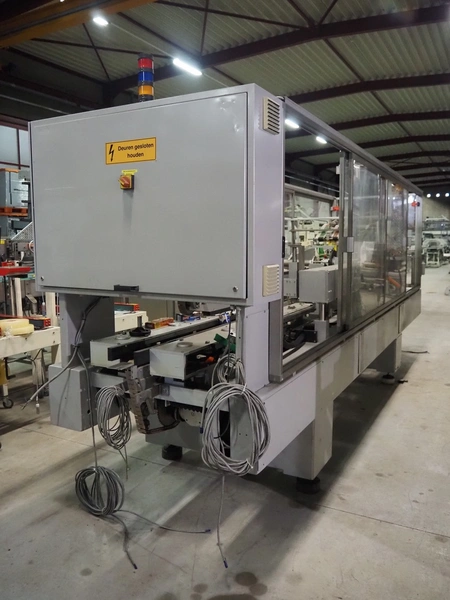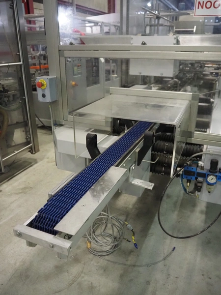 Imball SRL carton sleever machine, model: Multipack 200 R P340 DX, serial number: 909080040, 400 V, 50 Hz, 11 kW, weight: 2500 kg, clearance: 275 mm x 250 mm, plastic lane with dividers, lane width: 90 mm, distance between dividers: 350 mm, plastic outfeed belt, belt width: 90 mm, with Nordson glue unit, model: Series 3500 V, total dimensions: 7000 mm x 1400 mm x 2500 mm.