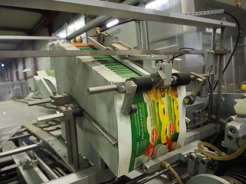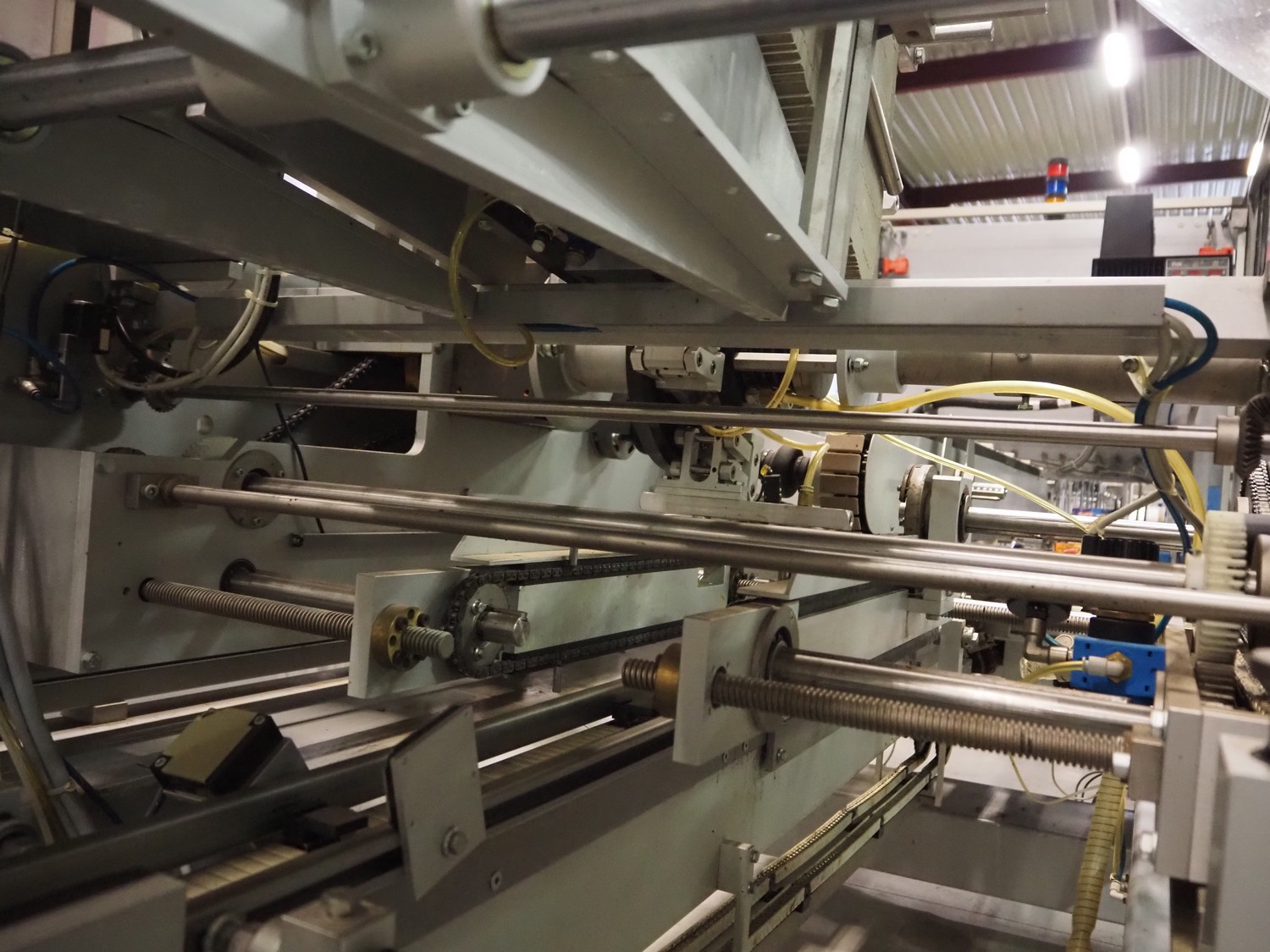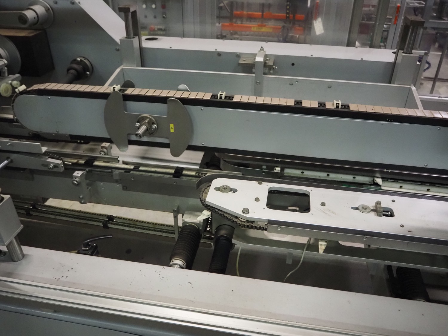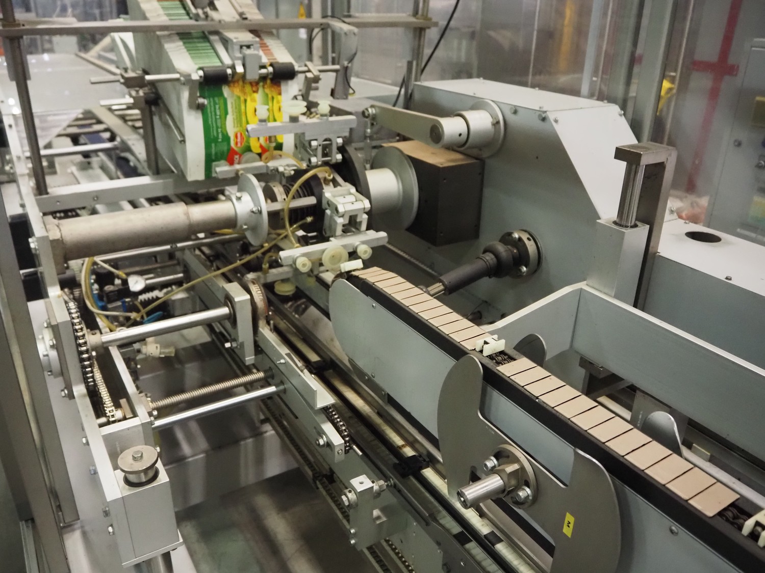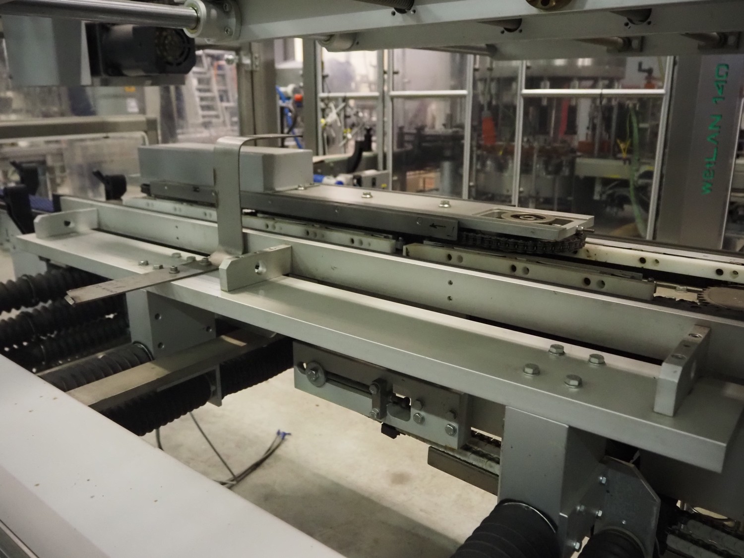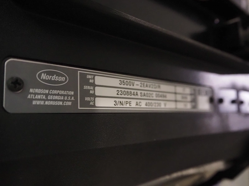 Imball SRL carton sleever machine, model: Multipack 200 R P340 DX, serial number: 909080040, 400 V, 50 Hz, 11 kW, weight: 2500 kg, clearance: 275 mm x 250 mm, plastic lane with dividers, lane width: 90 mm, distance between dividers: 350 mm, plastic outfeed belt, belt width: 90 mm, with Nordson glue unit, model: Series 3500 V, total dimensions: 7000 mm x 1400 mm x 2500 mm.