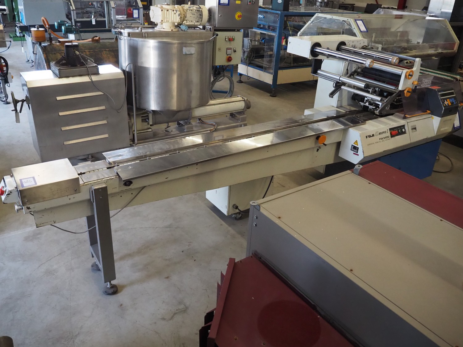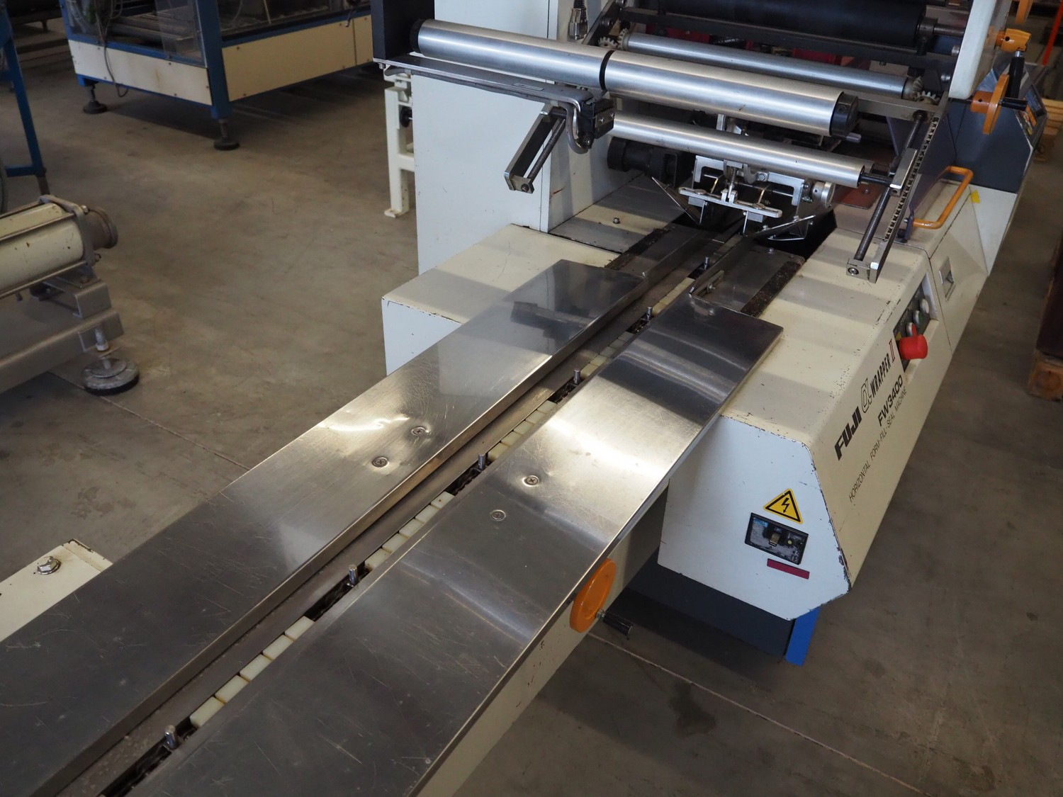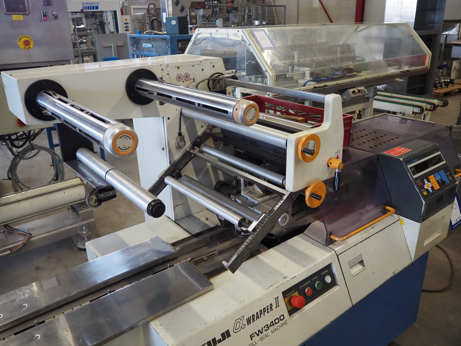 Fuji flowpacker, model: WRAPPER II, type: FW3400, seal width: 200 mm, plastic belt, belt width: 160 mm, total dimensions: 4400 mm x 1000 mm x 1500 mm.