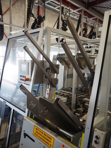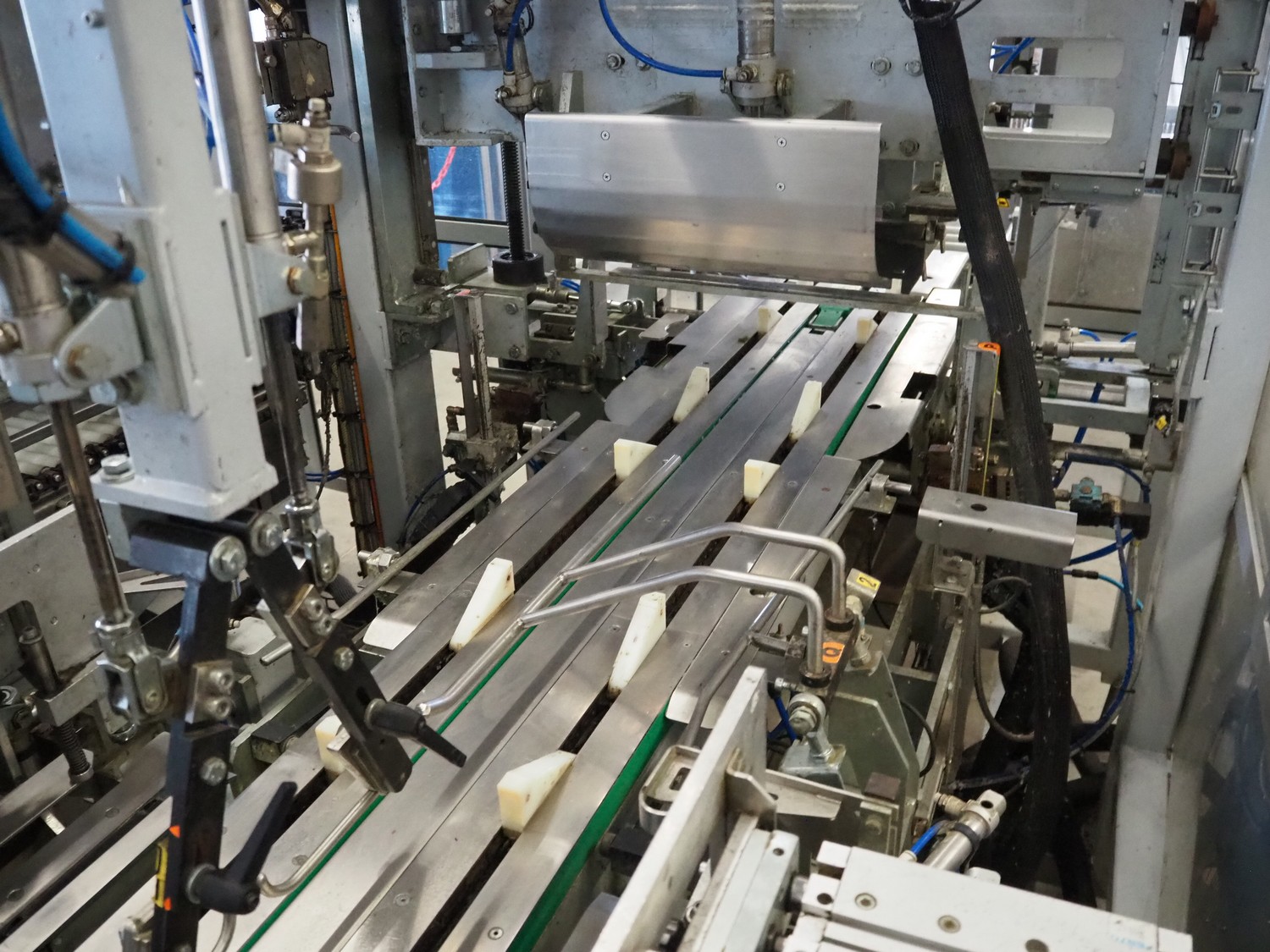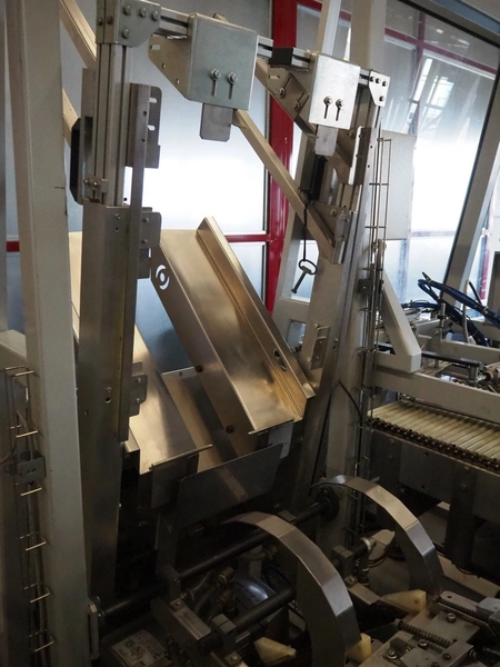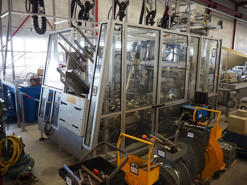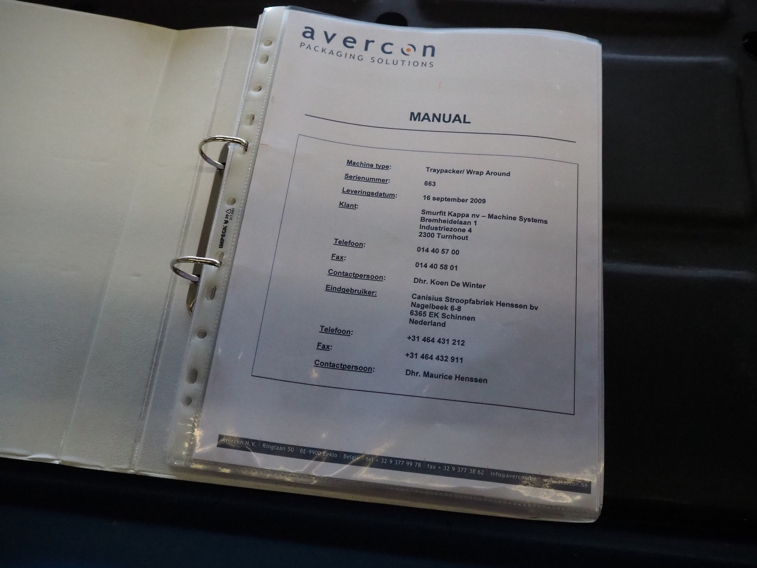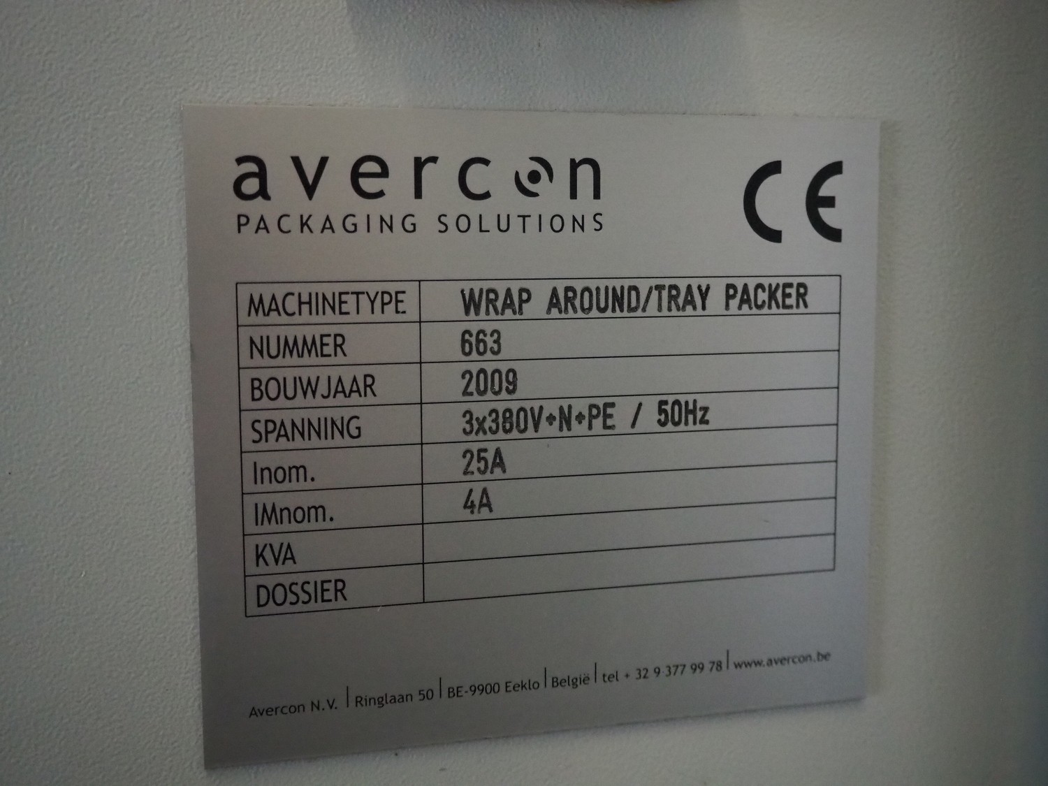 Avercon packaging machine, type: WRAP AROUND/TRAY PACKER, number: 663, year of construction: 2009, 380 V, 3 Ph, 50 Hz, 25 A, clearance denester: 480 mm x 560 mm, belt with dividers, clearance belt: 350 mm x 290 mm, plastic rollers, roller width: 550 mm, total dimensions: 4100 mm x 2700 mm x 2420 mm. Product: Apple sirup, 2 types of trays: 350 gram, Ø 94 mm, height: 82 mm, speed: 80 pcs / minute and 450 gram, Ø 94 mm, height: 103 mm, speed: 80 pcs/minute,