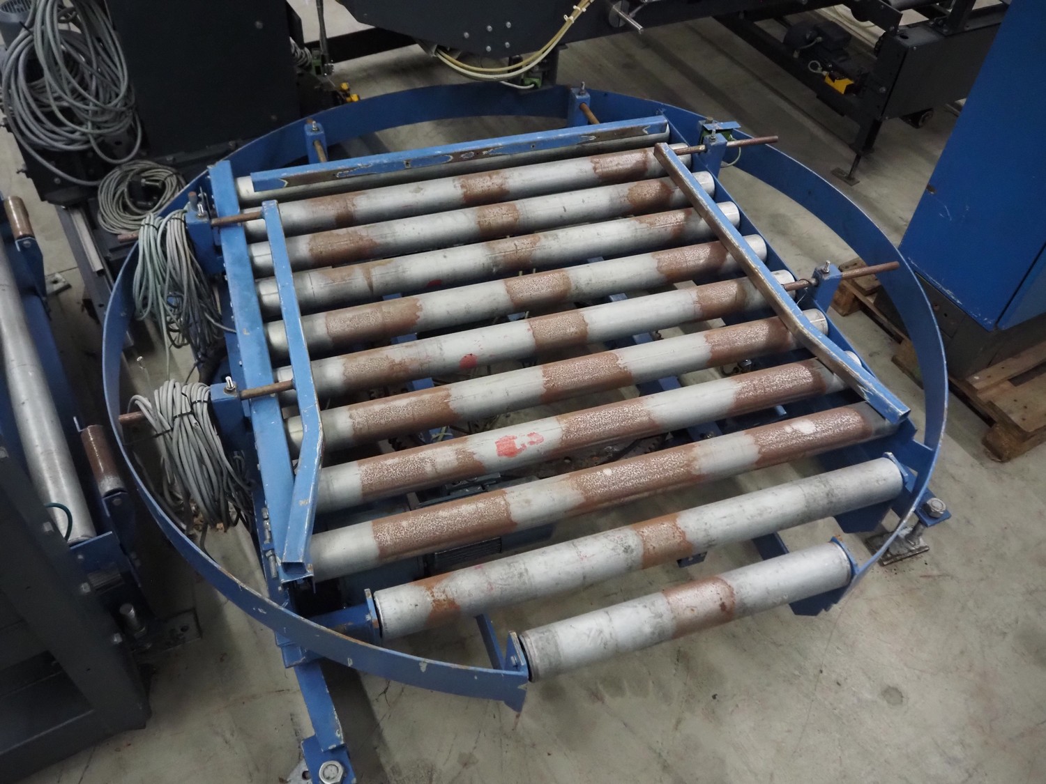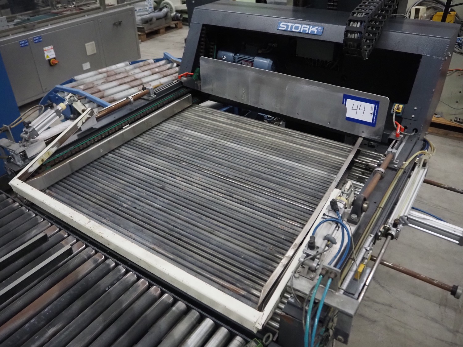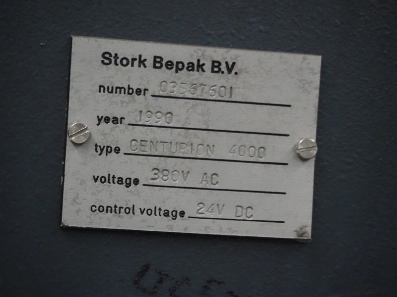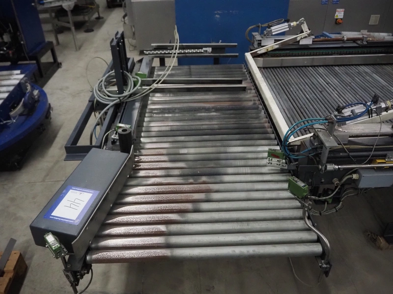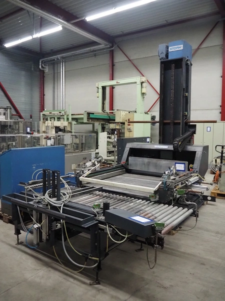 Stork Bepak B.V. palletizer consisting of roller conveyor, steel roller, roller width: 920 mm, dimensions roller conveyor: 2700 mm x 1250 mm x 1170 mm, Stork Bepak B.V. pallet loader, type: Centurion 4000, number: 03567601, year of construction: 1990, 380 V AC, 24 V DC, steel rollers, roller width: 1380 mm, dimensions pallet loader: 2900 mm x 2200 mm x 3400 mm, pallet turning device, steel rollers, roller width: 1300 mm, 1100 mm, 650 mm, dimensions turning device: 2000 mm x 1950 mm x 600 mm, pallet stacking machine, steel rollers, roller width: 1300 mm, dimensions stacking machine: 2100 mm x 1700 mm x 1400 mm and switch cabinet, dimensions: 1200 mm x 480 mm x 1160 mm.