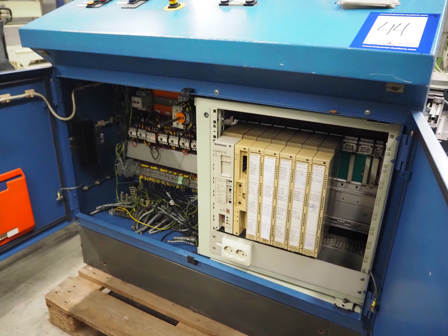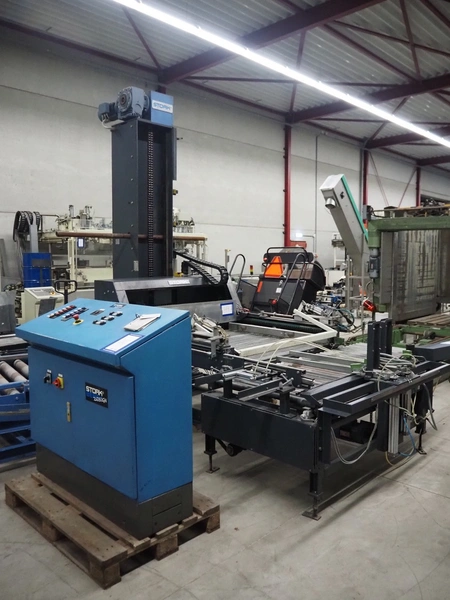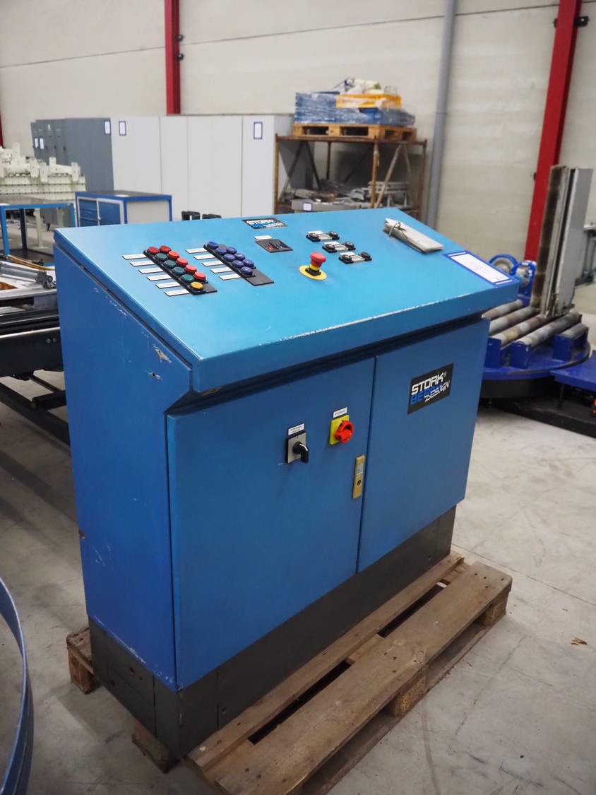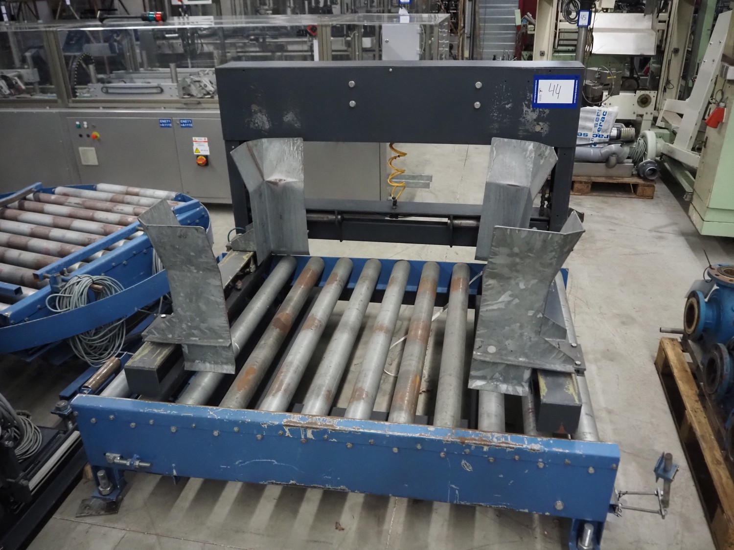 Stork Bepak B.V. palletizer consisting of roller conveyor, steel roller, roller width: 920 mm, dimensions roller conveyor: 2700 mm x 1250 mm x 1170 mm, Stork Bepak B.V. pallet loader, type: Centurion 4000, number: 03567601, year of construction: 1990, 380 V AC, 24 V DC, steel rollers, roller width: 1380 mm, dimensions pallet loader: 2900 mm x 2200 mm x 3400 mm, pallet turning device, steel rollers, roller width: 1300 mm, 1100 mm, 650 mm, dimensions turning device: 2000 mm x 1950 mm x 600 mm, pallet stacking machine, steel rollers, roller width: 1300 mm, dimensions stacking machine: 2100 mm x 1700 mm x 1400 mm and switch cabinet, dimensions: 1200 mm x 480 mm x 1160 mm.