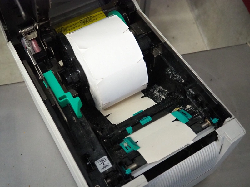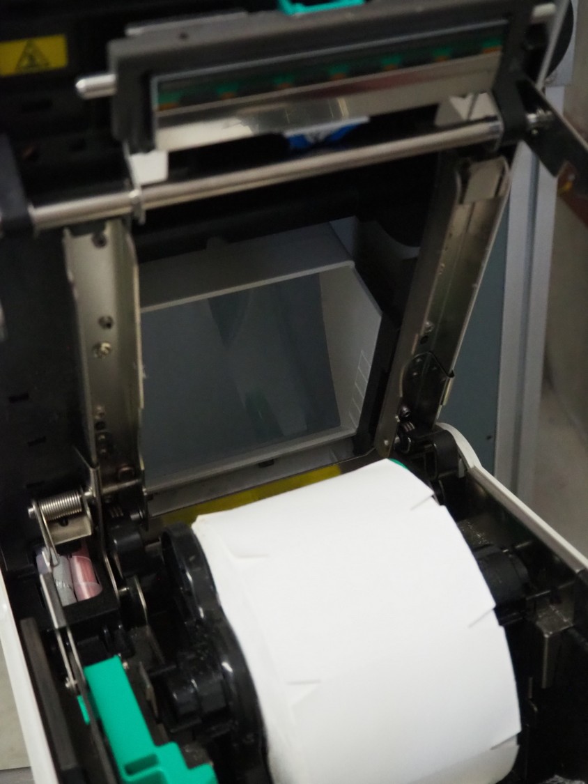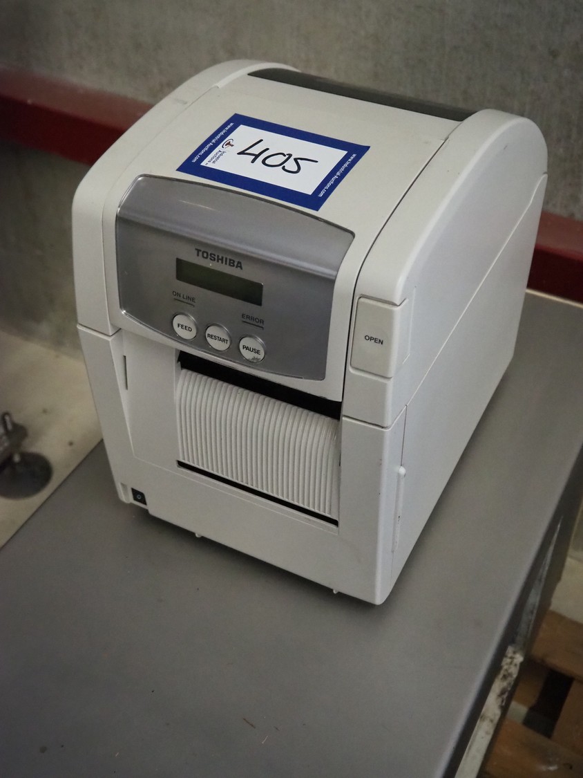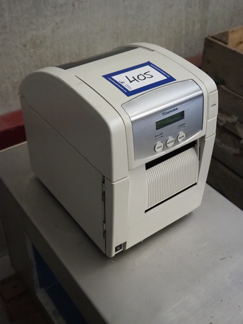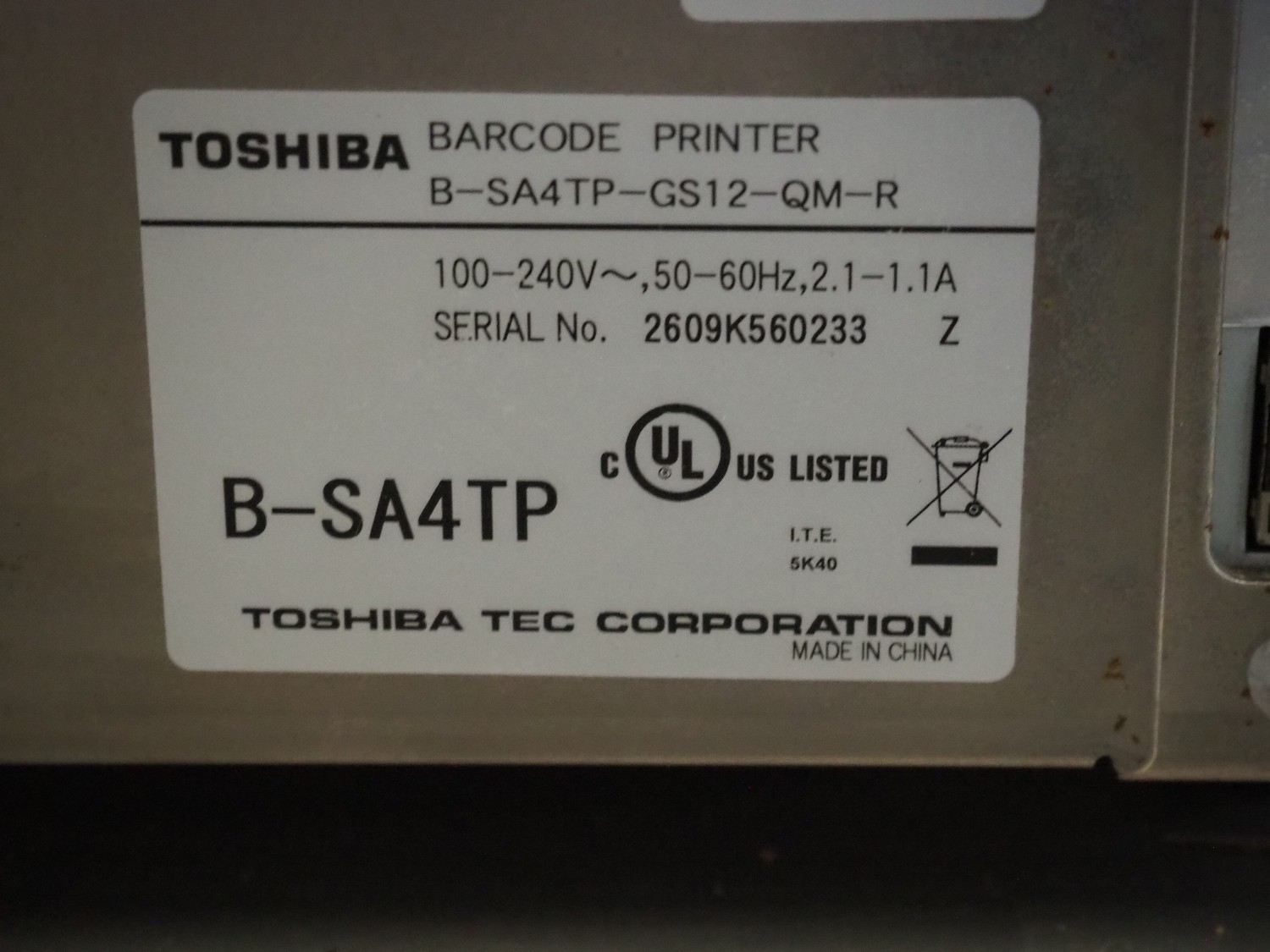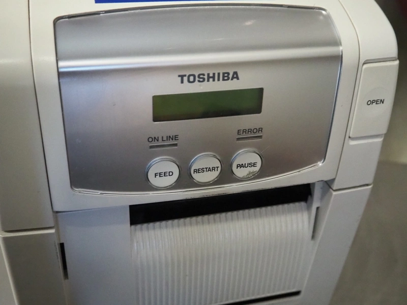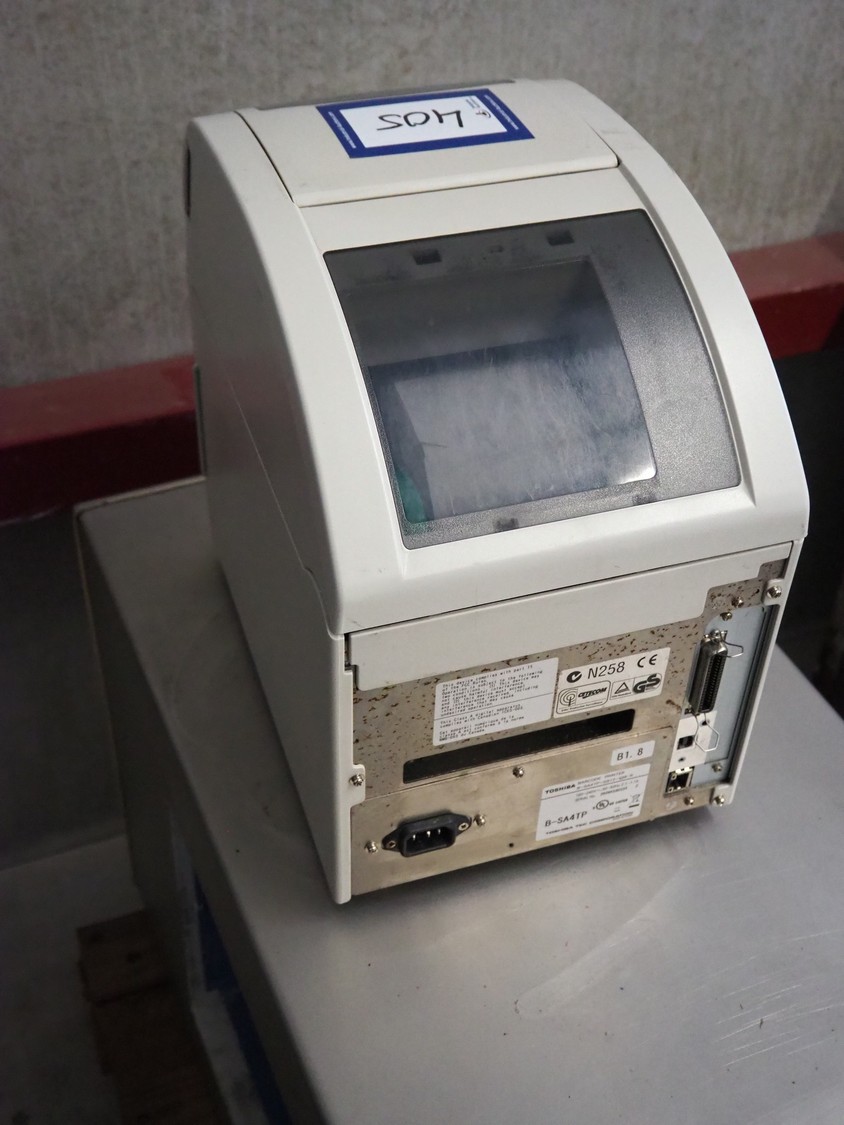 Toshiba label printer, model: B-SA4TP, serial number: 2609K560233, 100-240 V, 50-60 Hz, 2.1-1.1 A, label width: 105 mm, total dimensions: 340 mm x 240 mm x 330 mm.