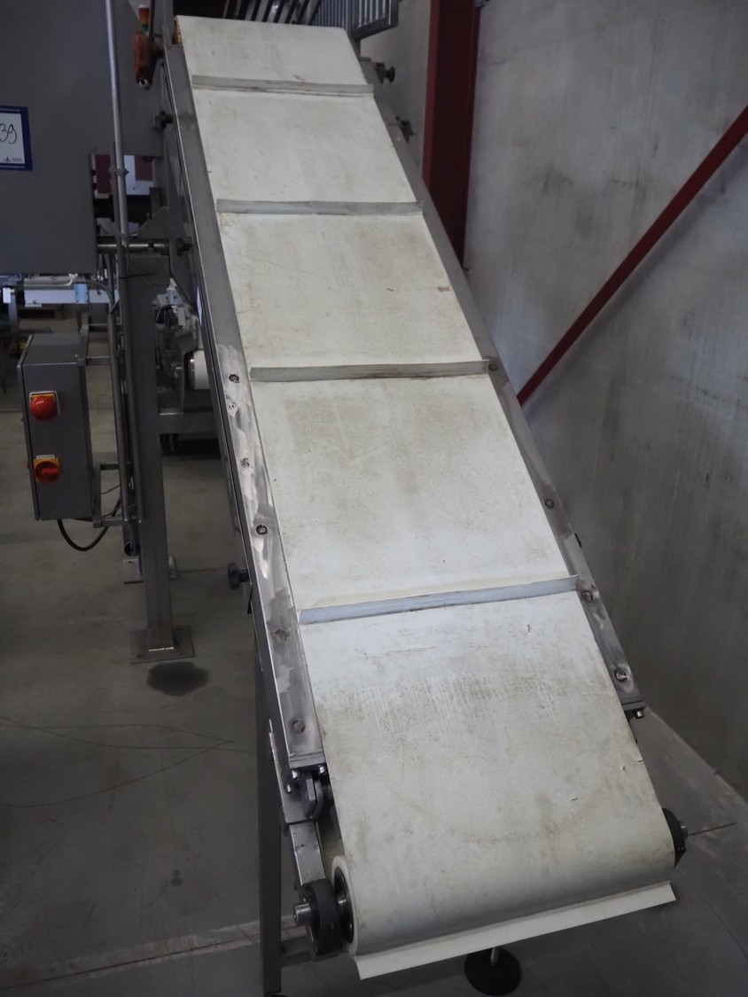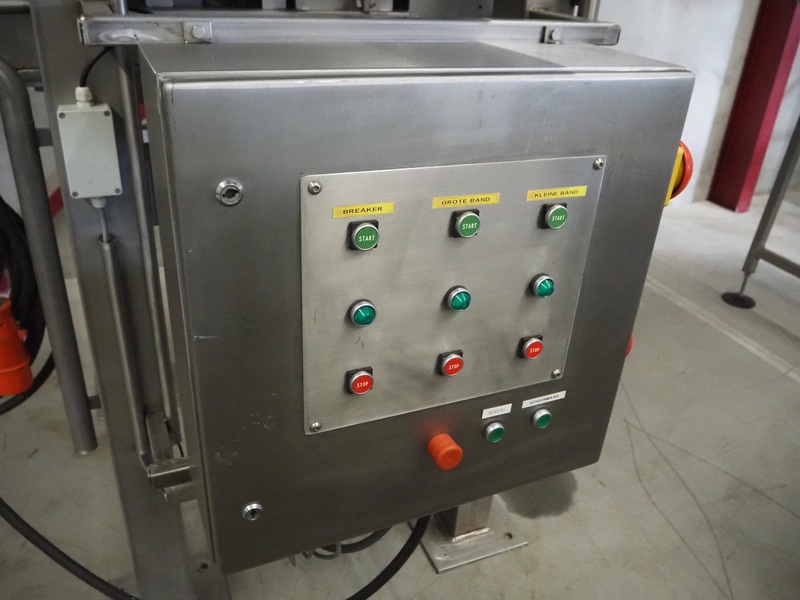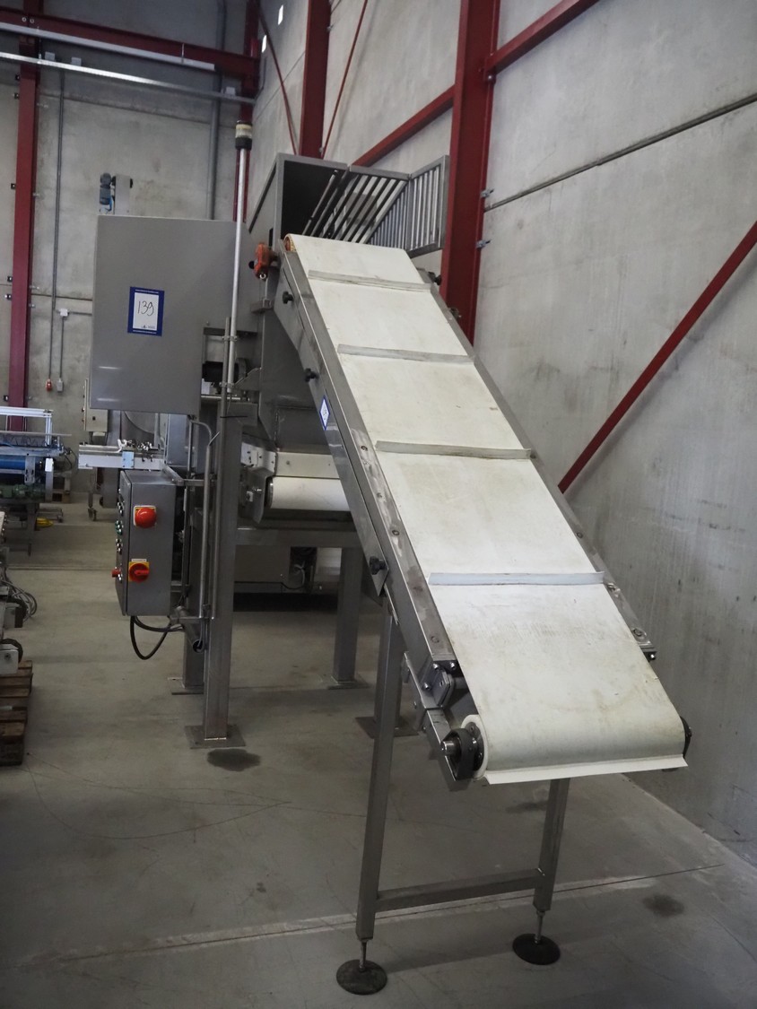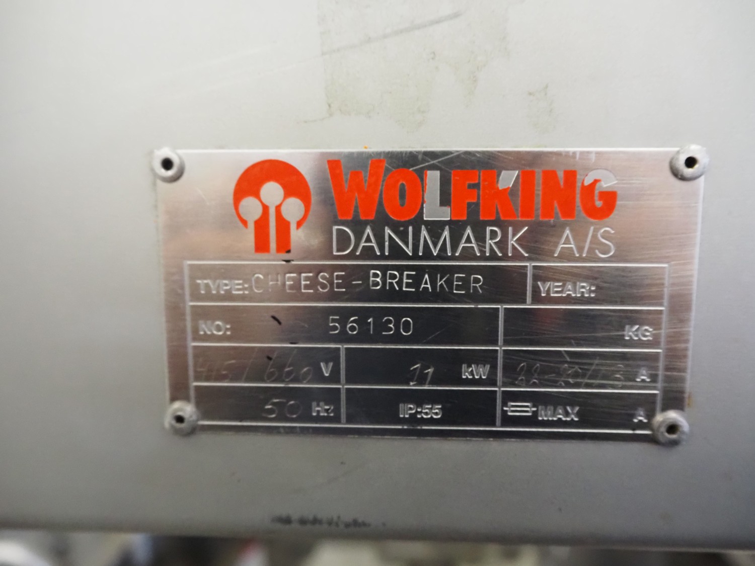 Wolfking A/S cheese-breaker, type: CHEESE-BREAKER, number: 56130, 415/660 V, 50 Hz, 22-20/13 A, 11 kW, width outfeed belt: 500 mm, including elevating belt with dividers, belt width: 500 mm, divider height: 30 mm, distance between dividers: 520 mm, total dimensions: 3600 mm x 1500 mm x 3200 mm.