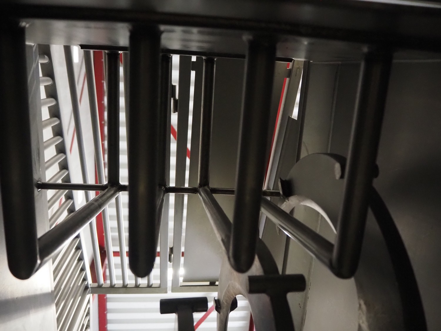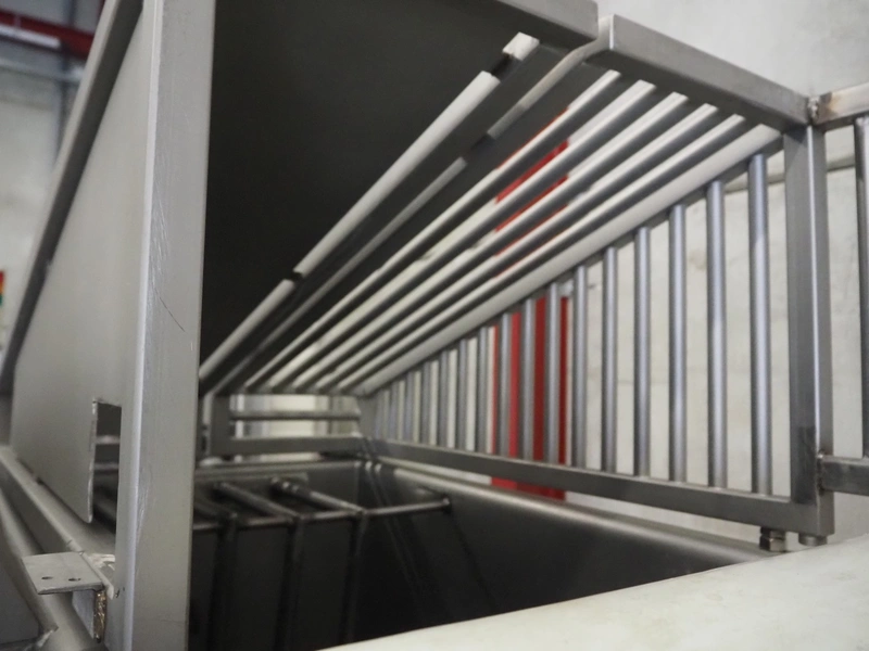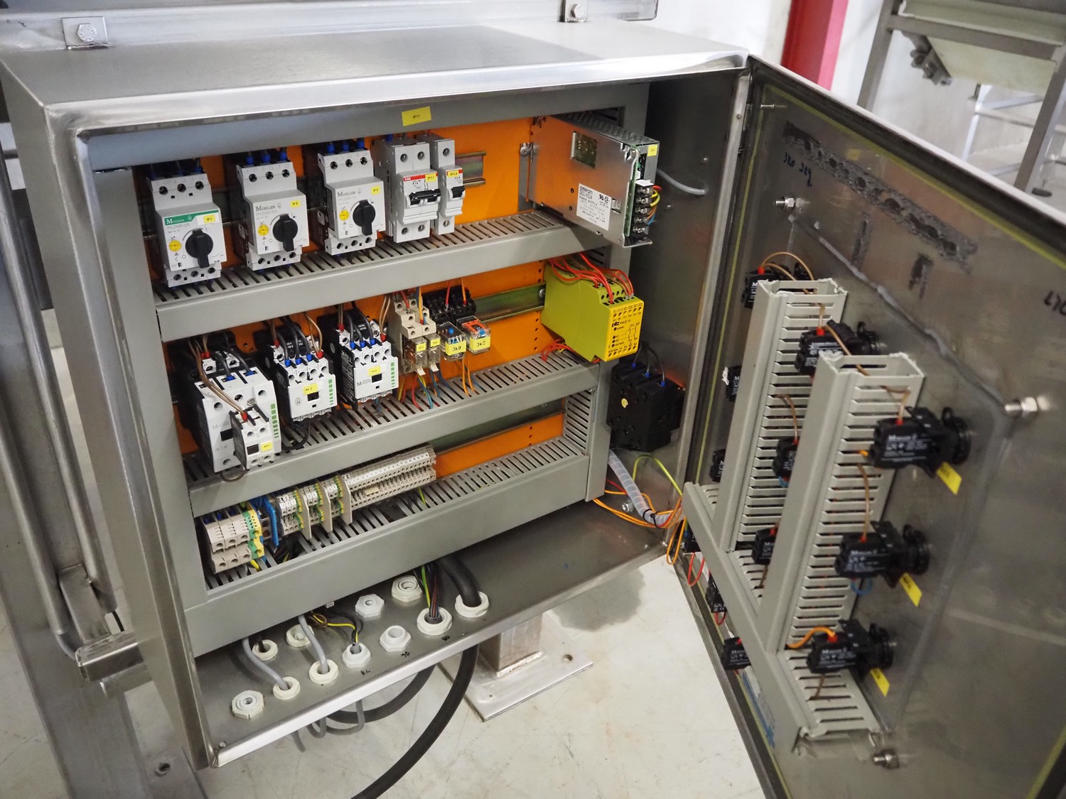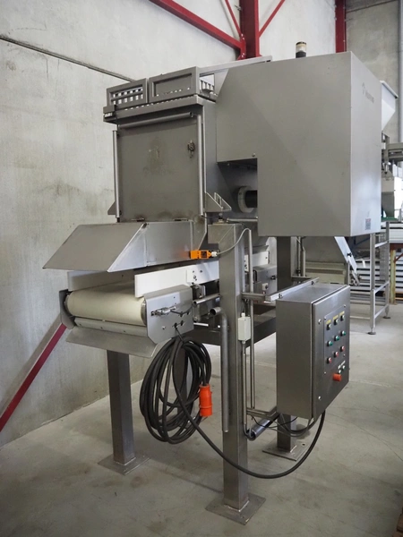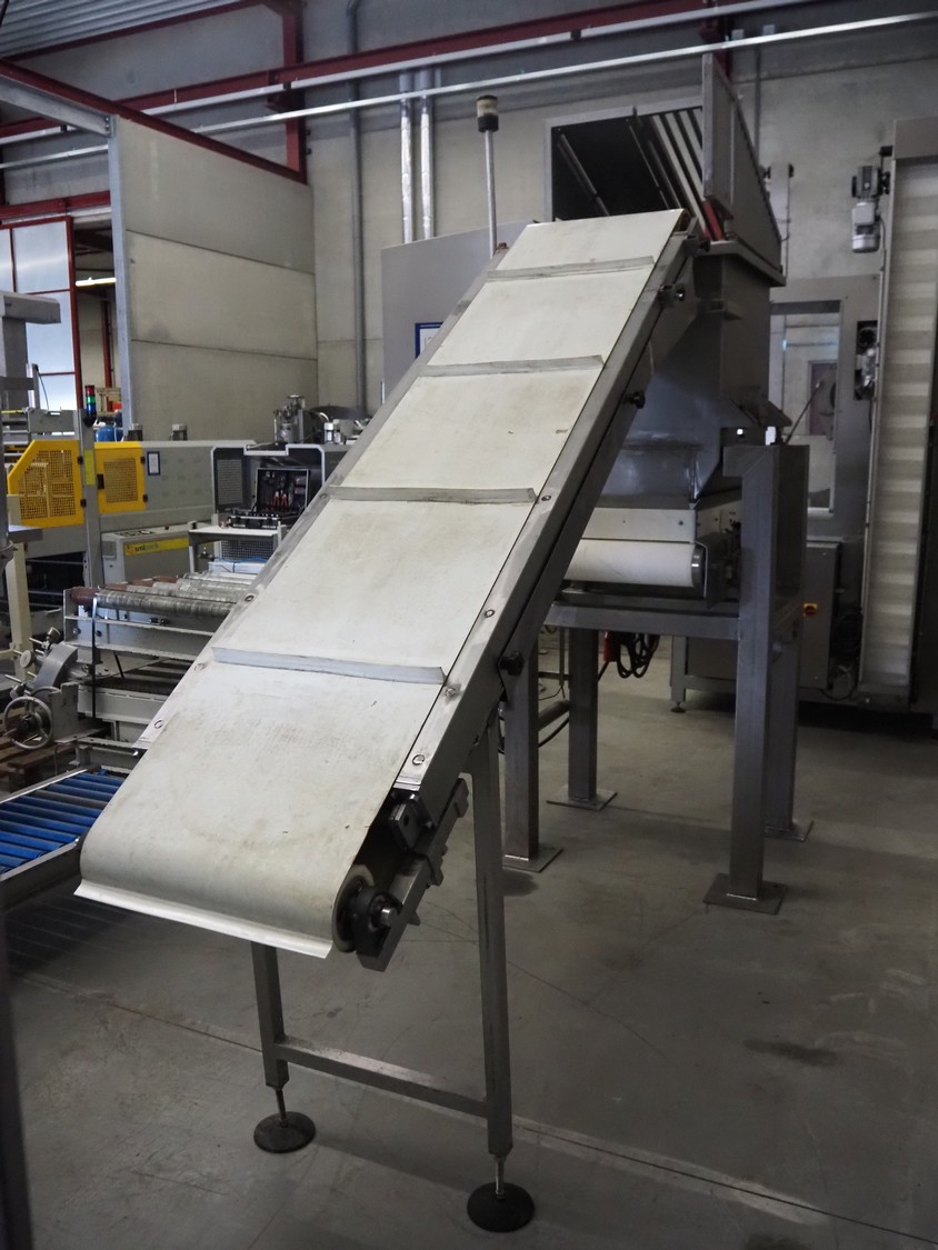 Wolfking A/S cheese-breaker, type: CHEESE-BREAKER, number: 56130, 415/660 V, 50 Hz, 22-20/13 A, 11 kW, width outfeed belt: 500 mm, including elevating belt with dividers, belt width: 500 mm, divider height: 30 mm, distance between dividers: 520 mm, total dimensions: 3600 mm x 1500 mm x 3200 mm.