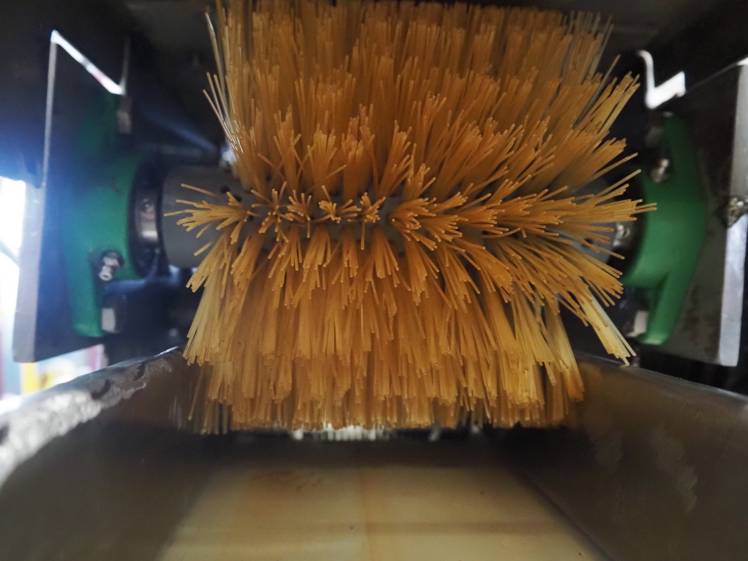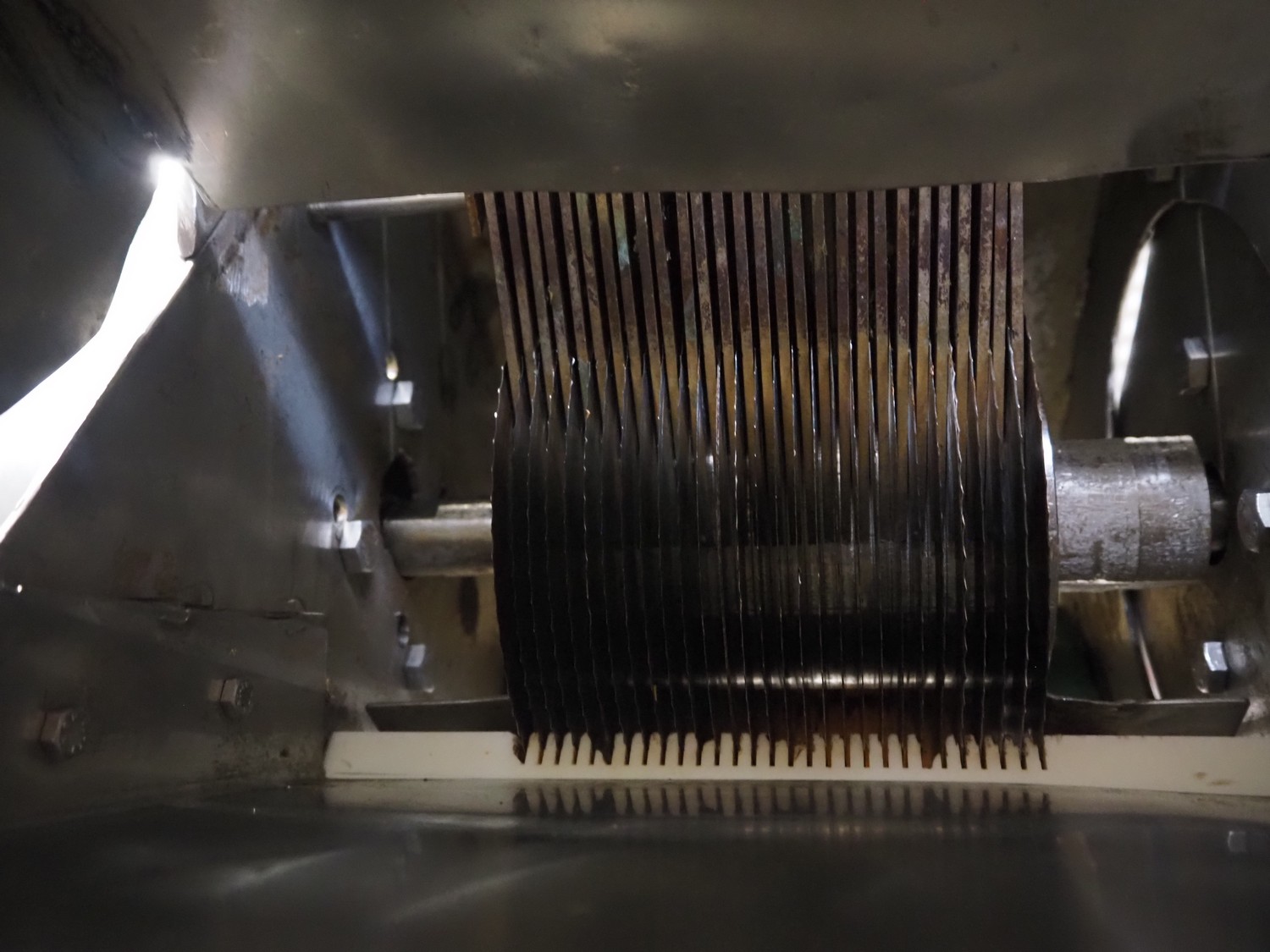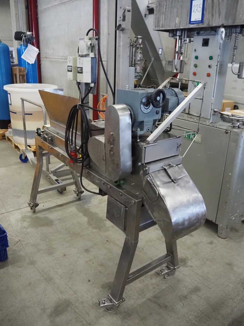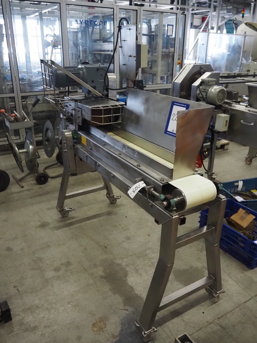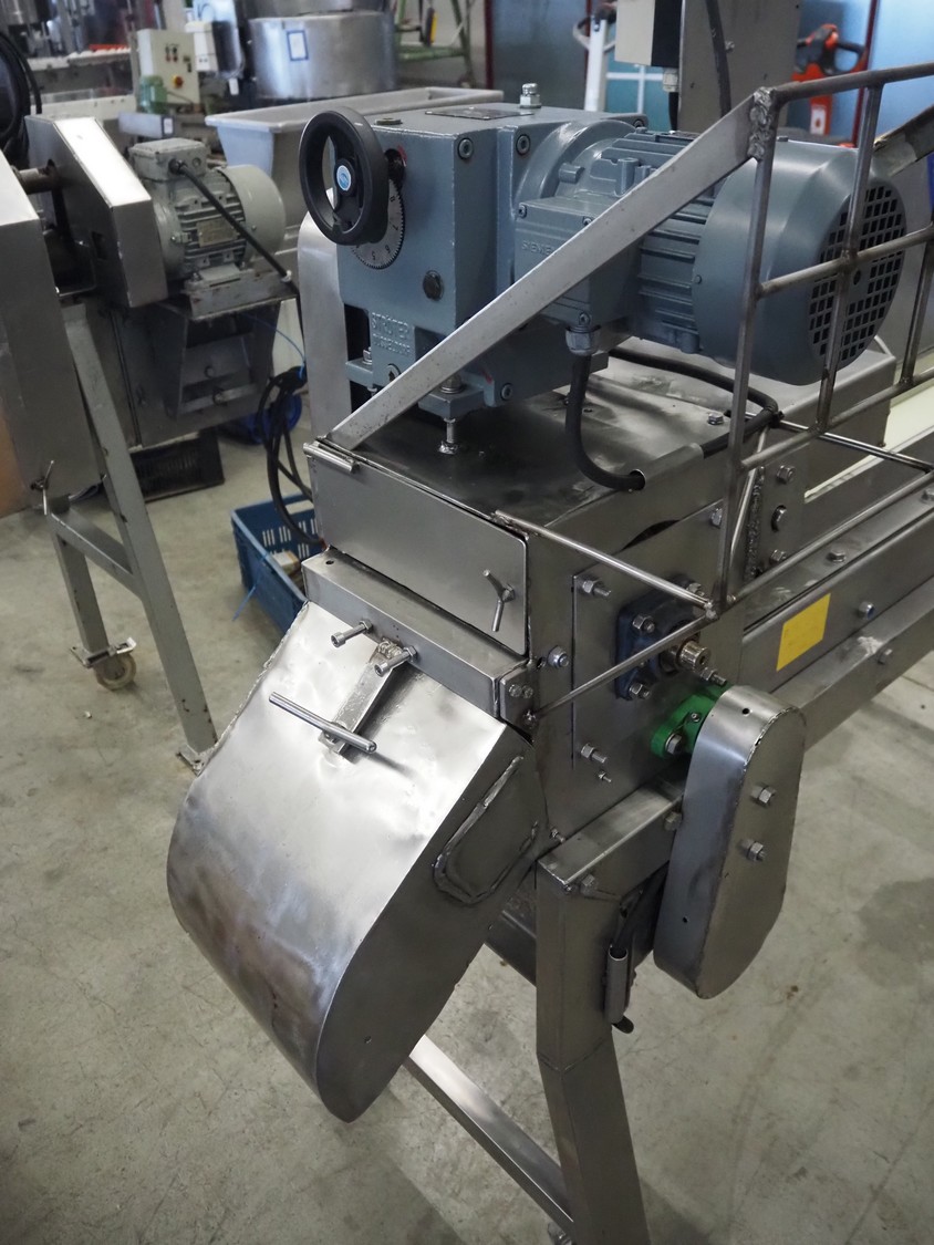 Mobile strip cutter, working width: 150 mm, distance between knives: 5 mm, plastic belt, belt width: 150 mm, total dimensions: 1800 mm x 700 mm x 1700 mm. Including crate with knives.
