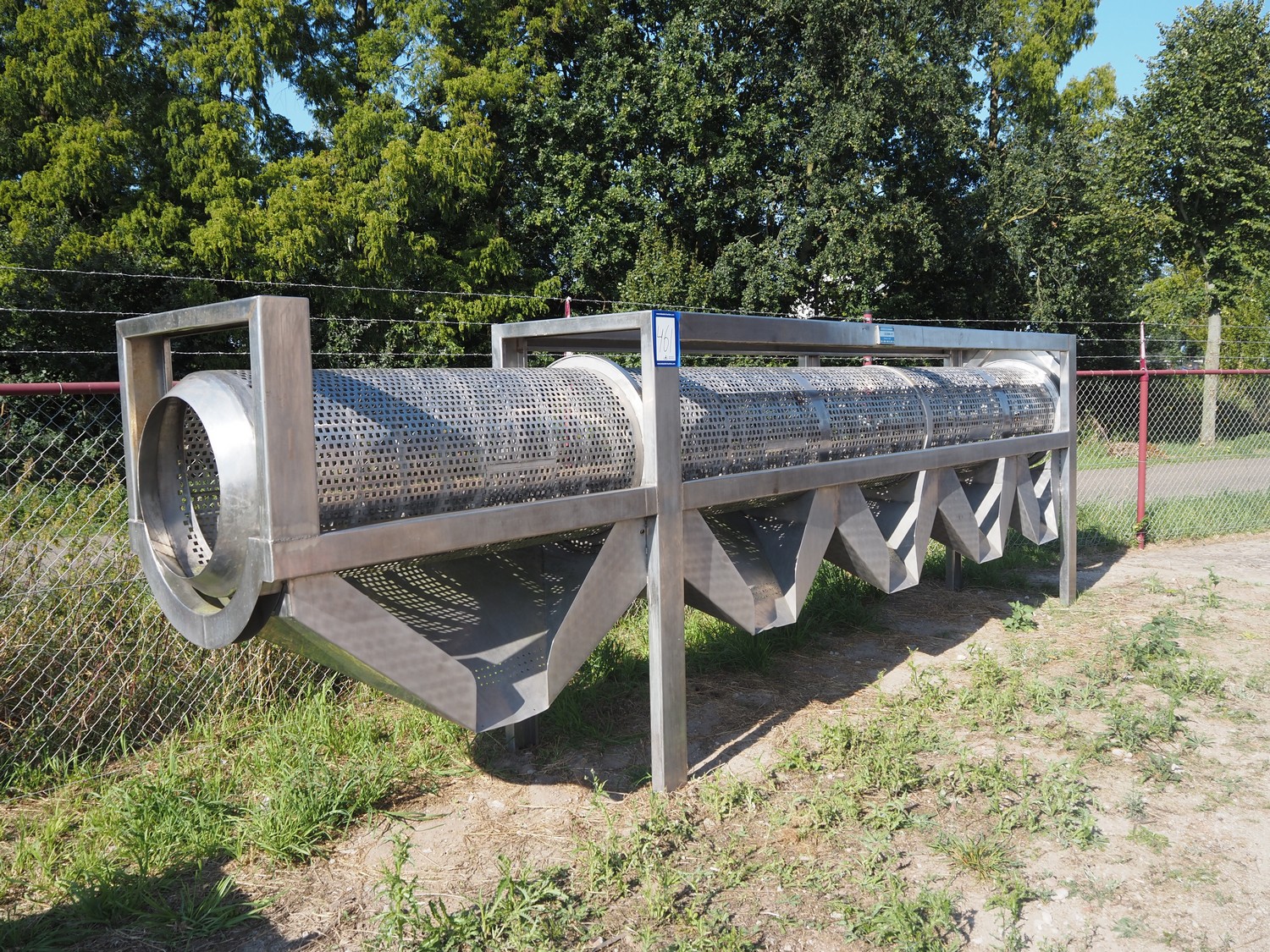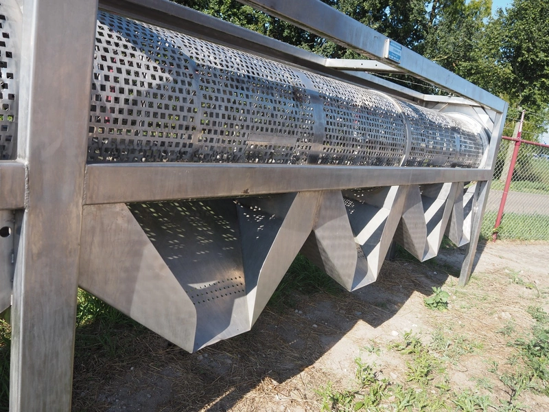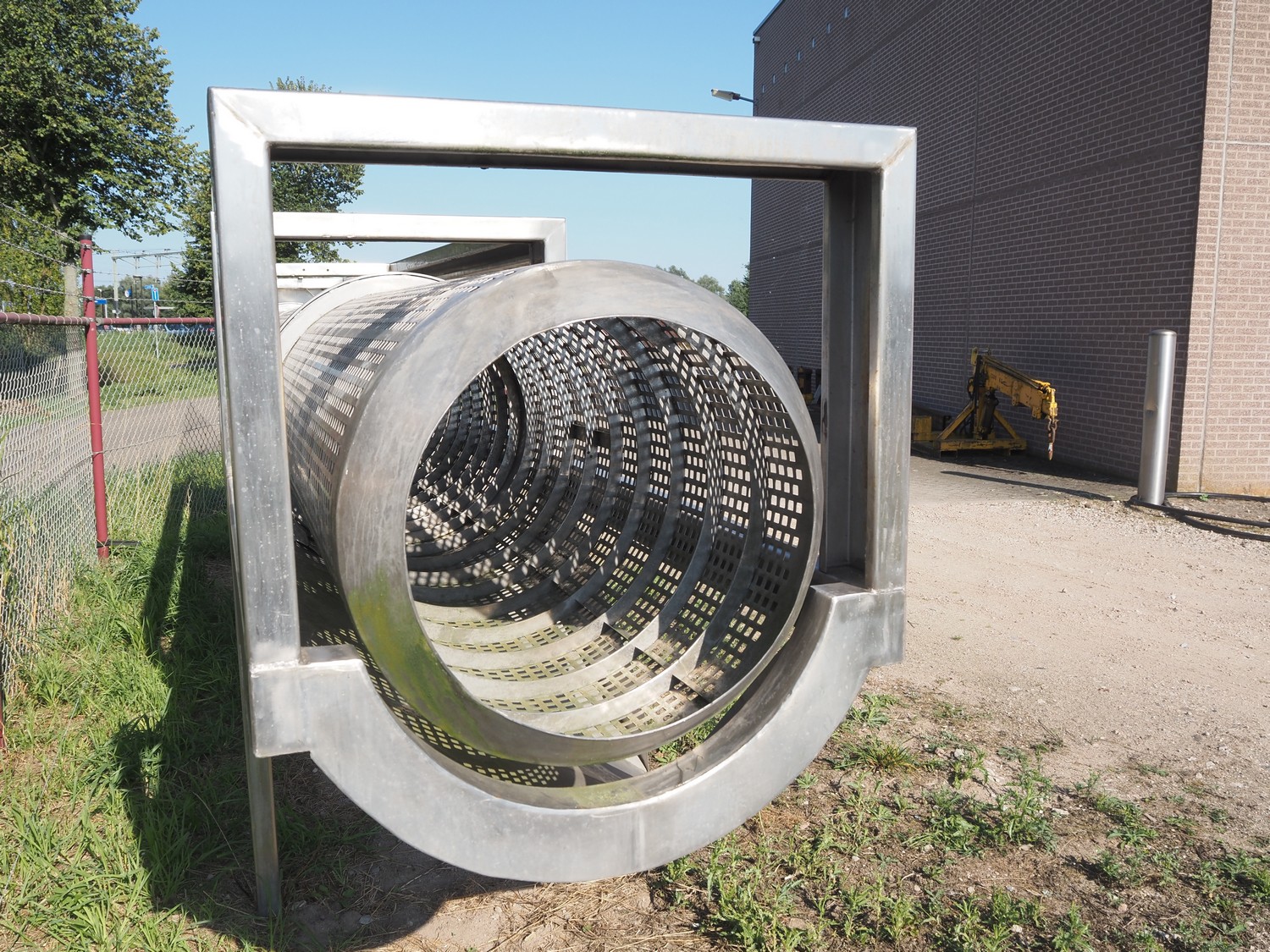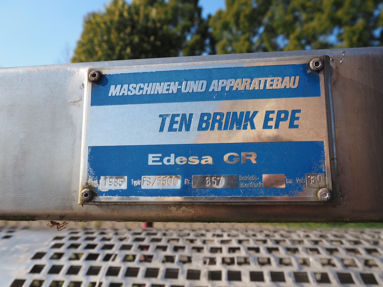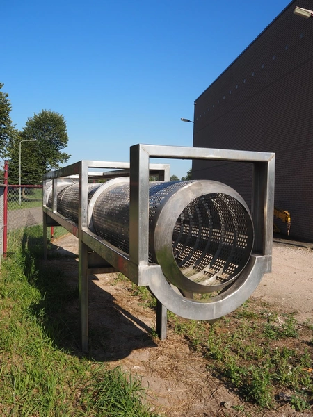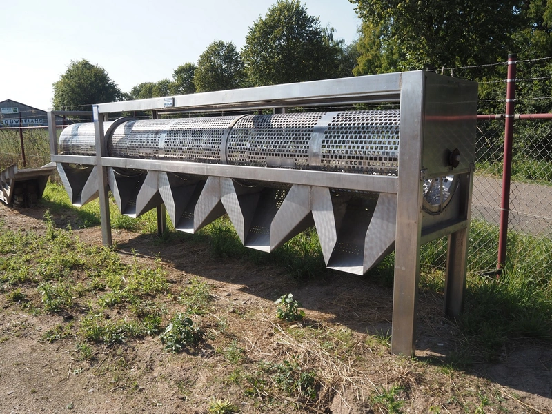 Ten Brink Epe s/s sorting drum with 5 outfeed stations, type: FS/5500, number: 857, year of construction: 1985, 380 V, drum diameter: Ø 640 mm, perforations: 10 mm x 10 mm, total dimensions: 7000 mm x 900 mm x 1170 mm.