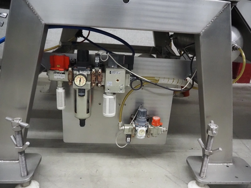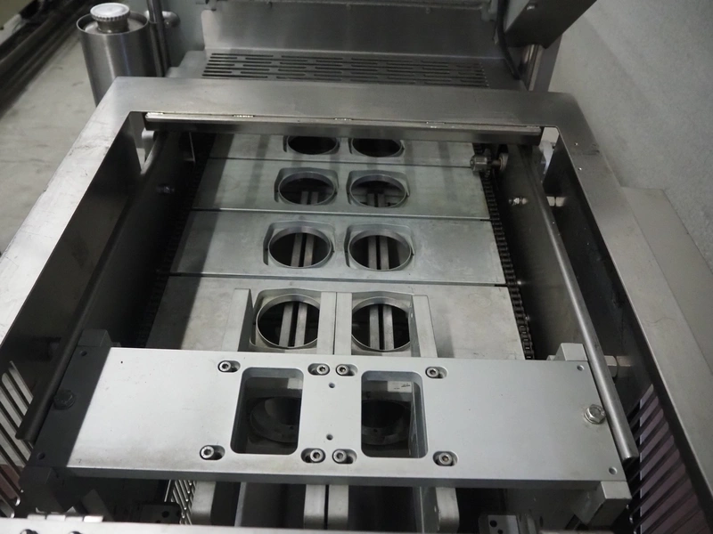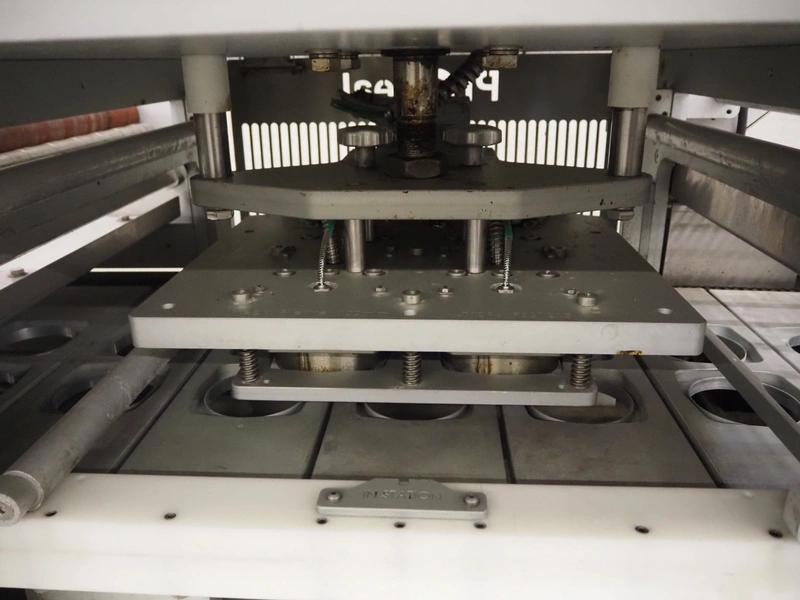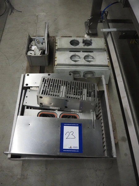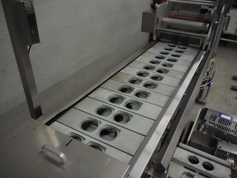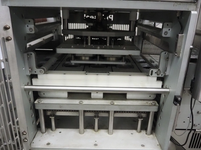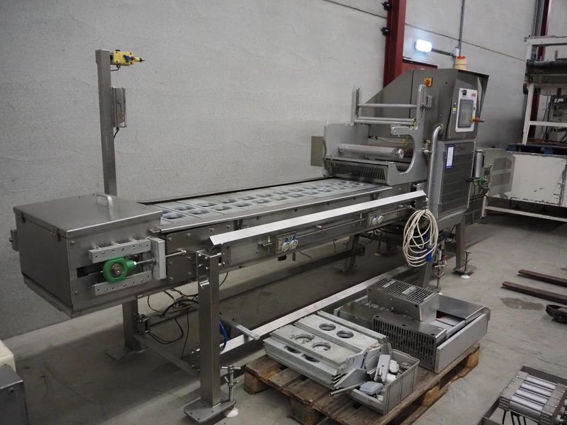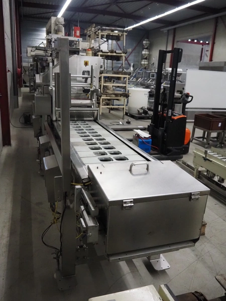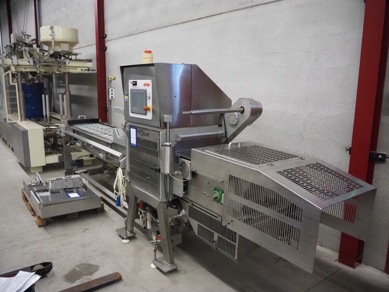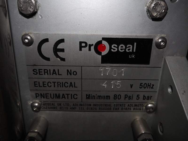 Proseal traysealer, model: AP60, serial number: 1701, 415 V, 50 Hz, 2 lane dyes, inside dimensions dye: Ø 95 mm, outside dimensions dye: 115 mm x 115 mm, total dimensions: 4300 mm x 1000 mm x 1950 mm. Including pallet with spare parts.