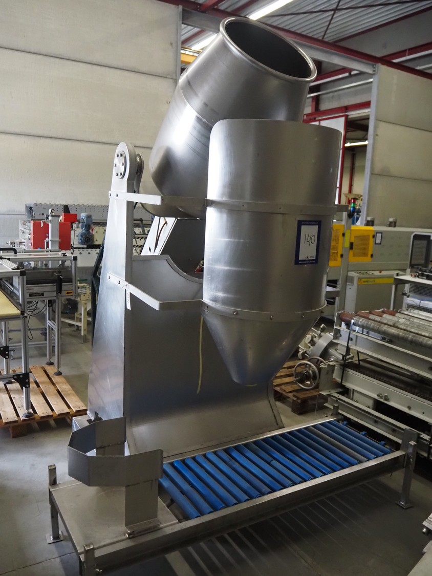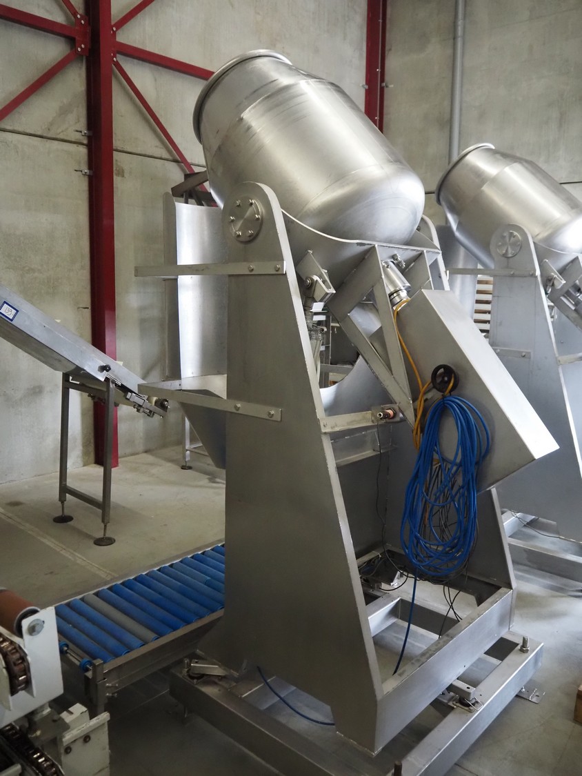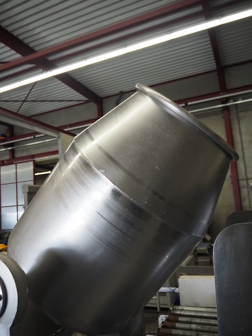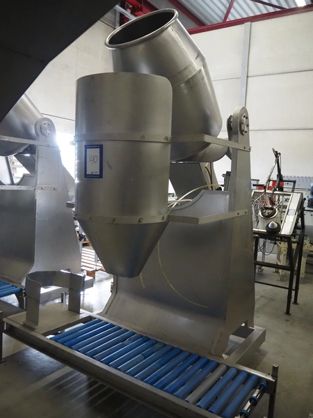 S/s tumbler on weighing cells with outfeed roller conveyor, dimensions mixer: 800 mm x 1250 mm x 2650 mm, roller conveyor, steel frame, plastic rollers, roller width: 500 mm, dimensions roller conveyor: 2070 mm x 720 mm x 400 mm. Without indicator.