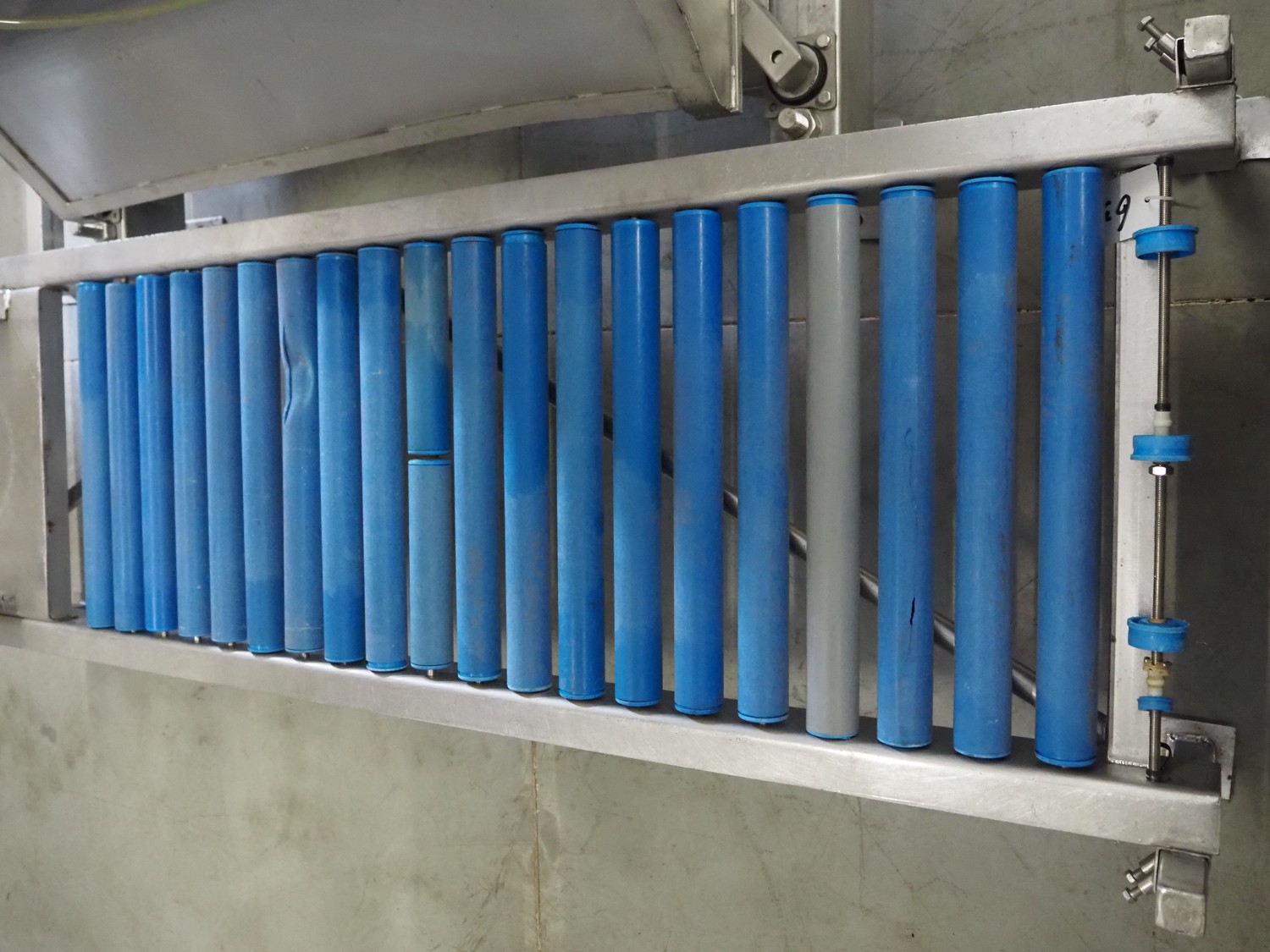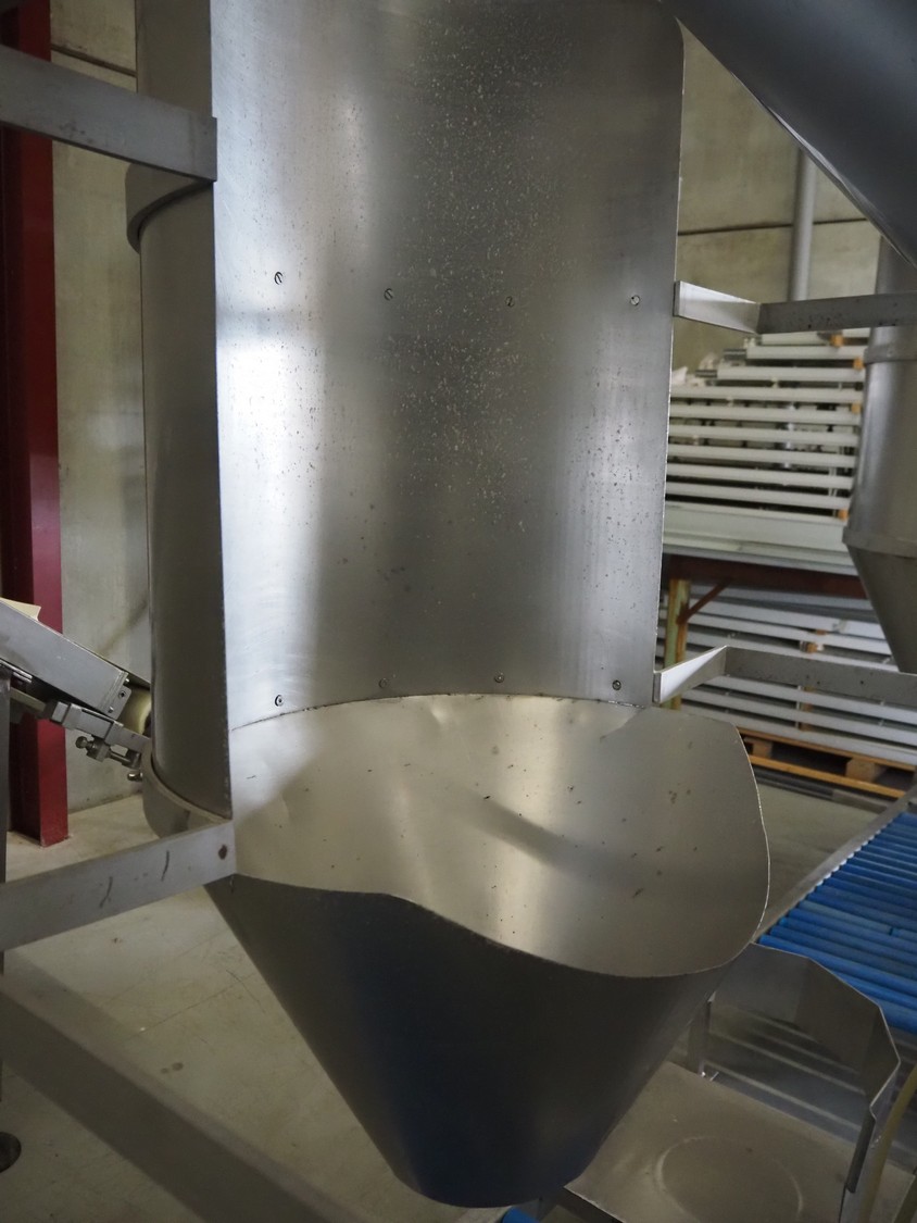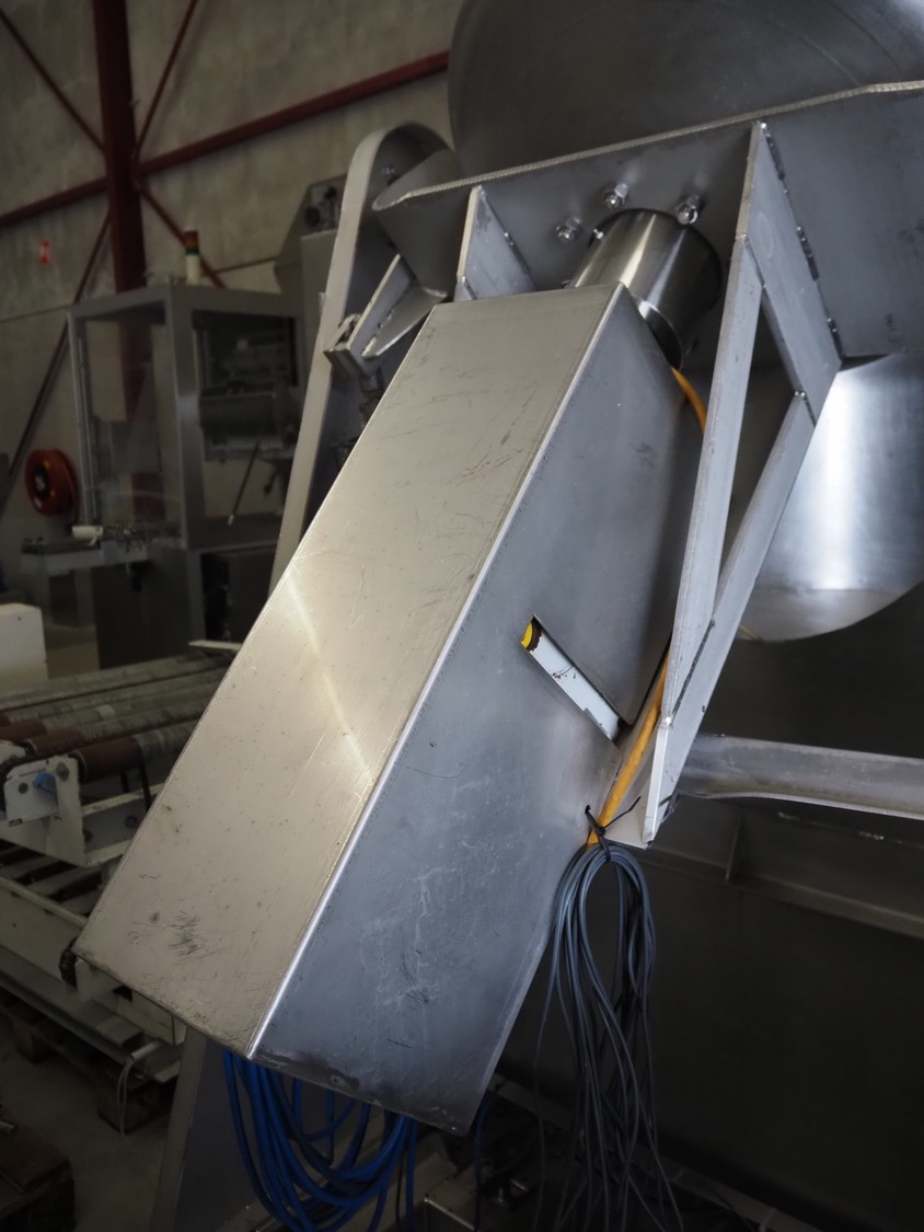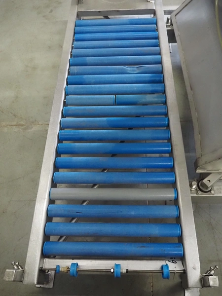 S/s tumbler on weighing cells with outfeed roller conveyor, dimensions mixer: 800 mm x 1250 mm x 2650 mm, roller conveyor, steel frame, plastic rollers, roller width: 500 mm, dimensions roller conveyor: 2070 mm x 720 mm x 400 mm. Without indicator.