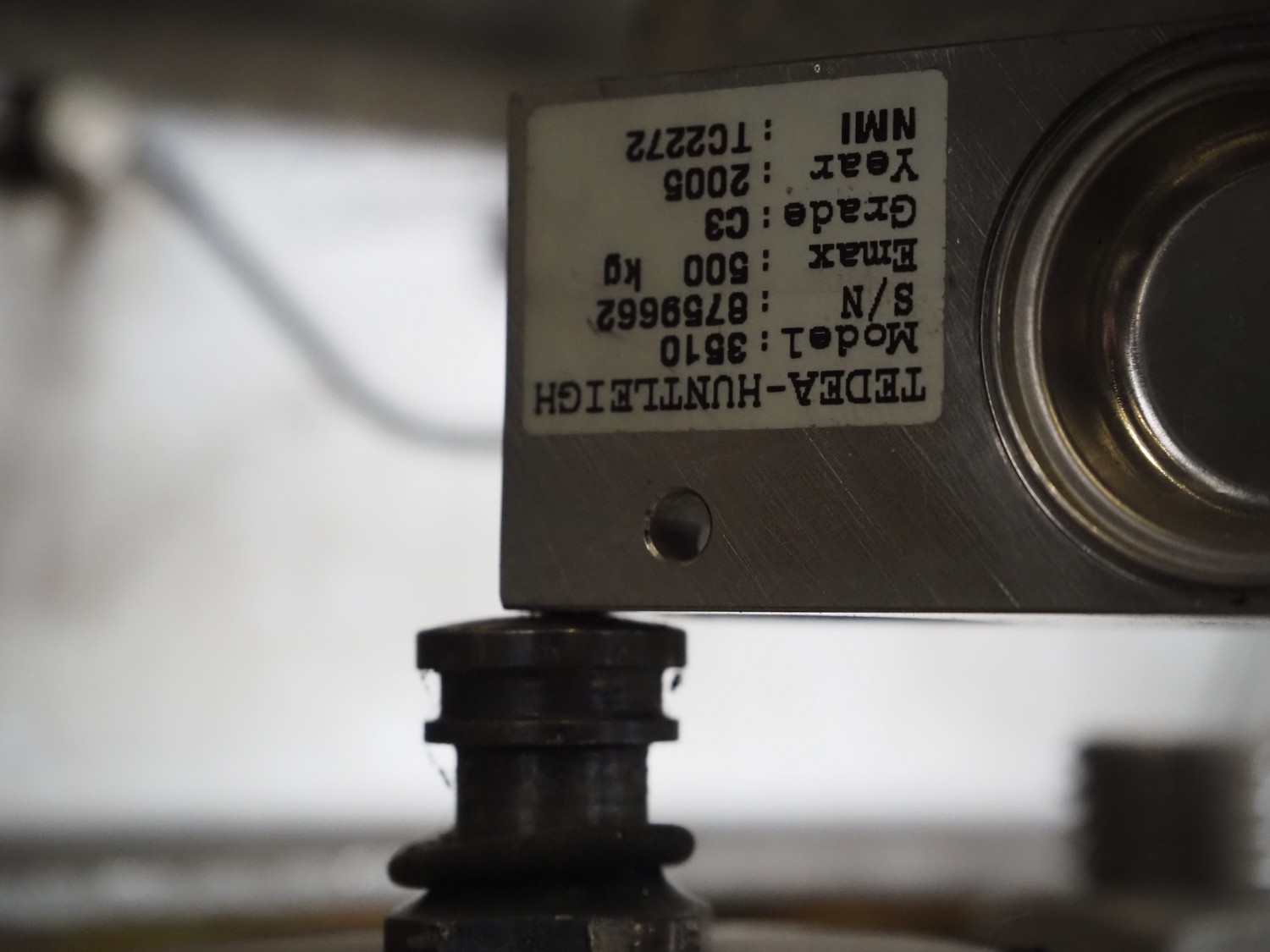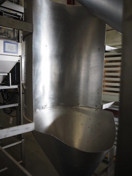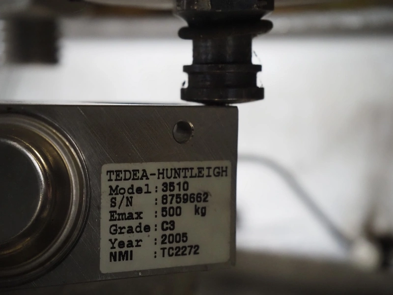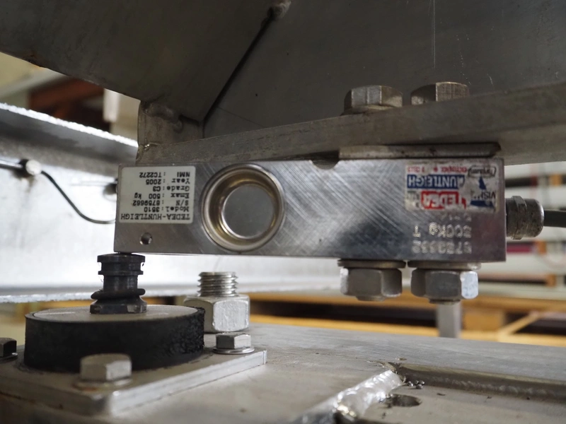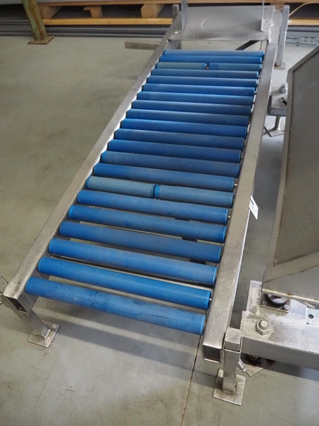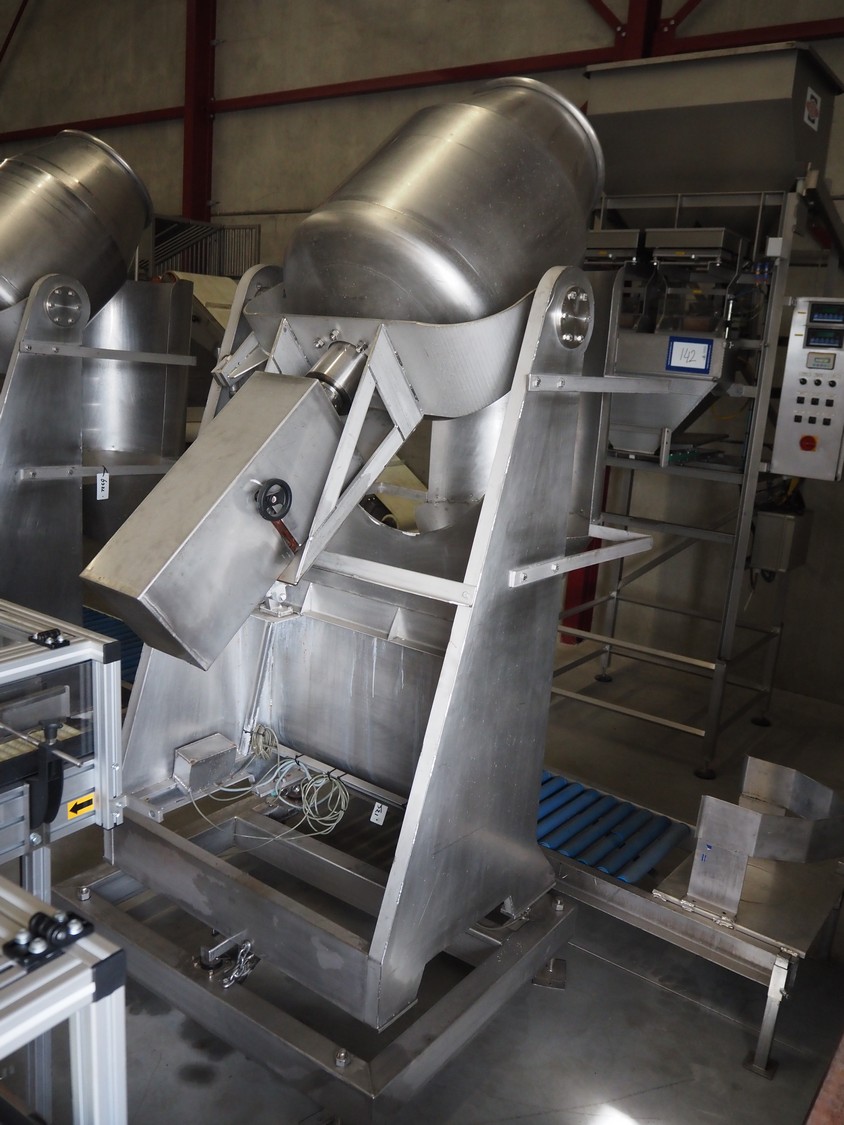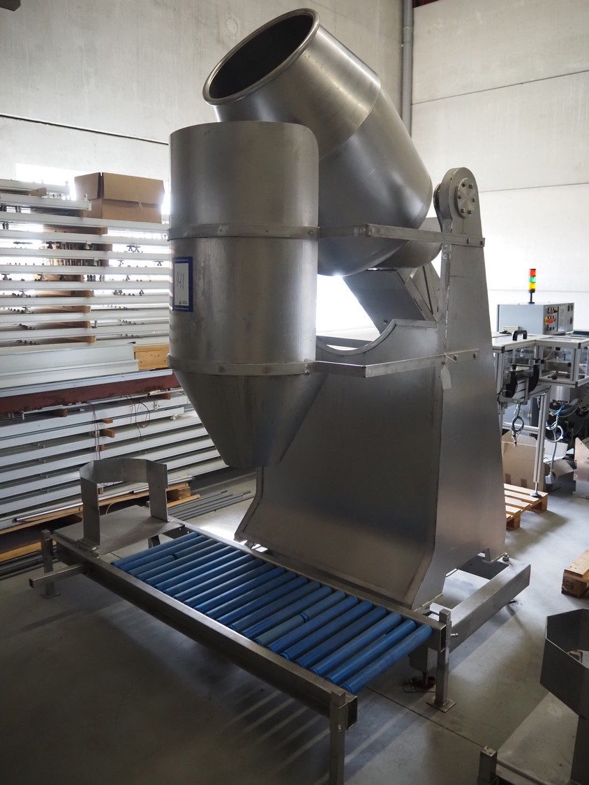 S/s tumbler on Tedea-Huntleigh weighing cells with outfeed roller conveyor, dimensions mixer: 1800 mm x 1250 mm x 2650 mm, roller conveyor, steel frame, plastic rollers, roller width: 500 mm, dimensions roller conveyor: 2070 mm x 720 mm x 400 mm. Without indicator.